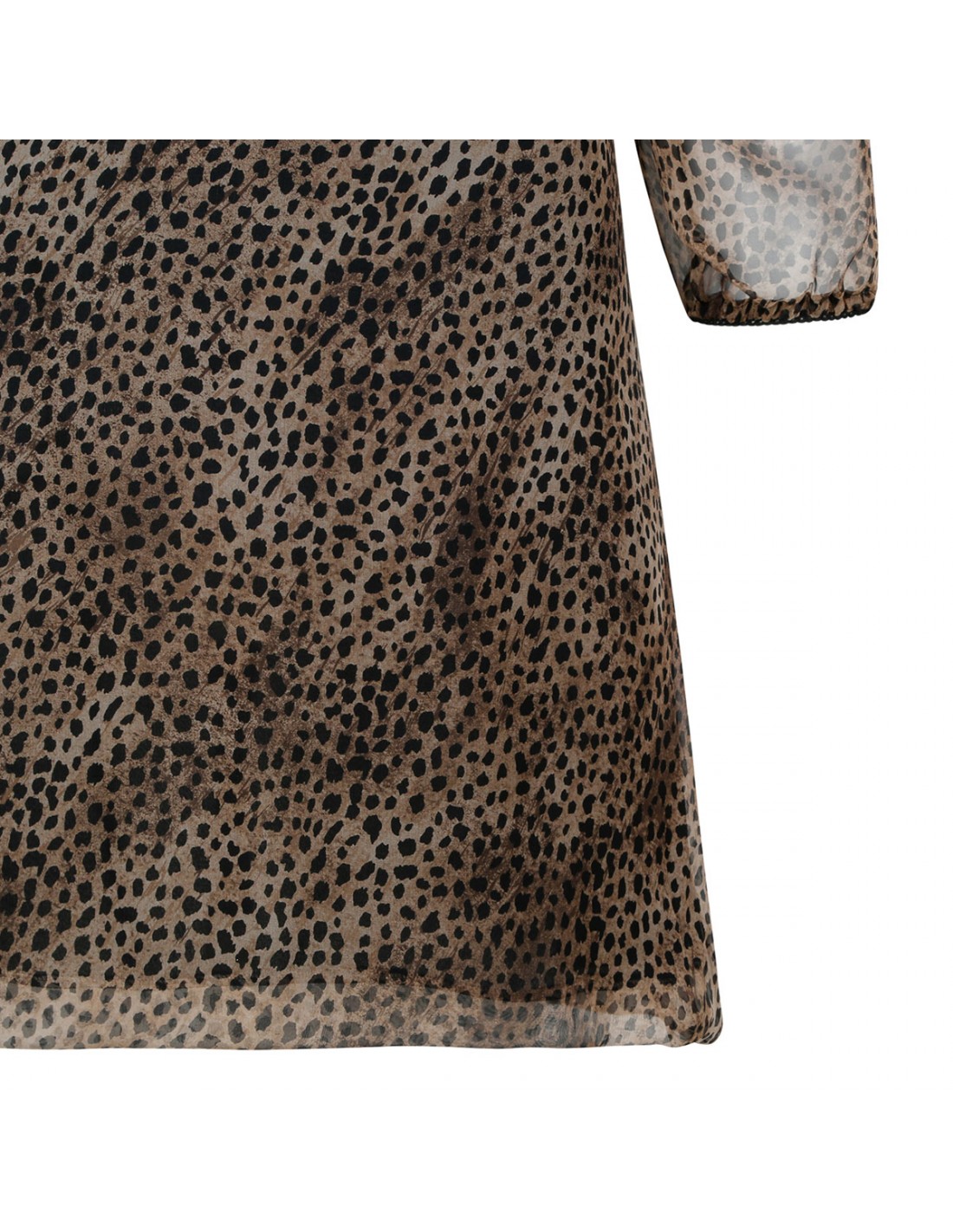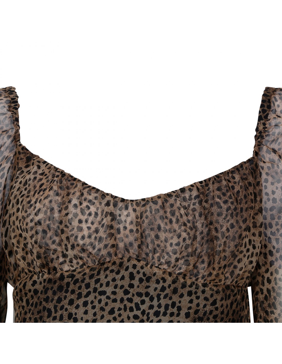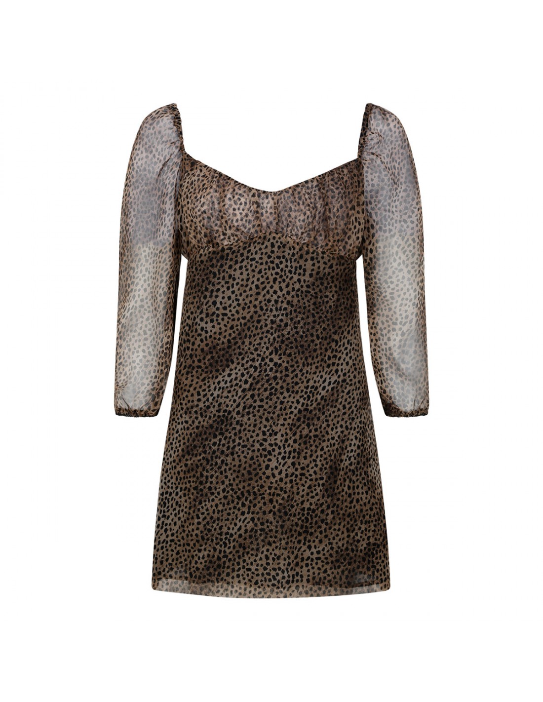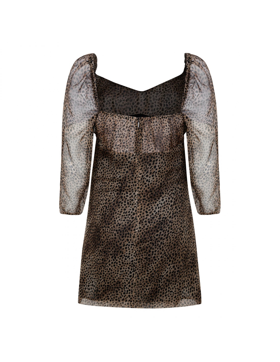 Brown and black silk mini dress from Saint Laurent featuring leopard motif printed allover, sheer sleeves with elastic shoulders, square back neck, zip fastening along back.