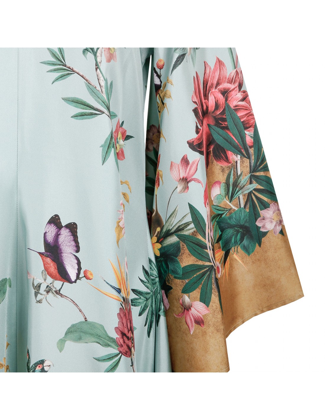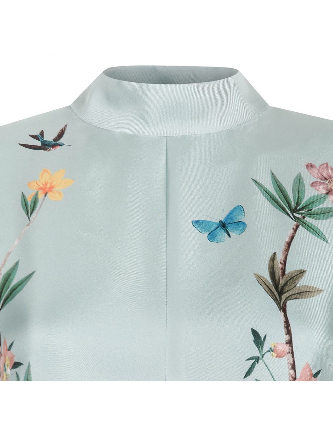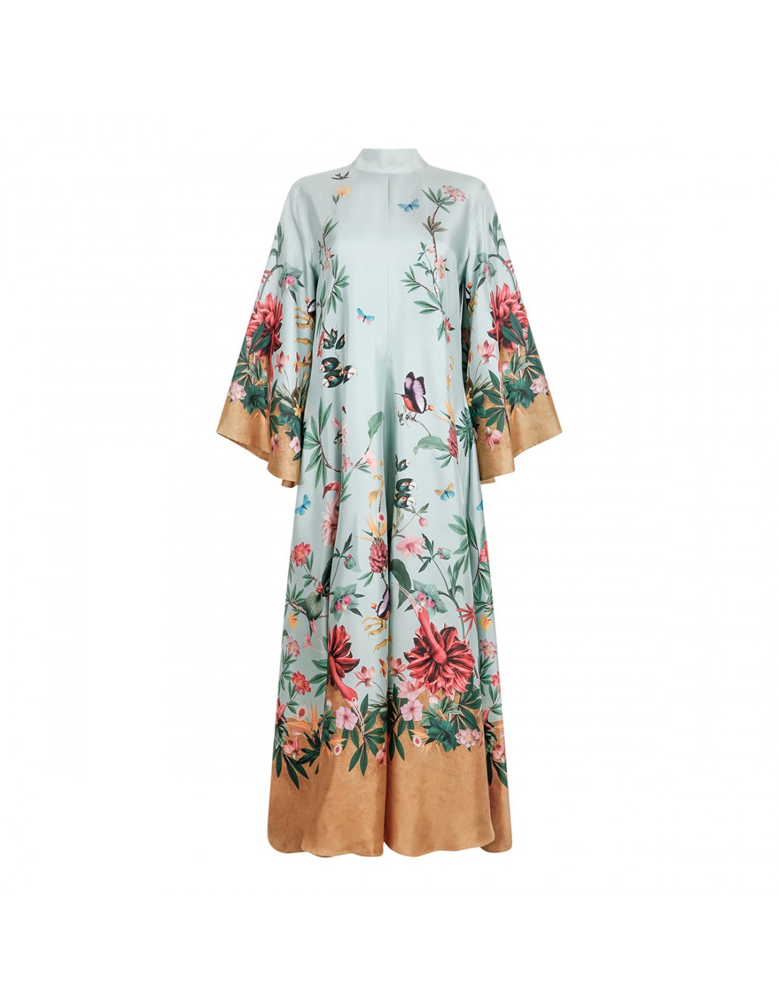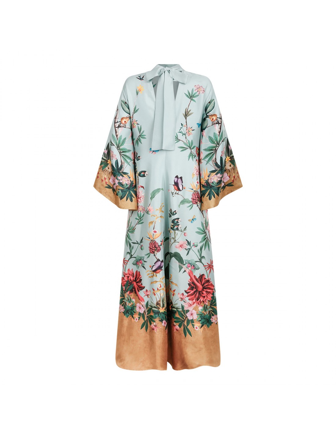 Aqua blue silk twill Magnifico dress from La Double J featuring stand collar, floral motif print, long sash at the back, draped waterfall sleeves.