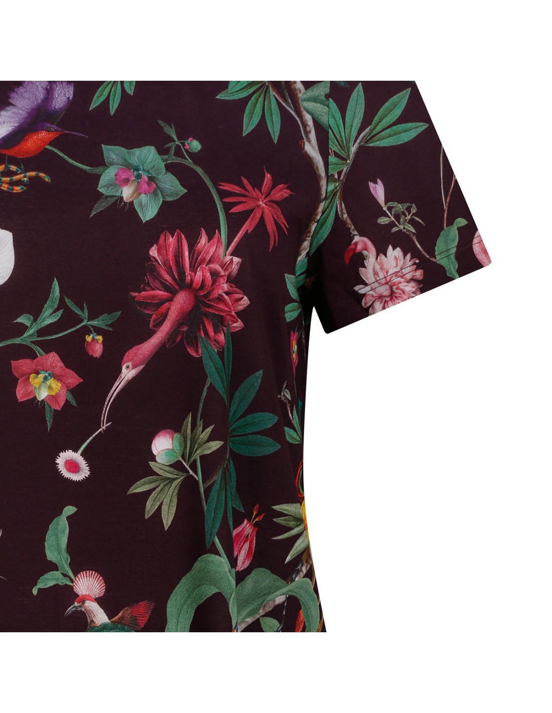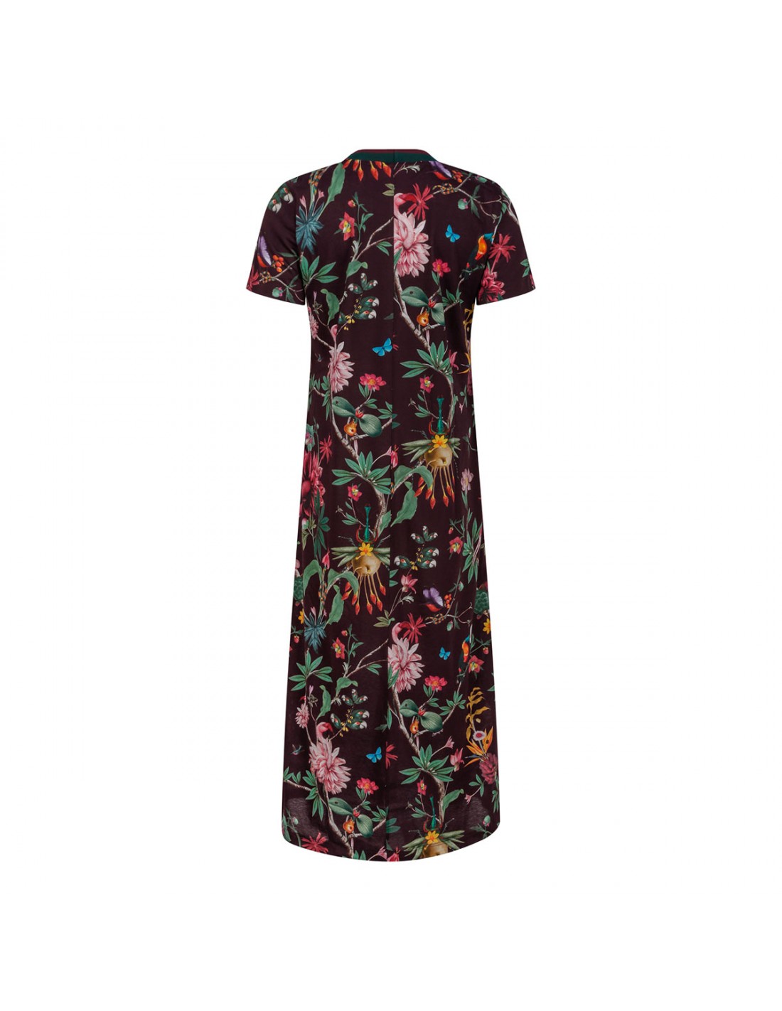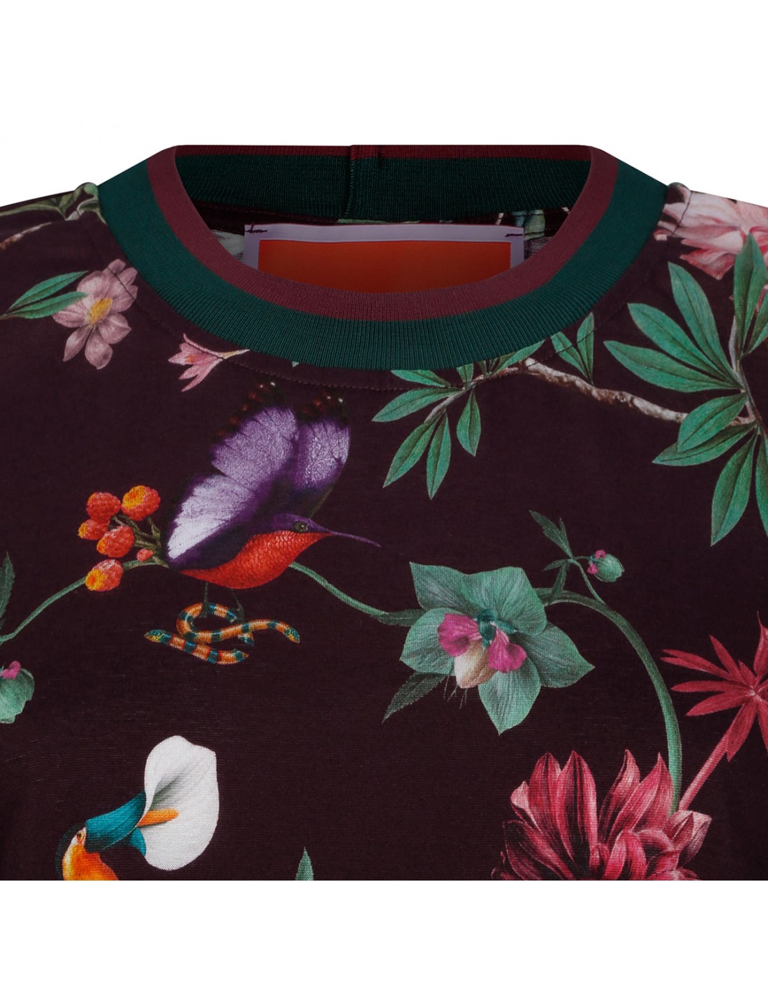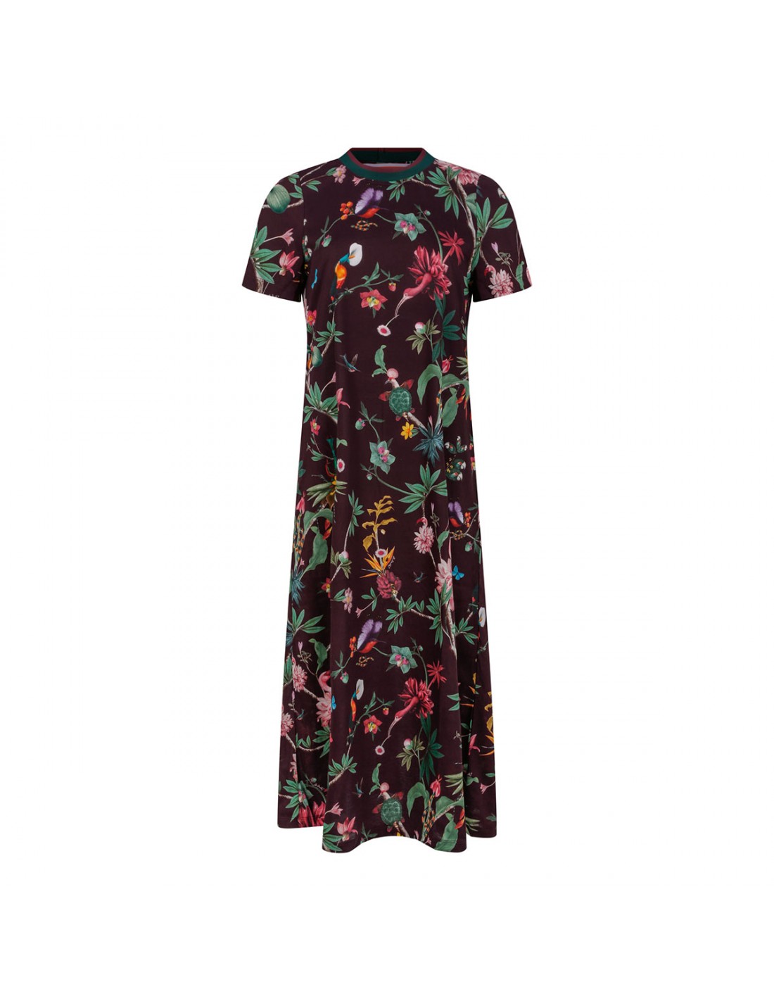 Burgundy cotton jersey Sporty Swing dress from La Double J featuring floral motif printed allover, two-tone ribbed crew neck, short sleeves, stretchy across the shoulders, loose fit.