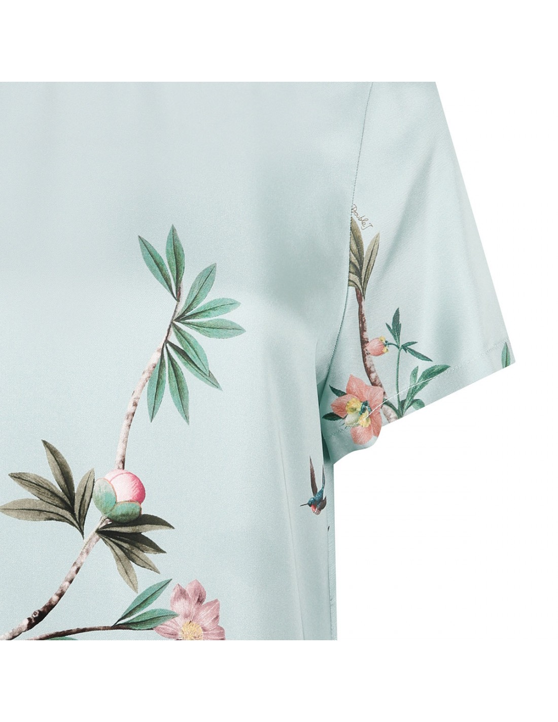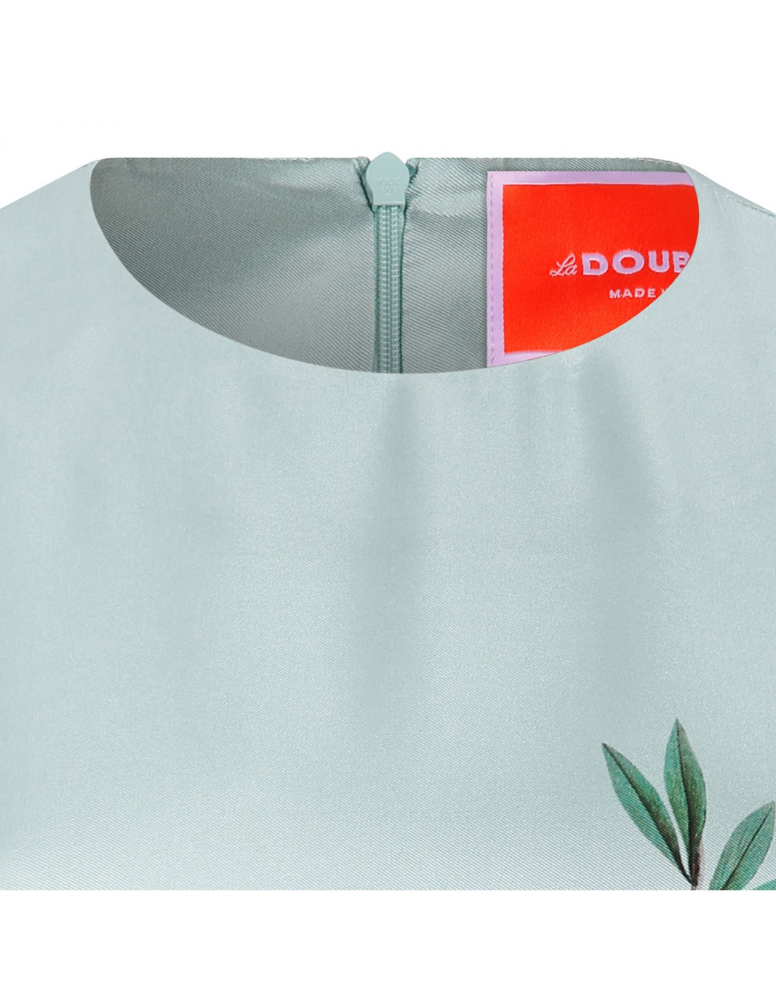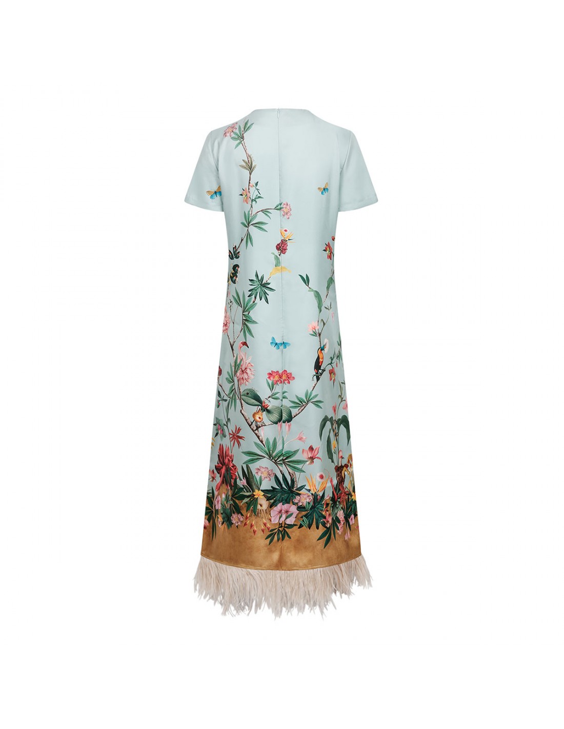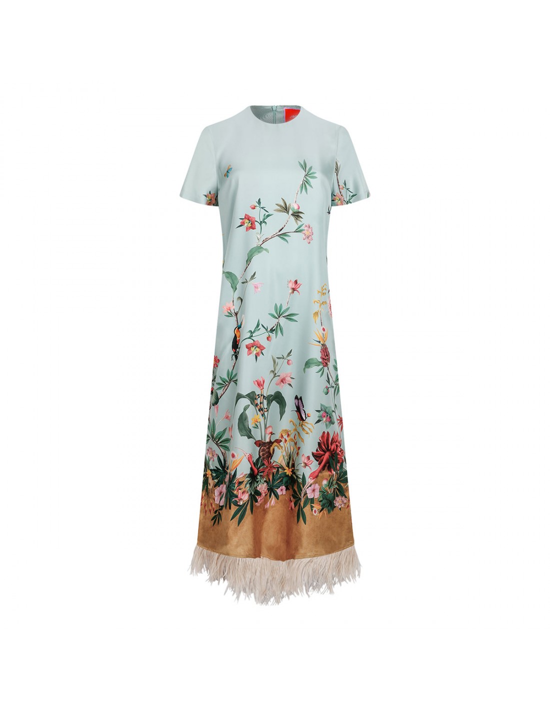 Aqua blue silk twill Swing dress from La Double J featuring floral motif print, crew collar, short sleeves, zip fastening along back, ostrich feather trims.