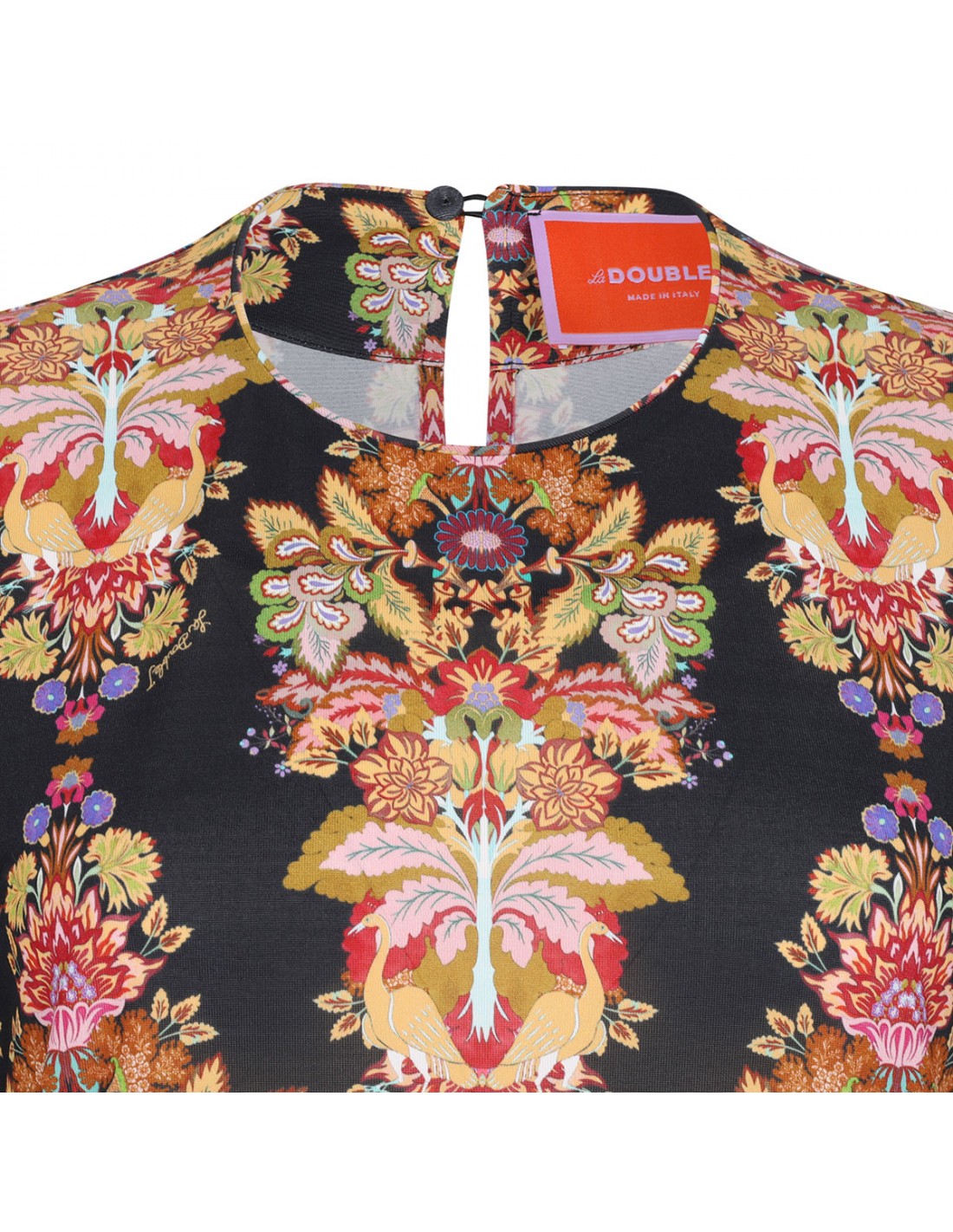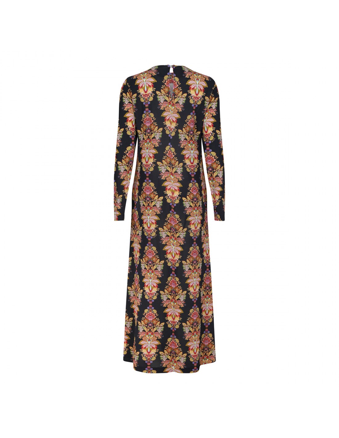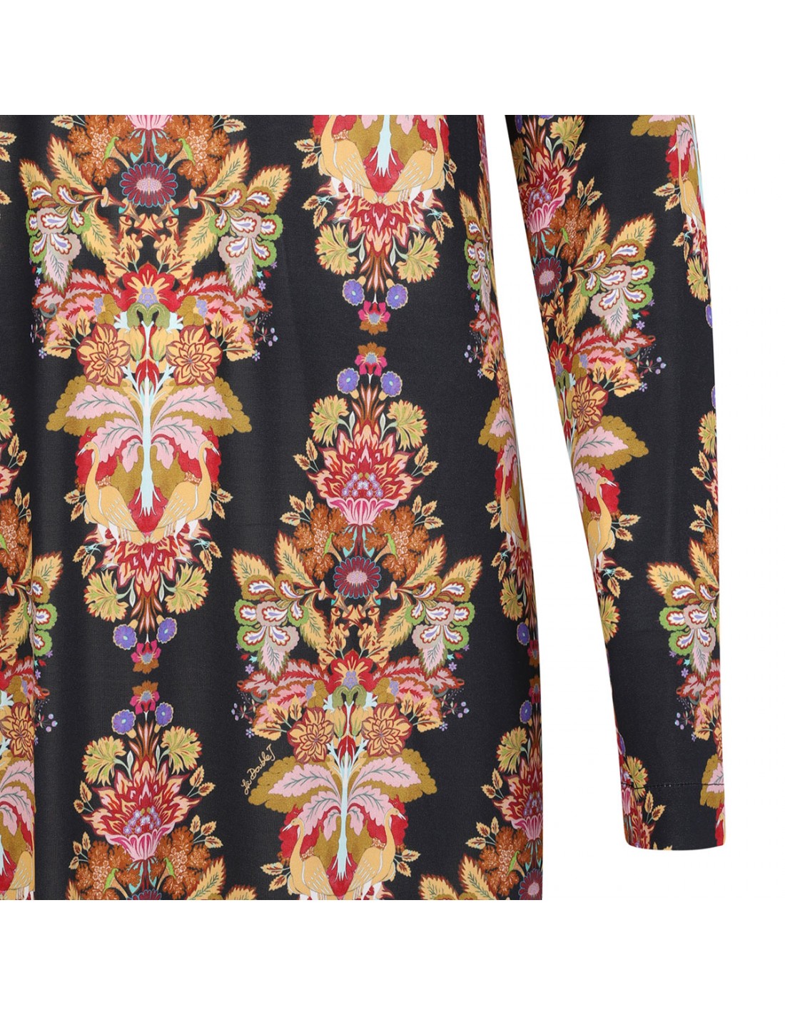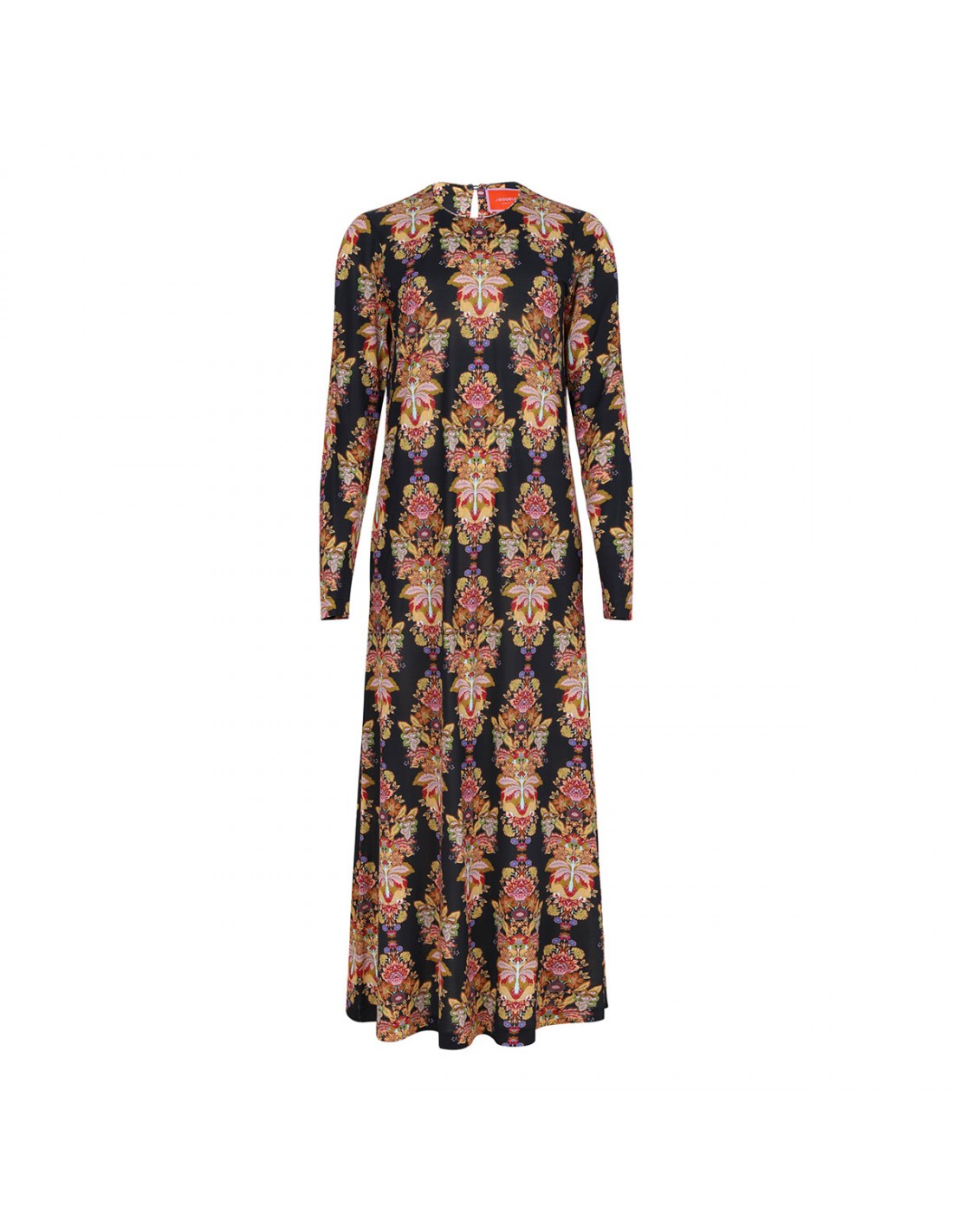Black mid-weight stretch jersey Swing dress from La Double J featuring floral print, maxi length, crew neck, long sleeves, button keyhole at back.