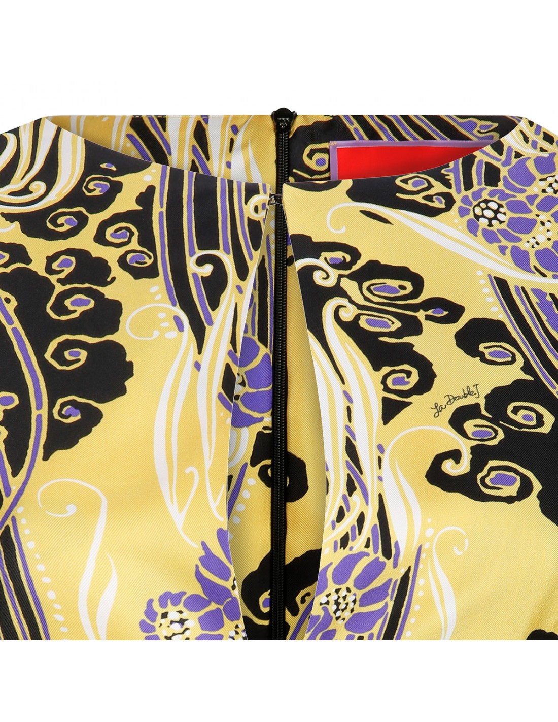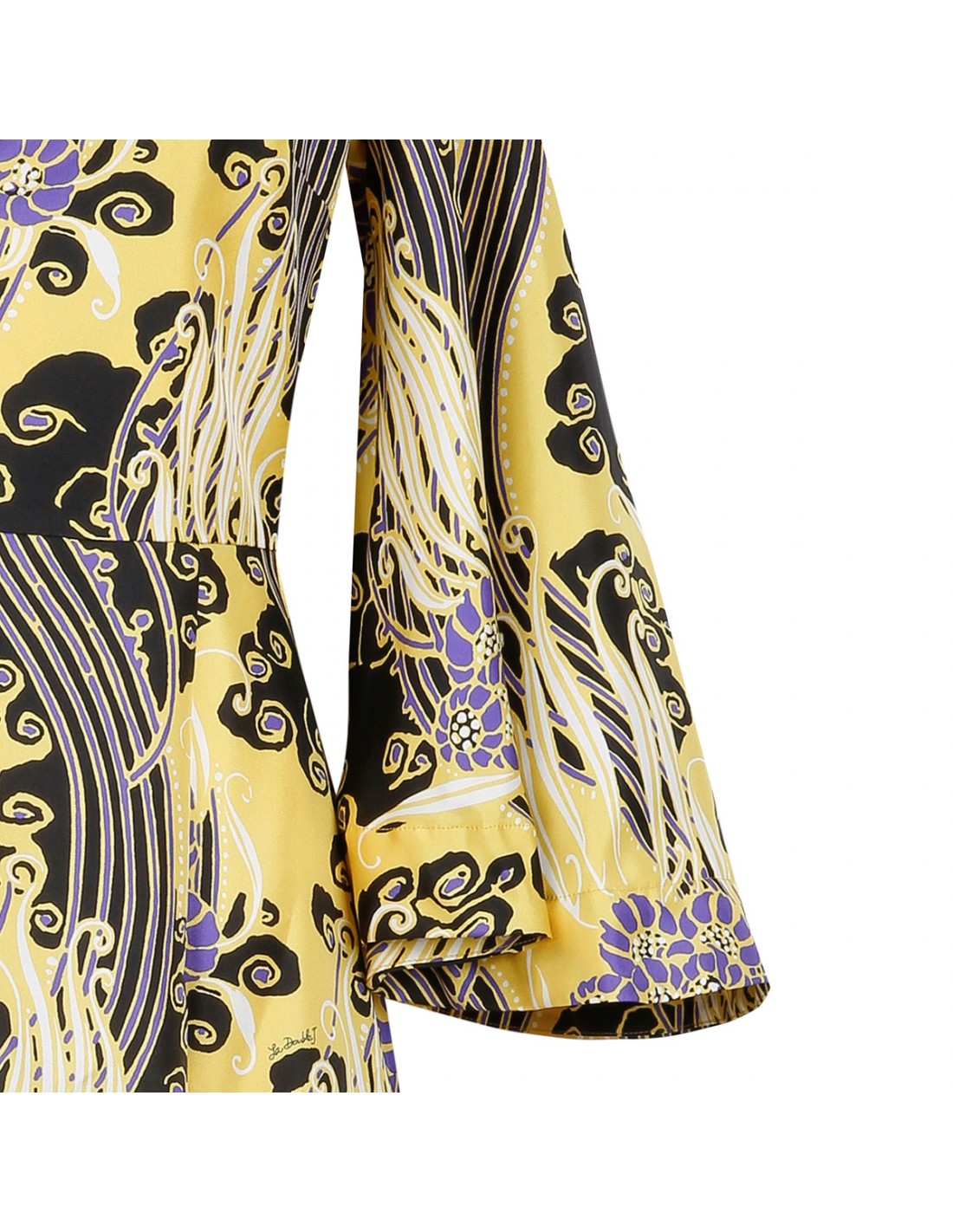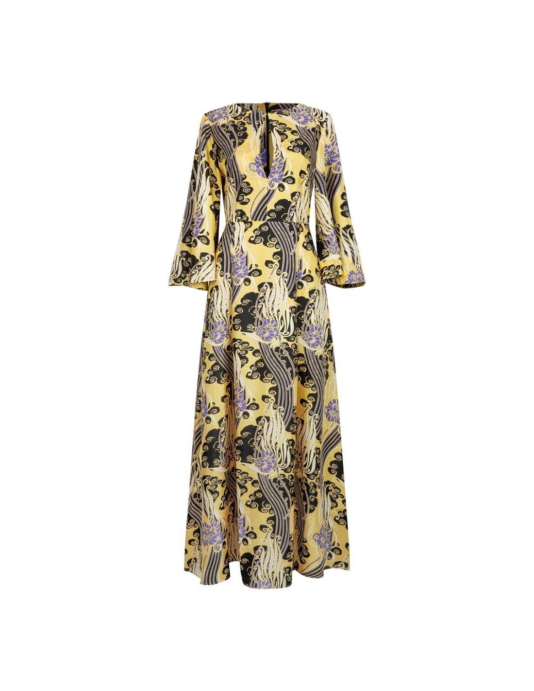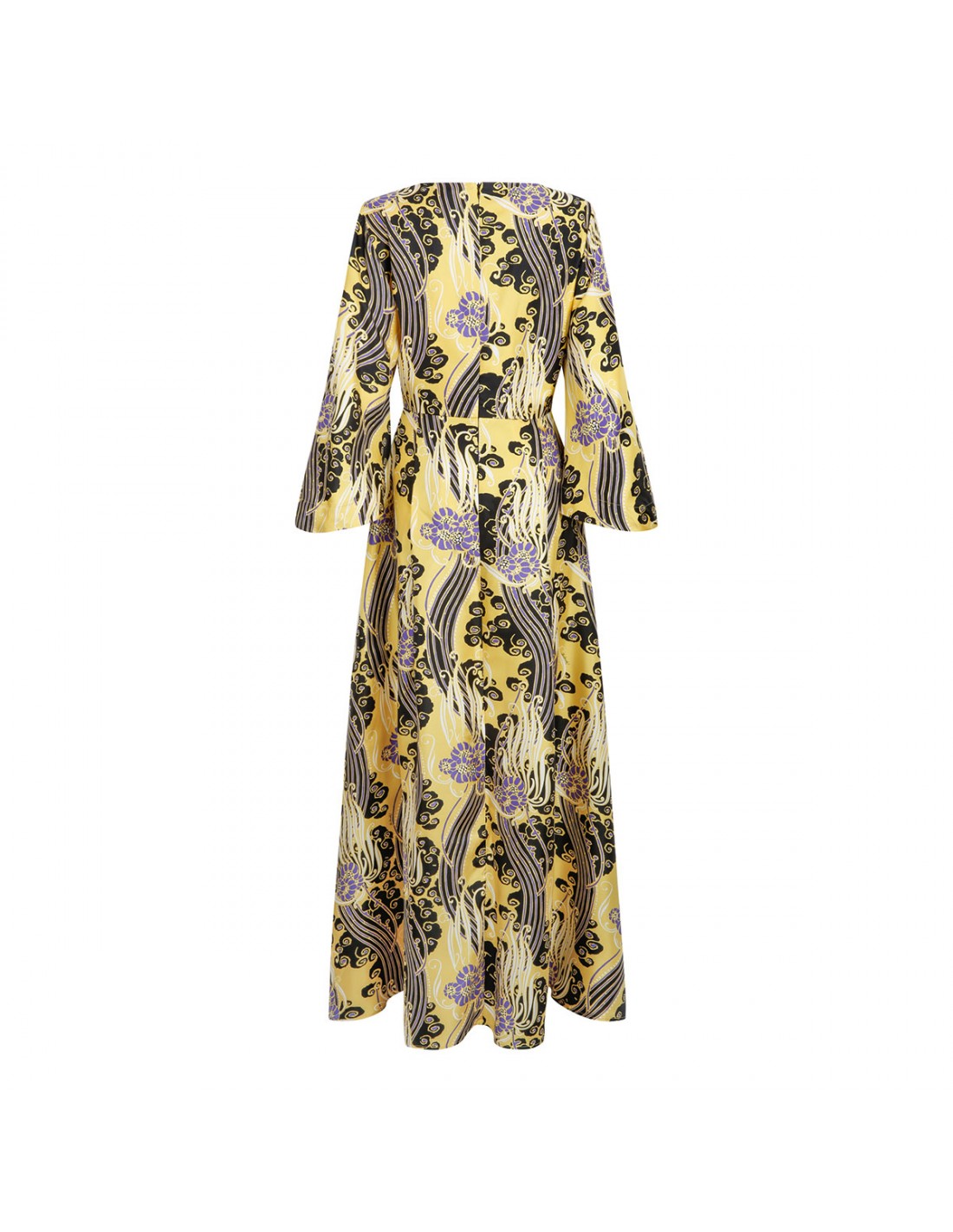 Yellow silk Belle kaftan dress from La Double J featuring multicolor floral motif, crew collar, key-hole on front, zip fastening along back, long fluted sleeves.