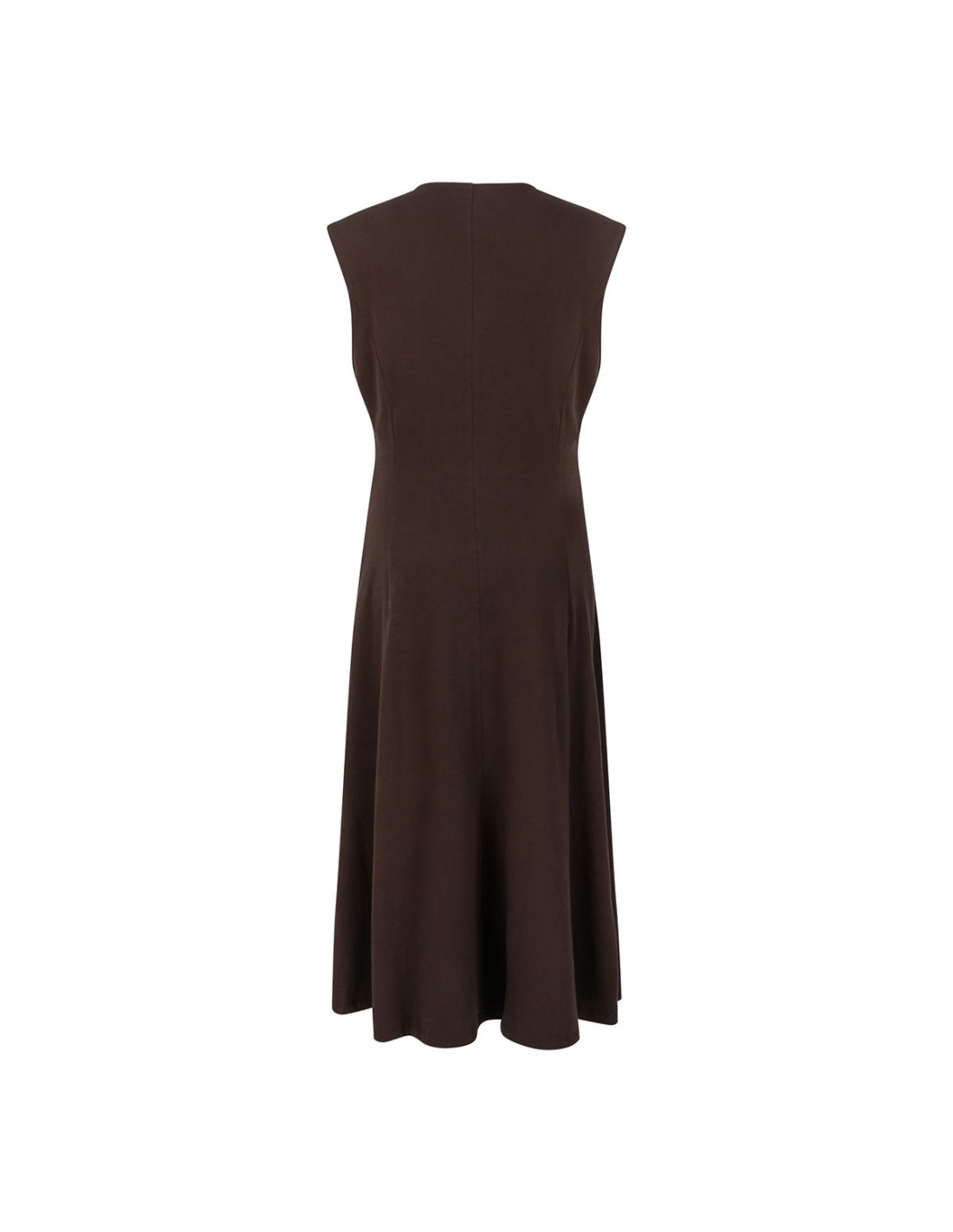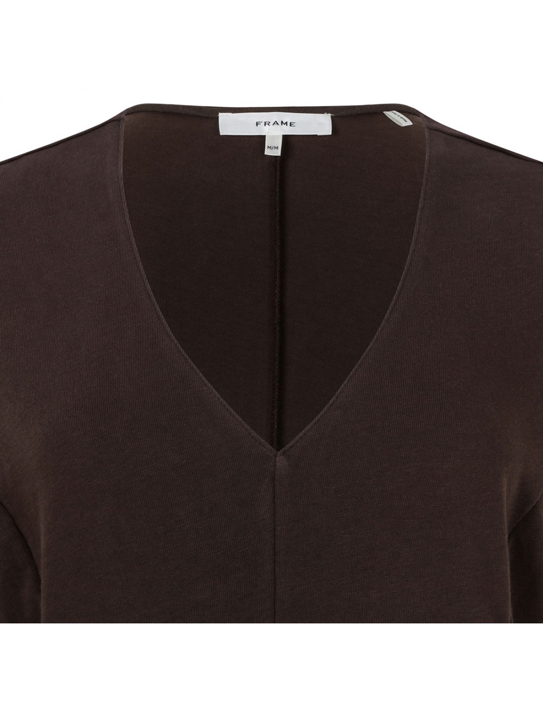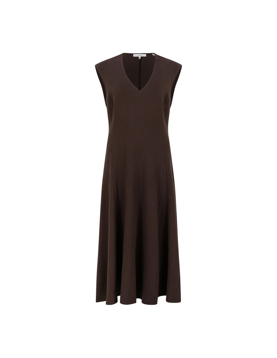 Mocha hue cotton The Studio dress from Frame featuring clean front seaming, midi-length, cap sleeves, discreet zip closure, V-neck.