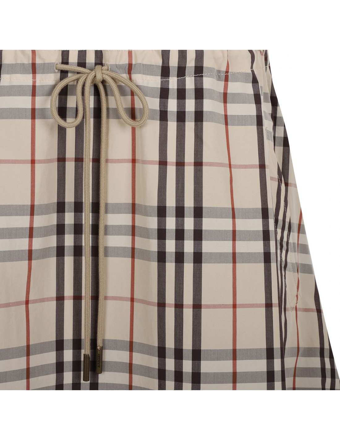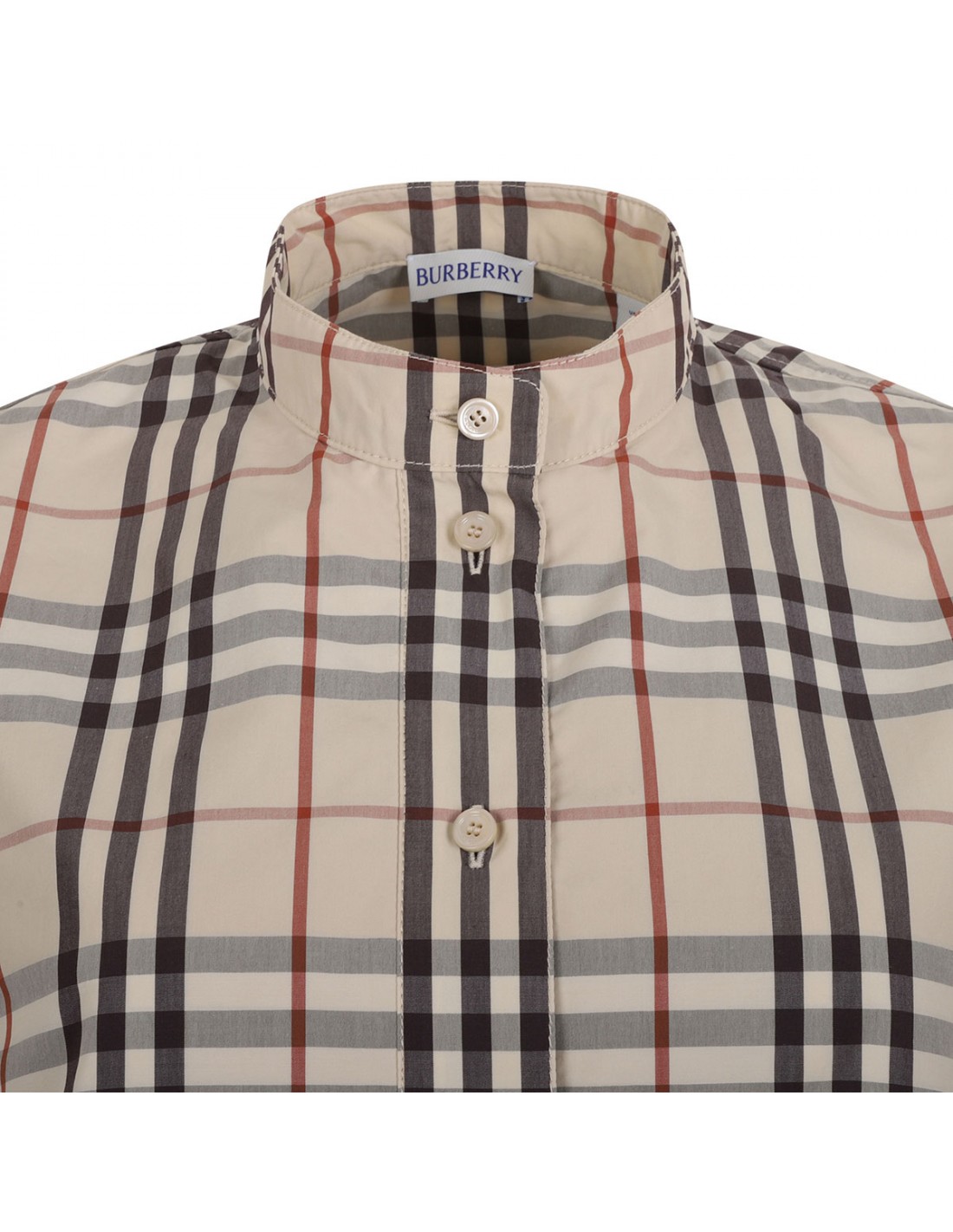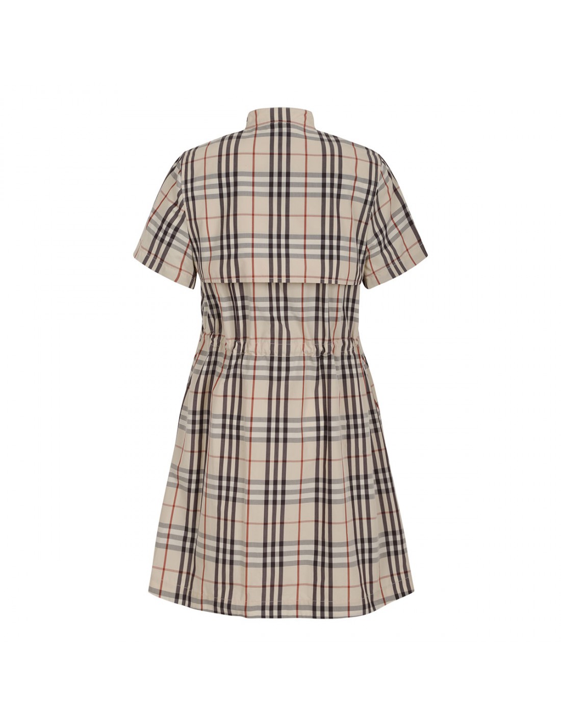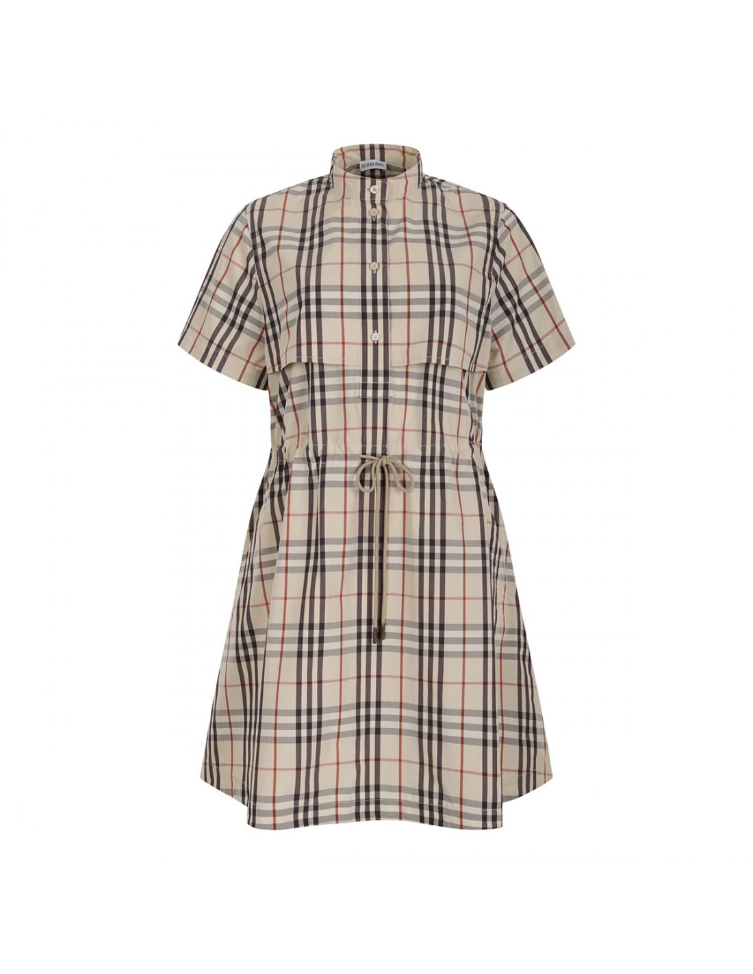Almond beige cotton dress from Burberry featuring iconic Check motif, gun flaps and a storm shield, regular fit, logo-engraved drawstring at the waist, short sleeves, mandarin collar, button placket and side pockets.