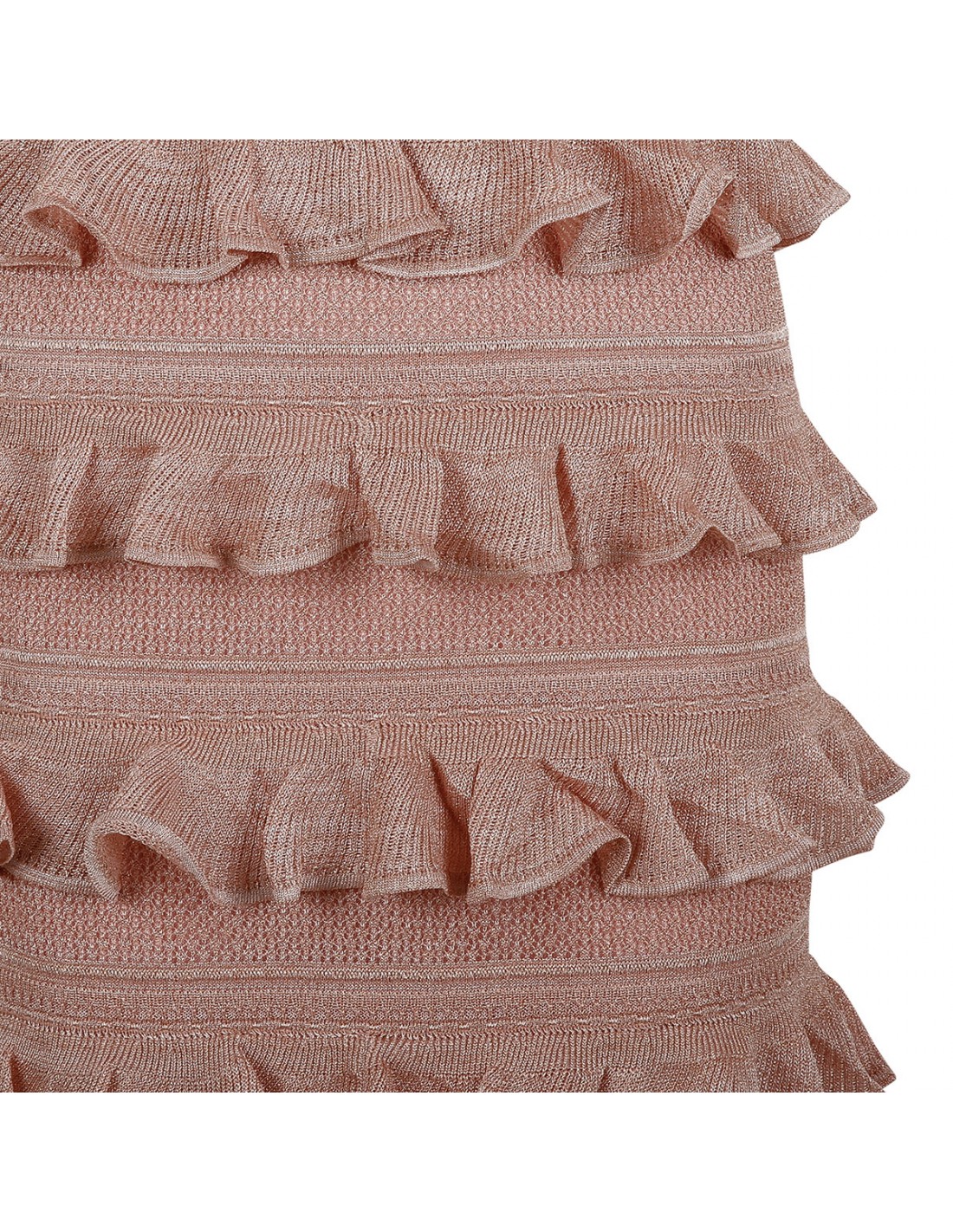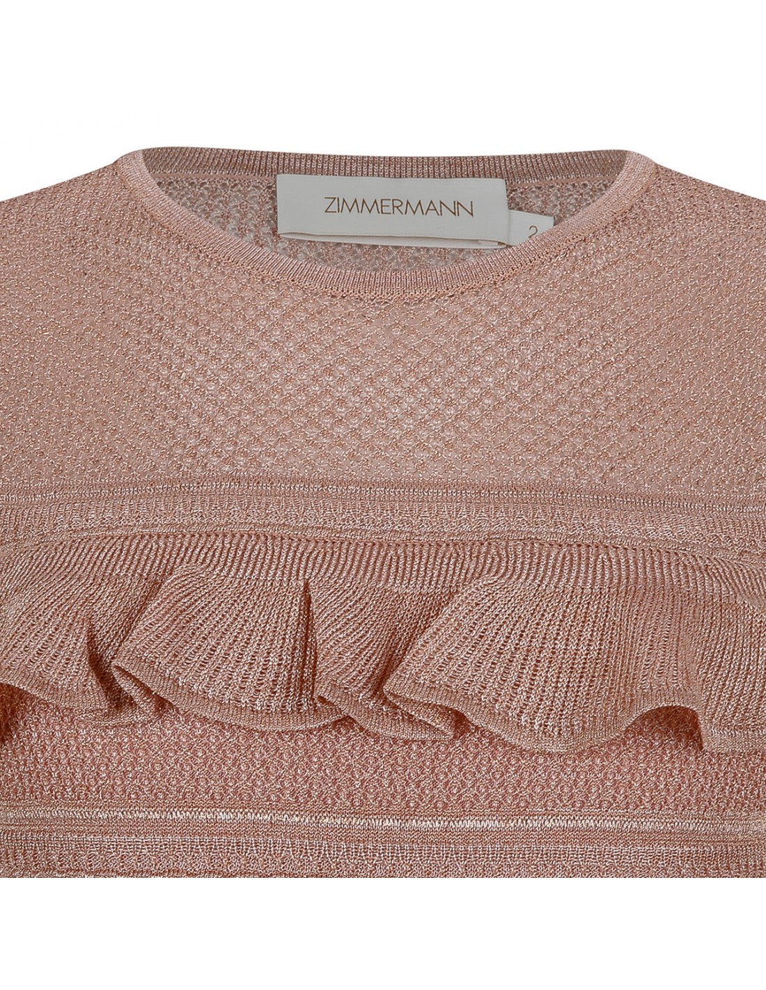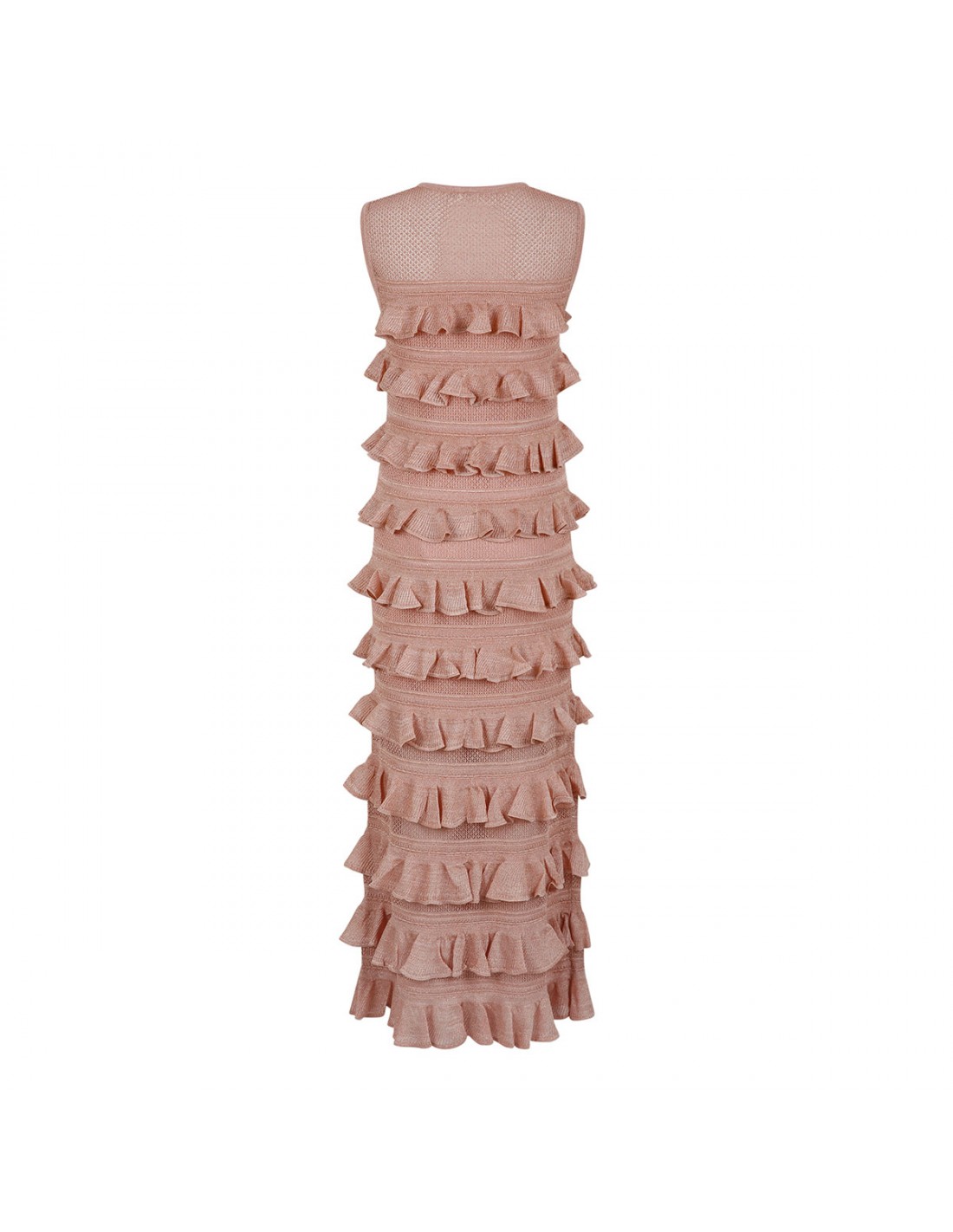 Metallic rose gold knit Luna midi dress from Zimmermann featuring square sheer crochet panelling, cascading frills throughout, sleeveless silhouette, slip on style, crew collar.