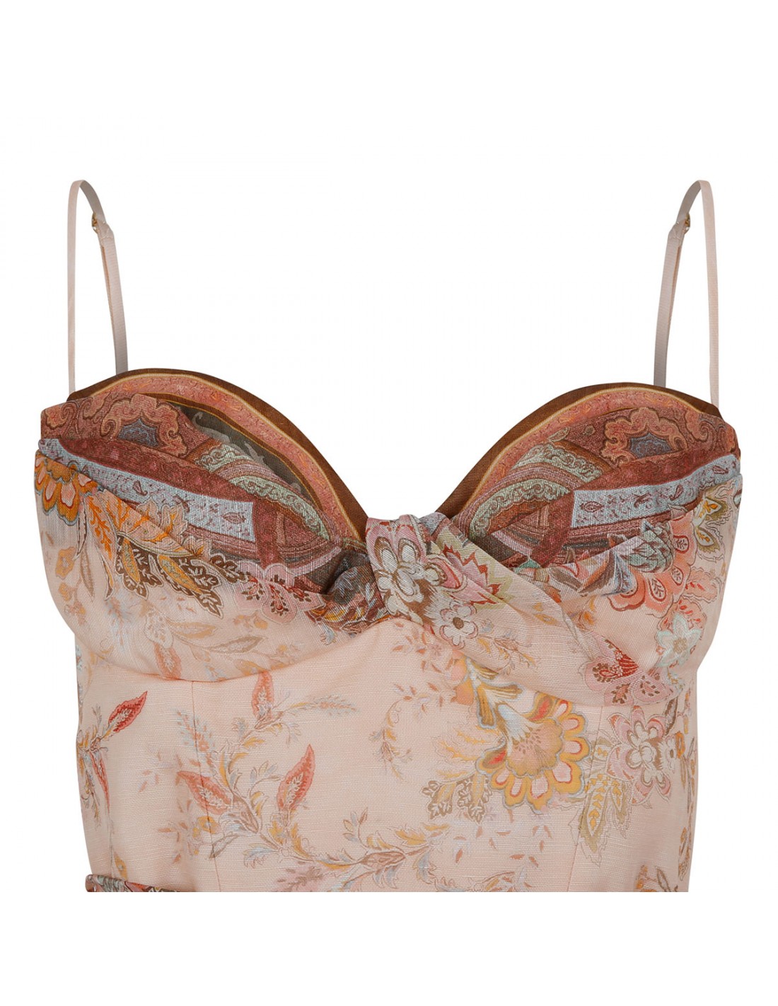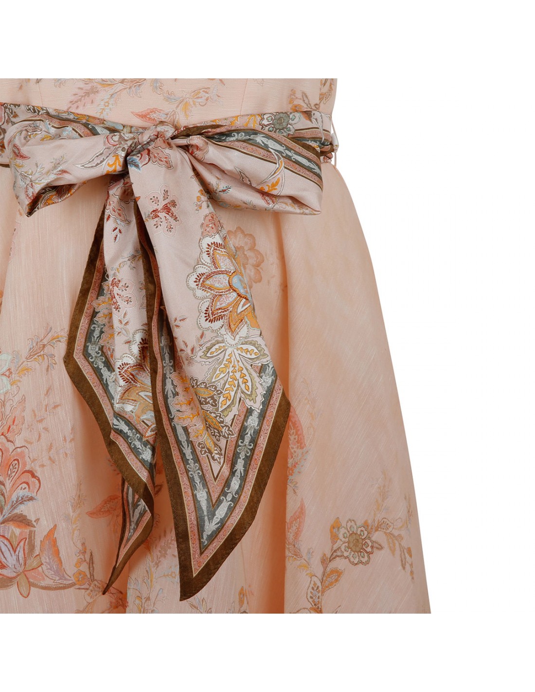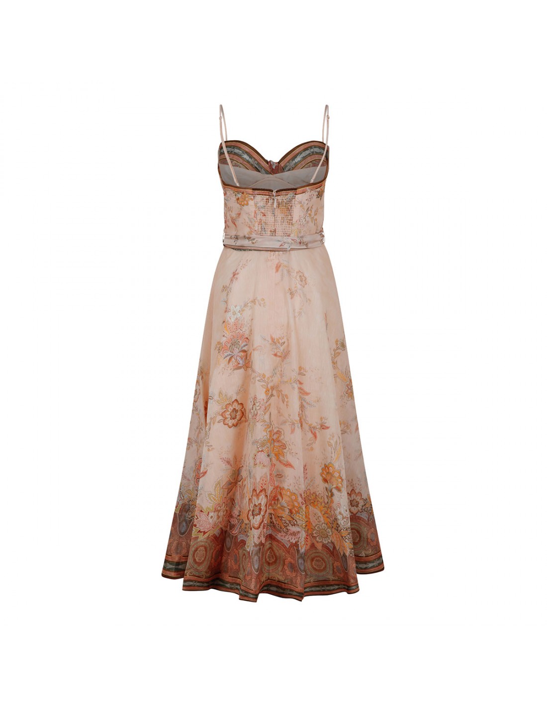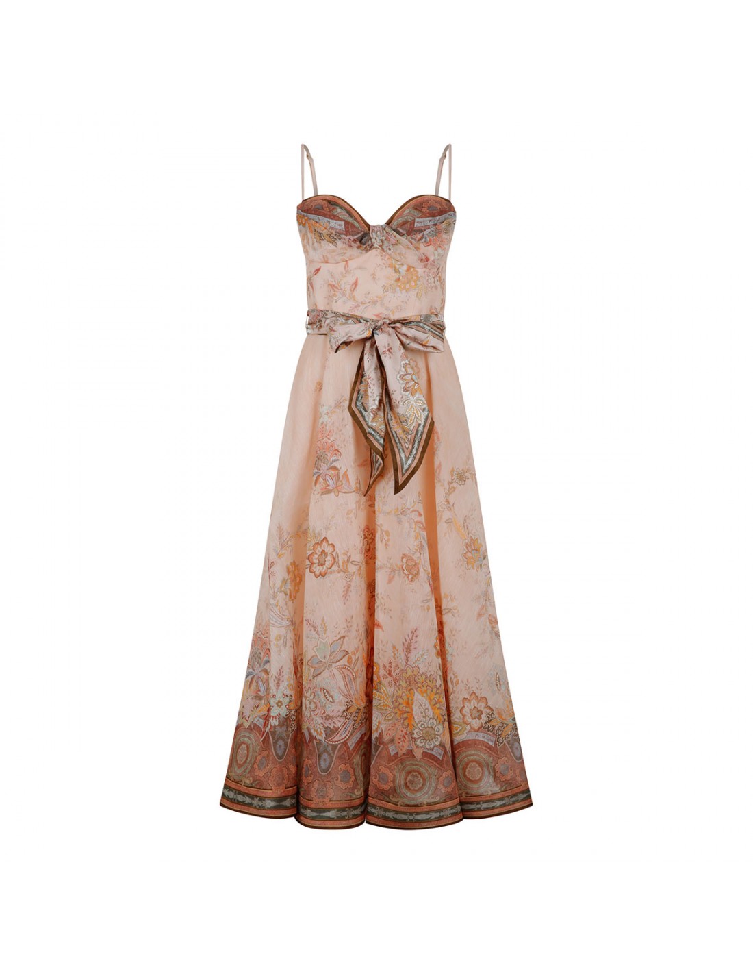 Powder pink silk-linen Alchemy structured midi dress from Zimmermann featuring paisley motif, sweetheart neckline with twist detailing, adjustable straps, shirred back bodice, full flare skirt, detachable scarf waist tie, concealed zip fastening at back, side pockets.