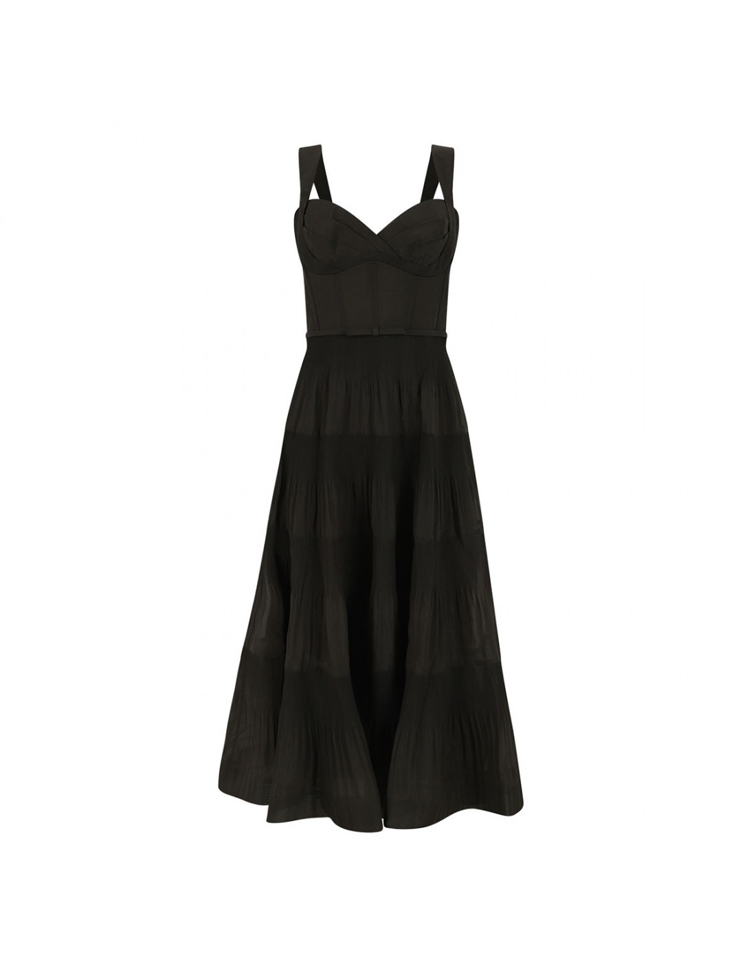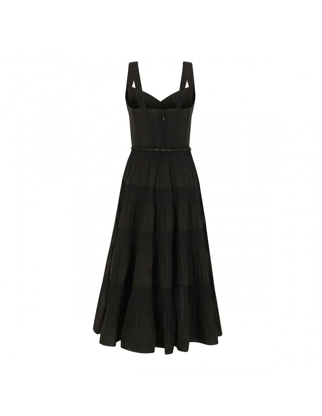 Olive-hue pleated draped midi dress from Zimmermann featuring sweetheart neckline, gathered skirt, fitted corset bodice with twisted drape, fixed straps with elastic back, sleeveless silhouette, shirred centre back bodice with concealed zip fastening, detachable bow belt.