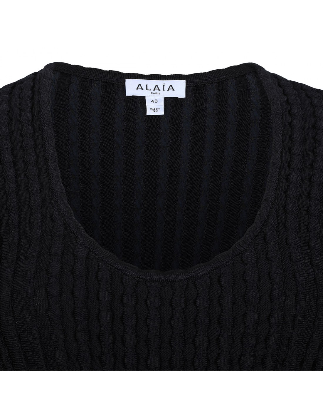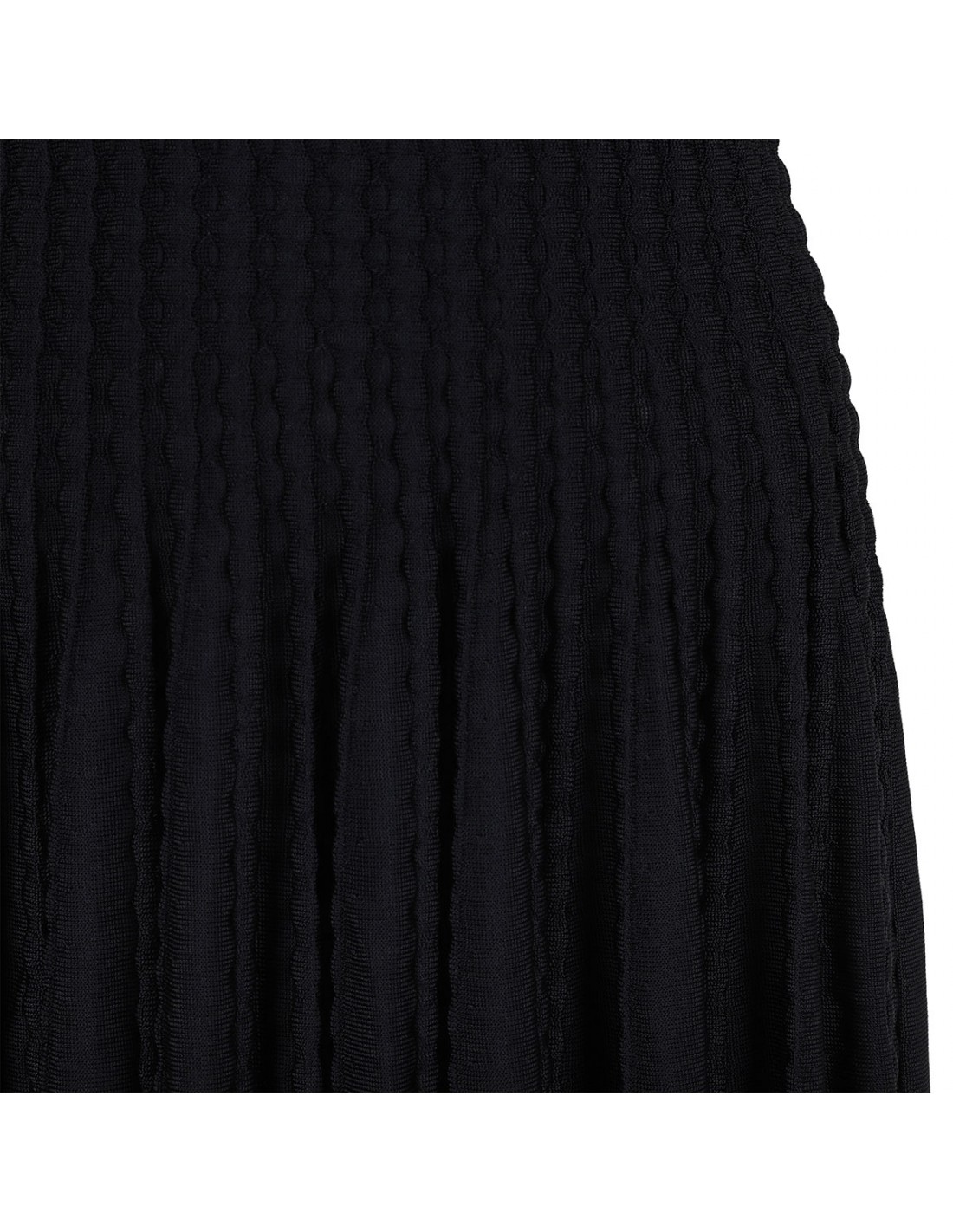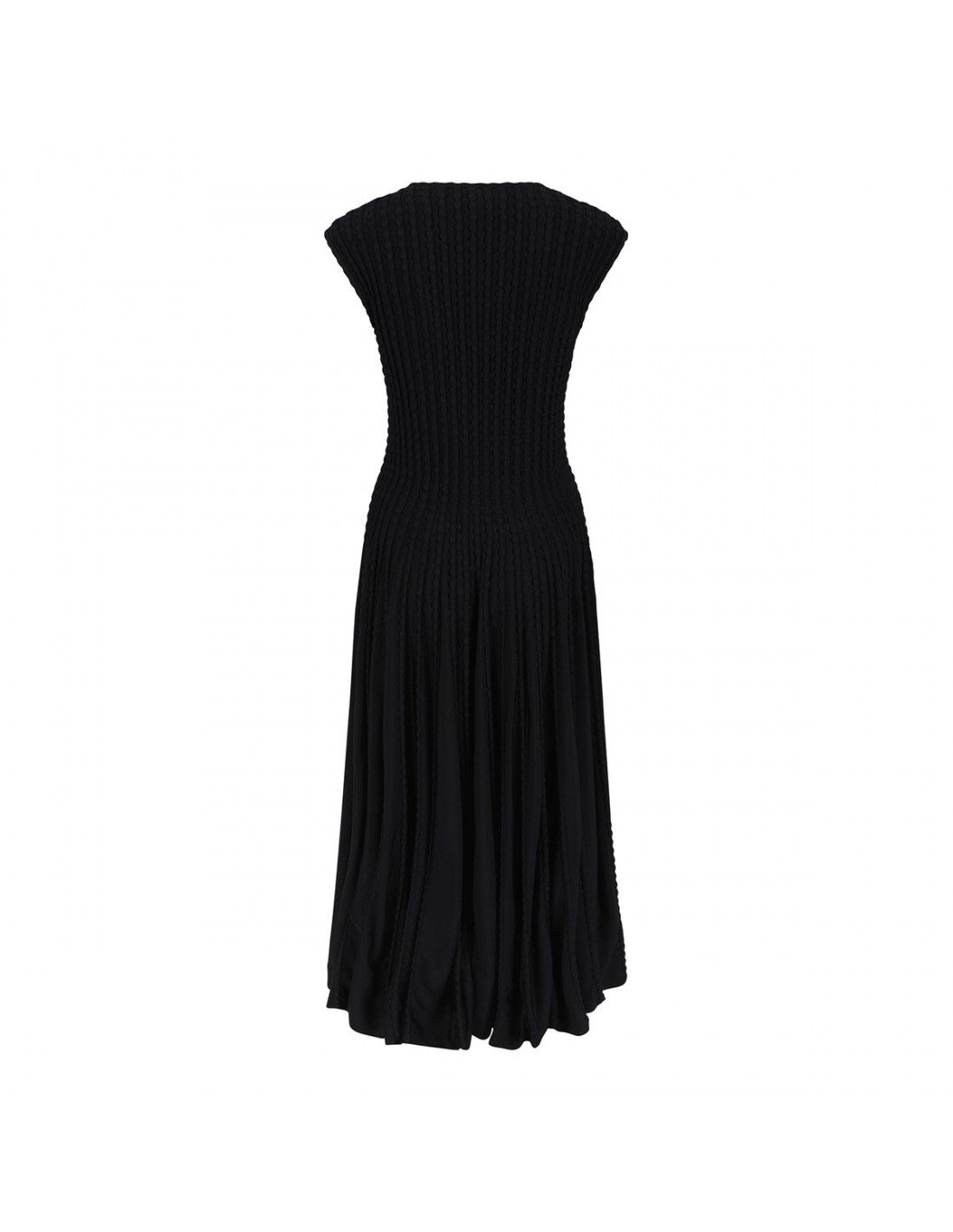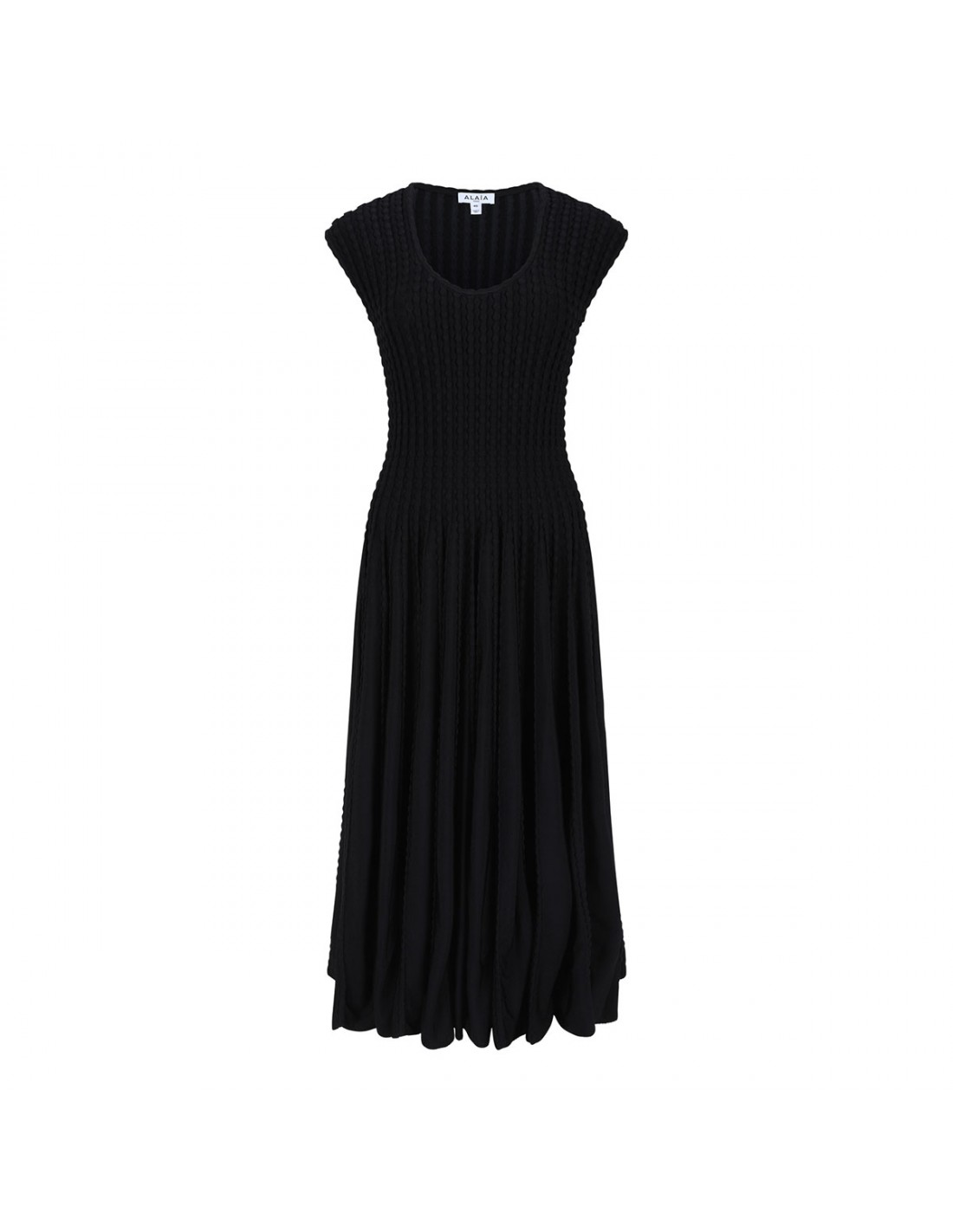 Midnight hue bead-knitted flared dress from Alaia featuring sculptural pleats, scoop neckline, short cap sleeves, midi length.