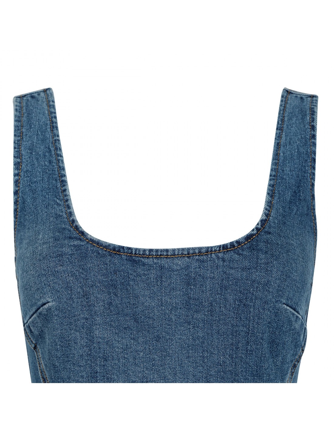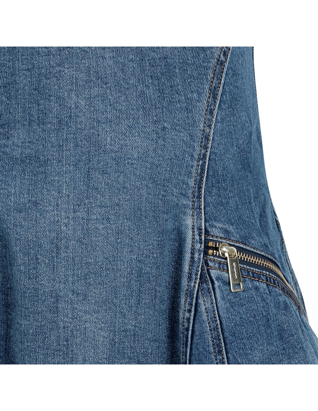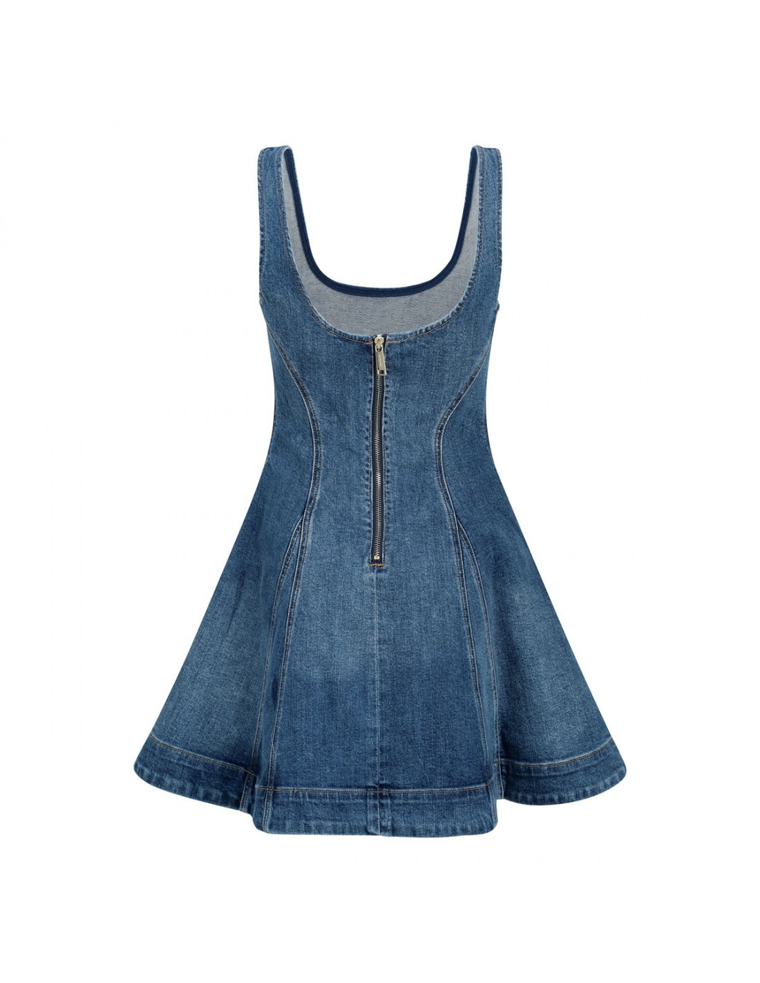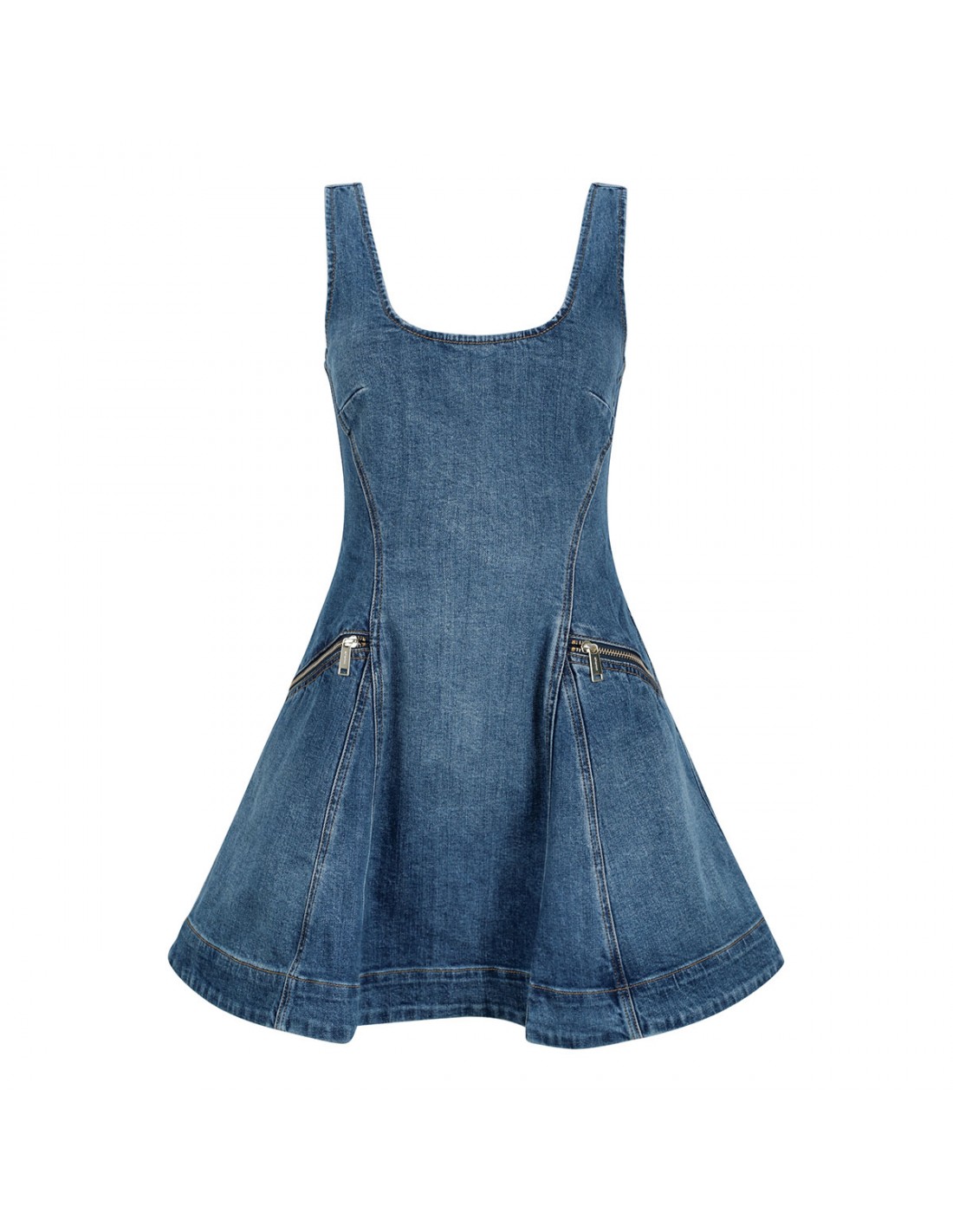 Indigo denim mini dress from Self Portrait featuring scoop neck, sleeveless silhouette, exposed zip at the back, flared skirt, side zipped pockets, low cut back, side zipped pockets.