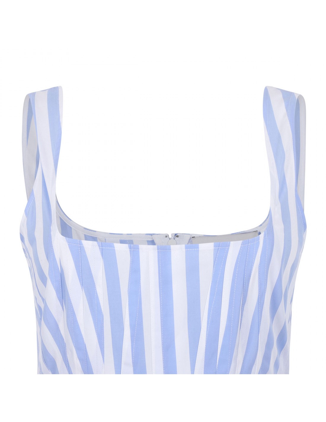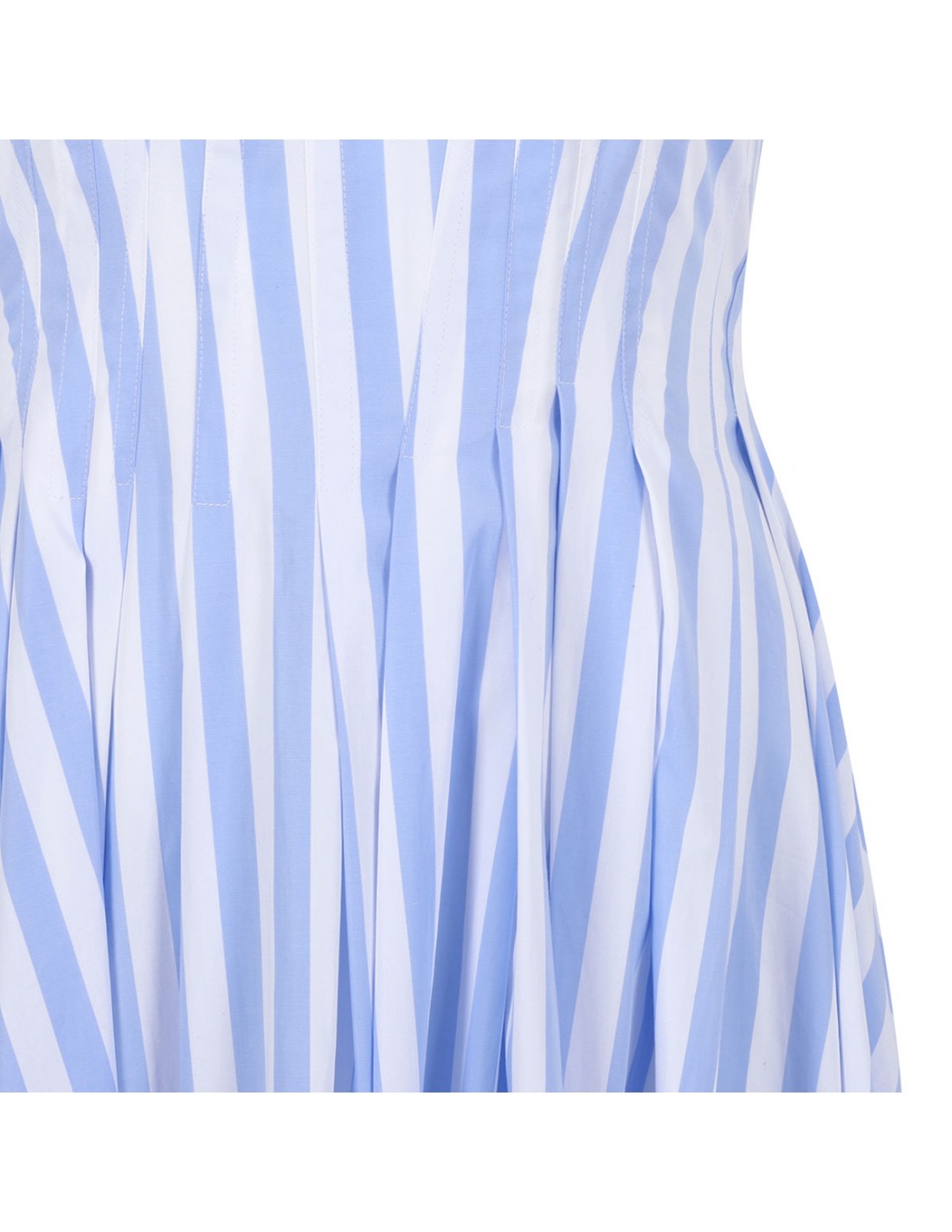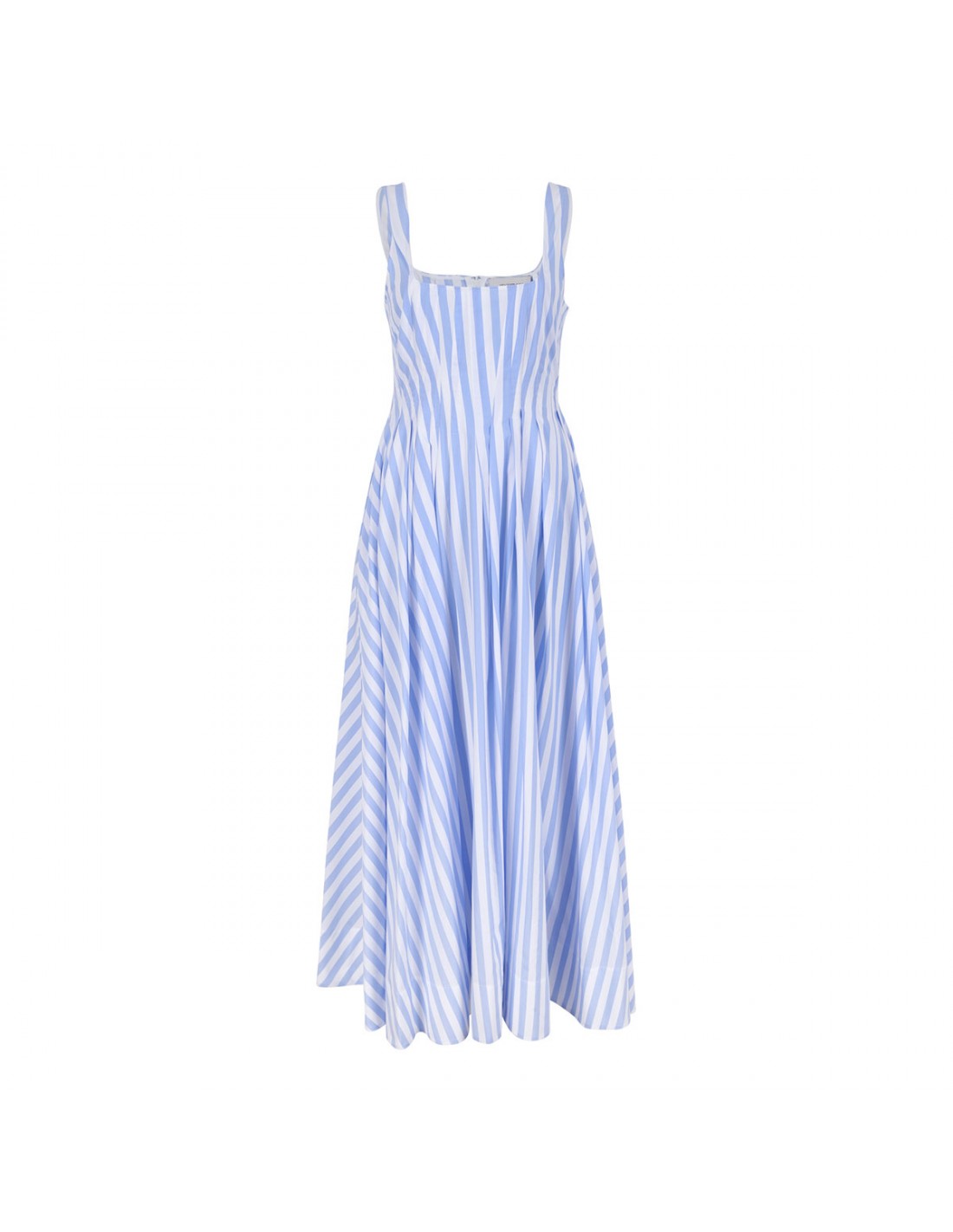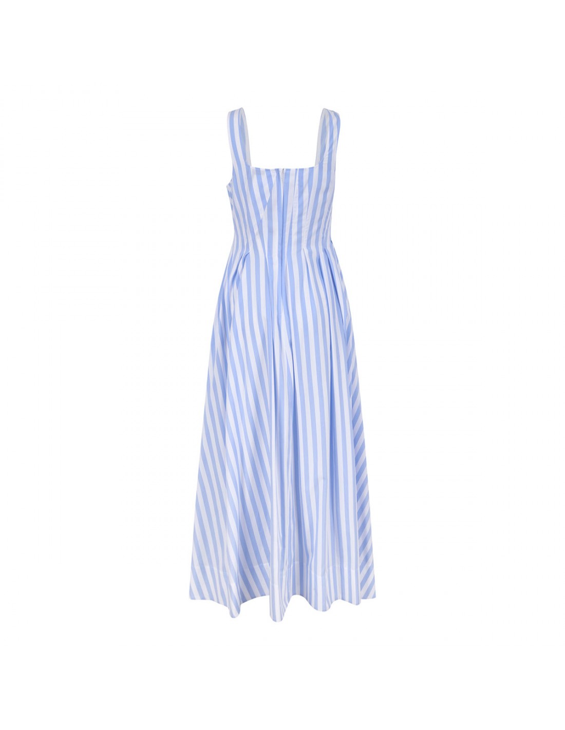 Light blue and white cotton poplin Filmato long dress from Sportmax featuring striped motif, sleeveless silhouette, darts and slits on the bodice, fitted waist, flared skirt, square neckline, concealed back zip fastening, side pockets.