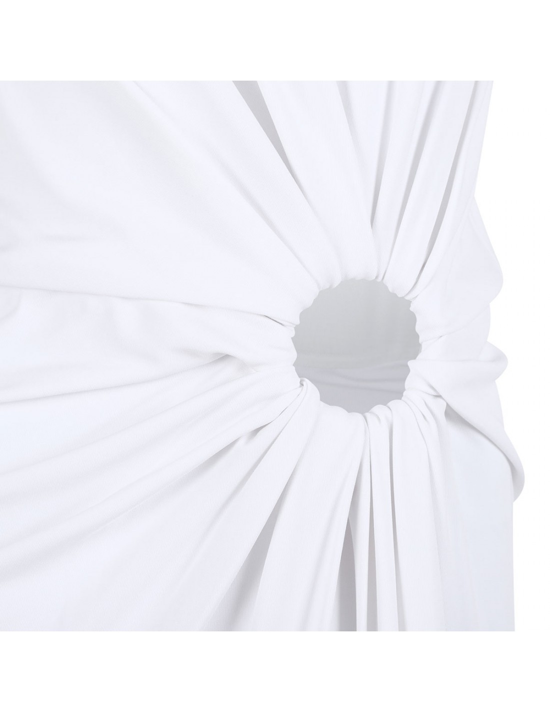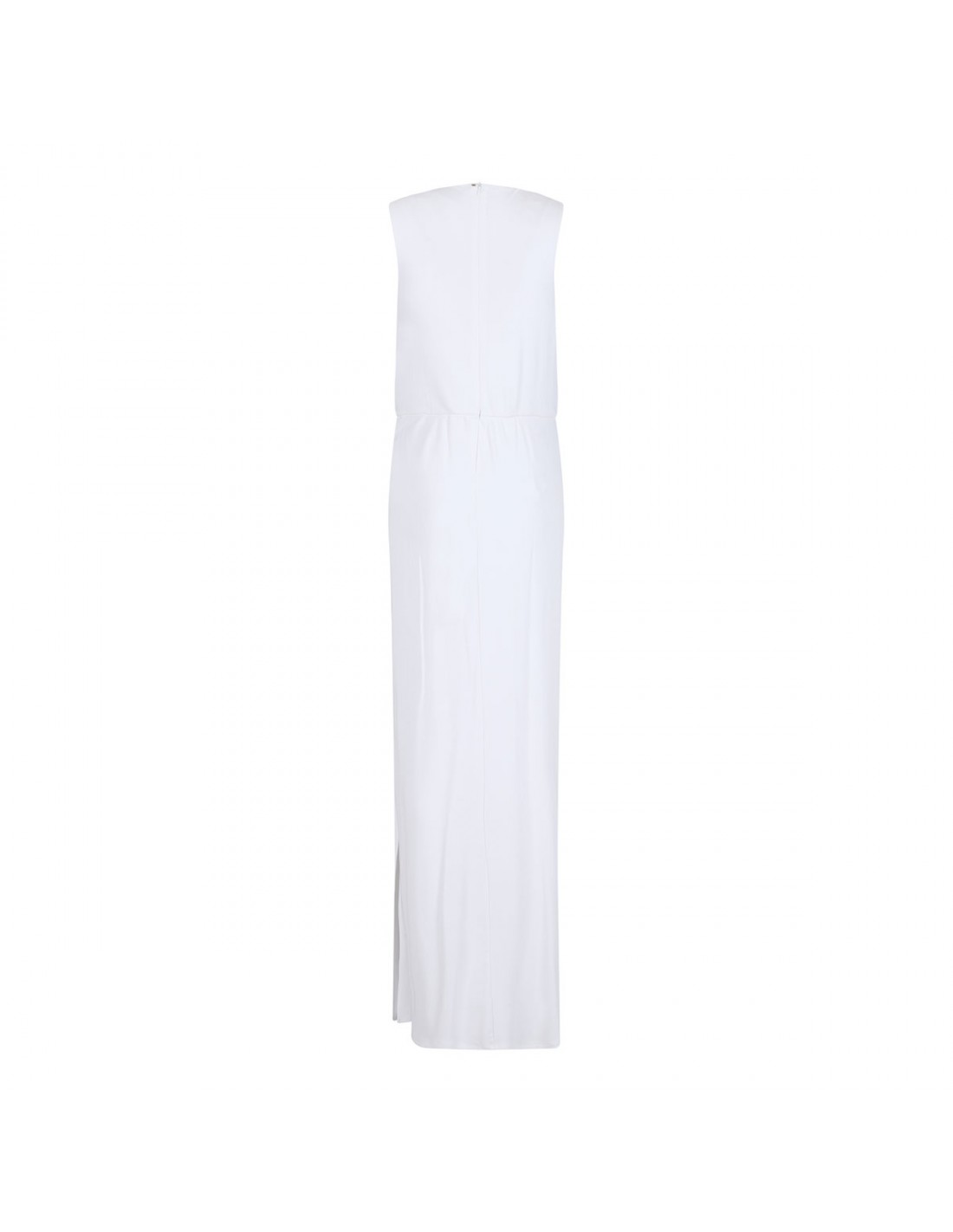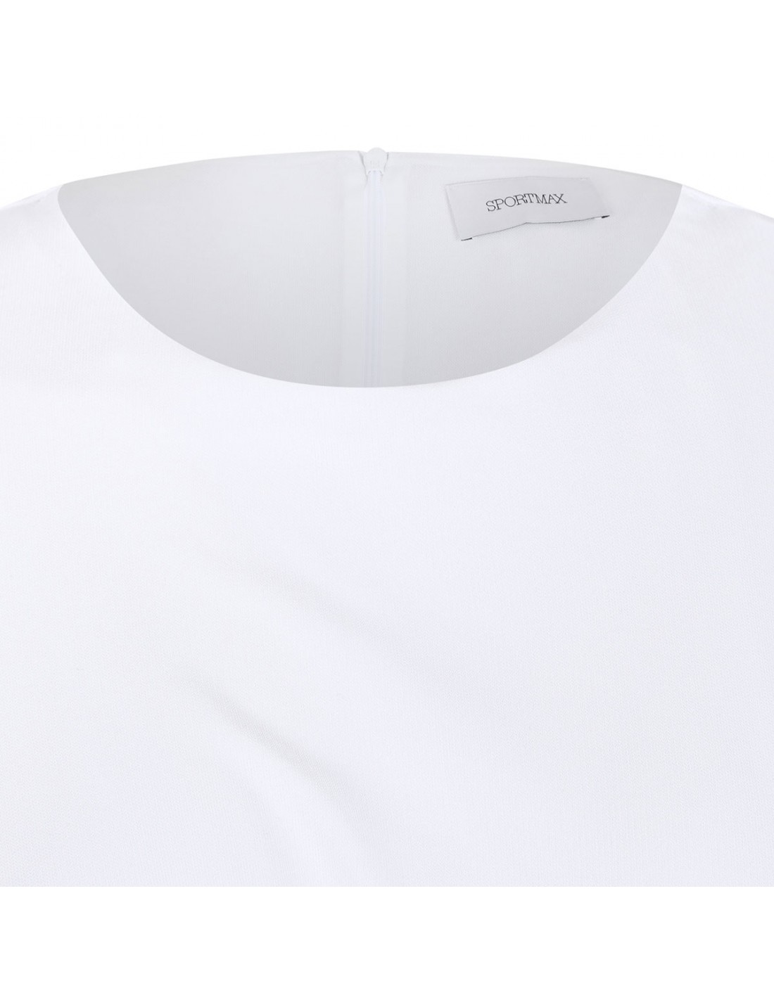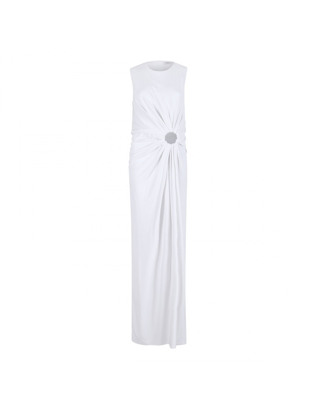 Milk white hue stretch crepe jersey Saletta sleeveless dress from Sportmax featuring metal ring detail with cut-out on the left side, rounded neckline, back zip fastening, pleats and drapes on the bodice, slim fit.