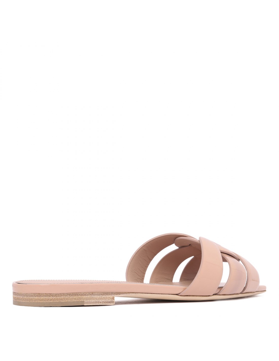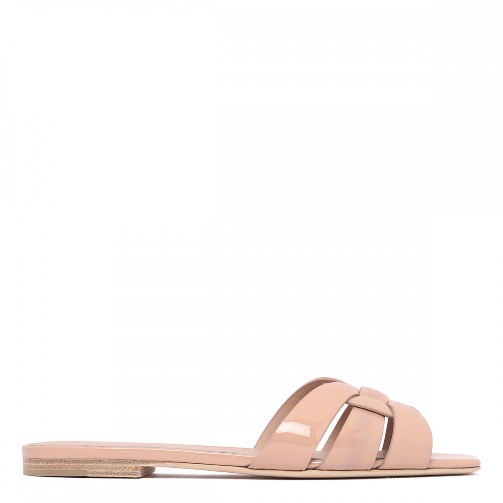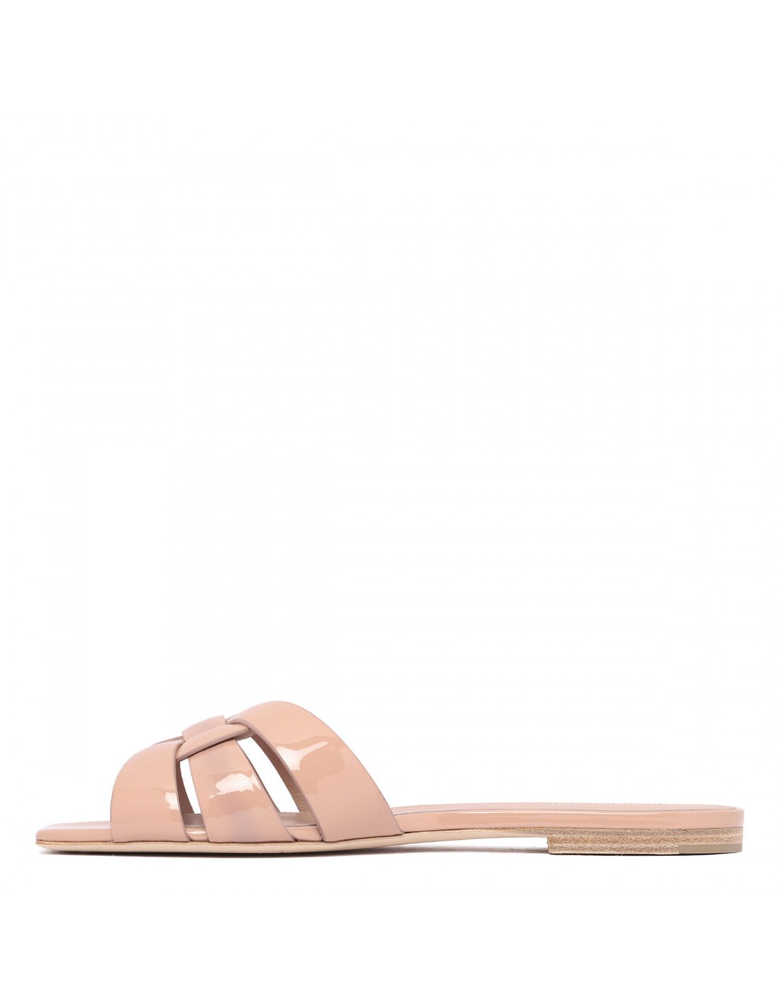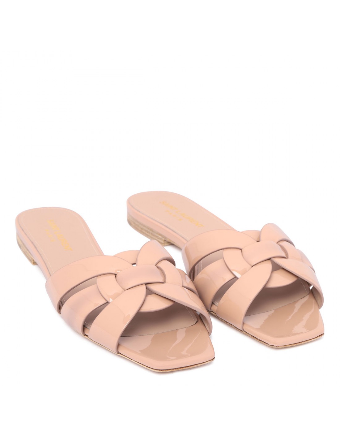 Nude patent leather Tribute slide sandals from Saint Laurent with intertwining straps, squared open toe, logo printed on insole, leather insole and sole.