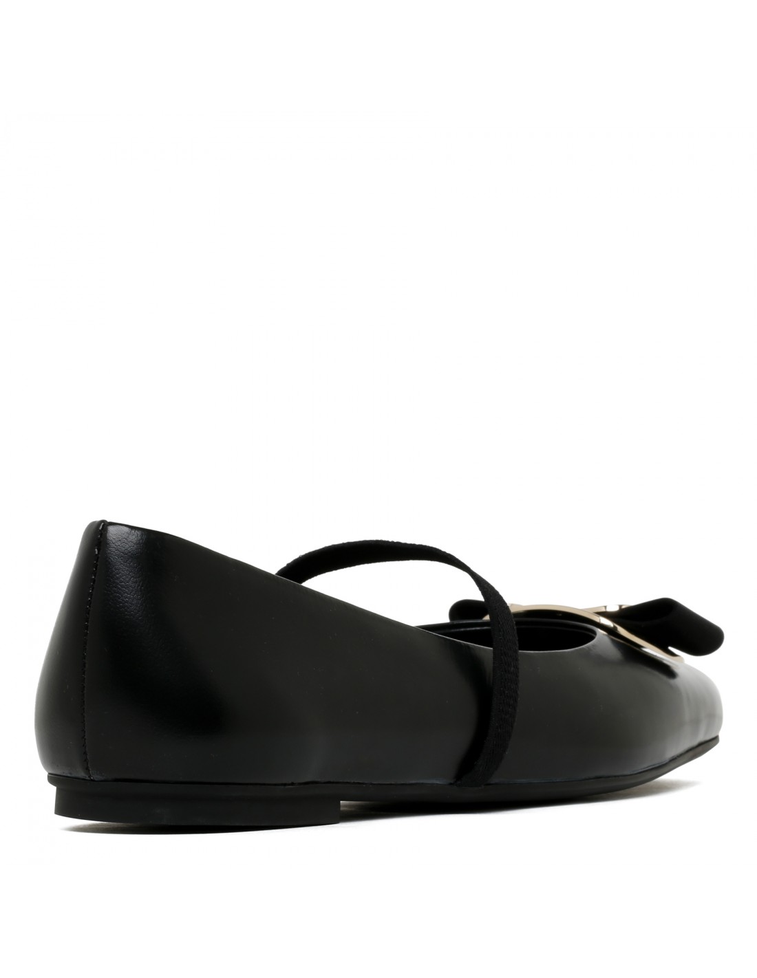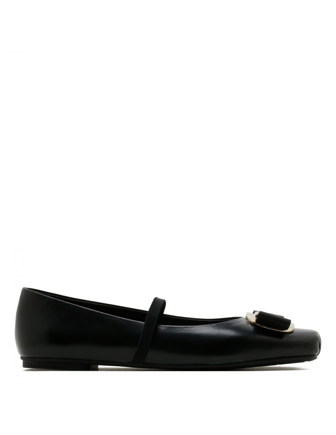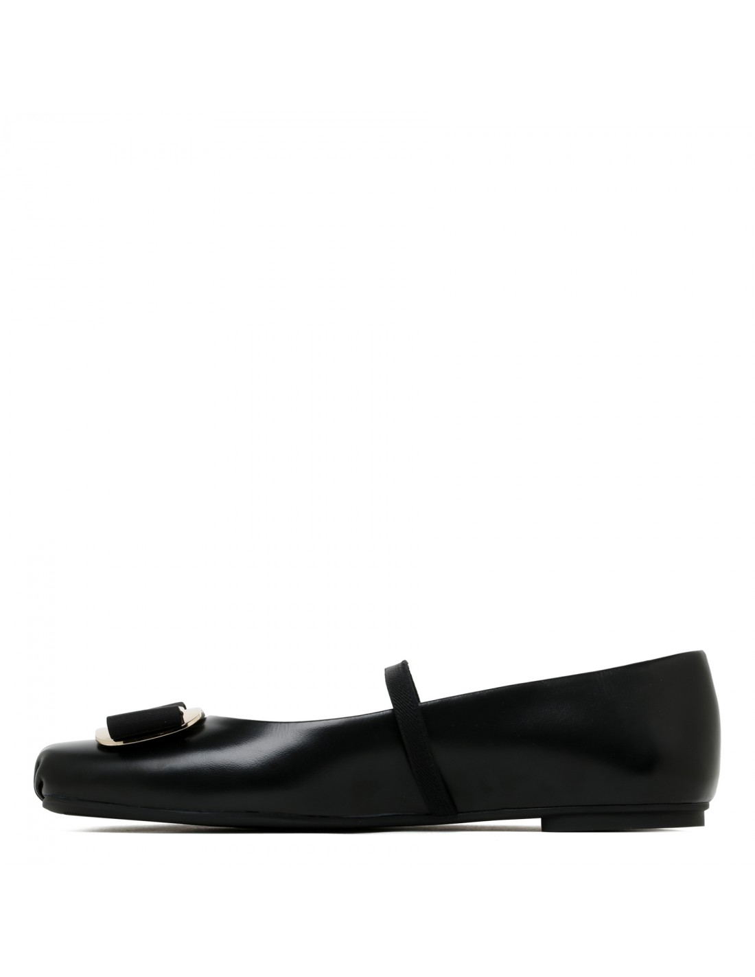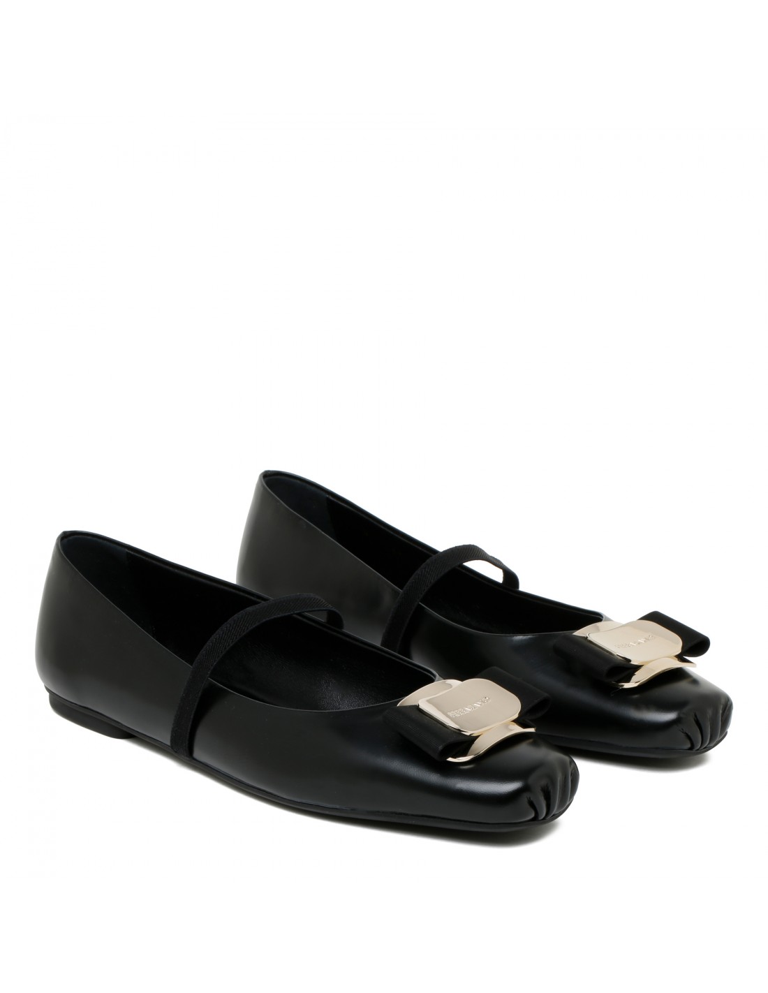 Black soft leather New Vara plate ballerinas from Salvatore Ferragamo featuring ruffles at the pointed toe, gros-grain elastic across the upper, Vara bow on buckle at the toe, rubber flexible sole.