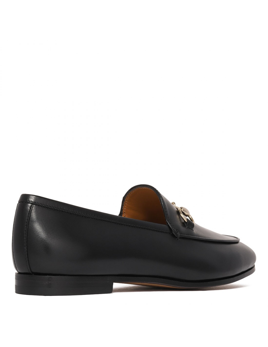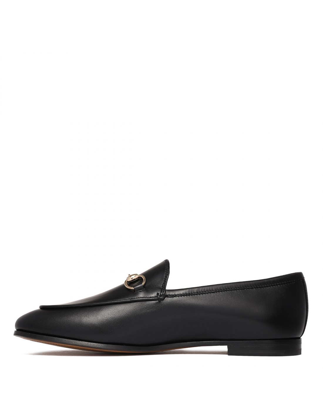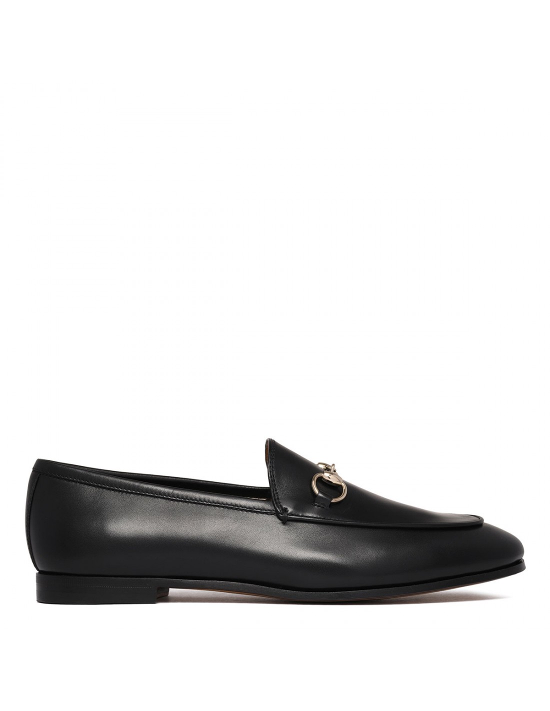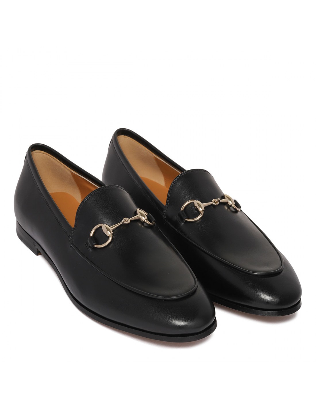 Black leather Jordaan loafers from Gucci featuring light gold-toned Horsebit and hardware, almond toe, leather insole and sole.