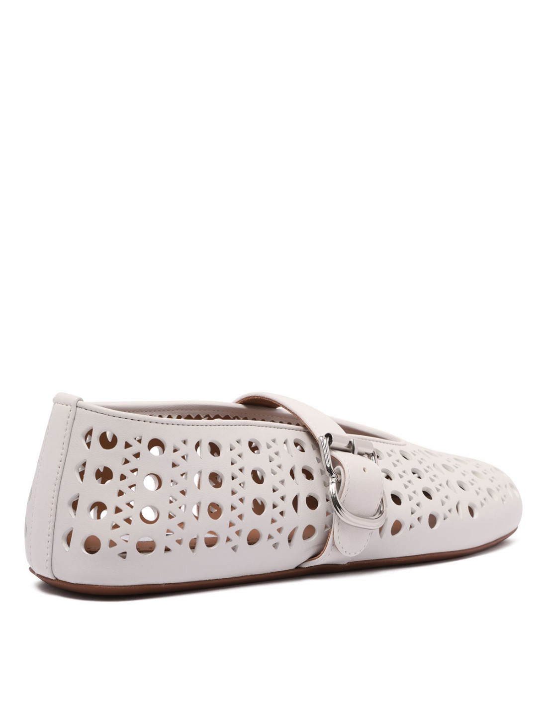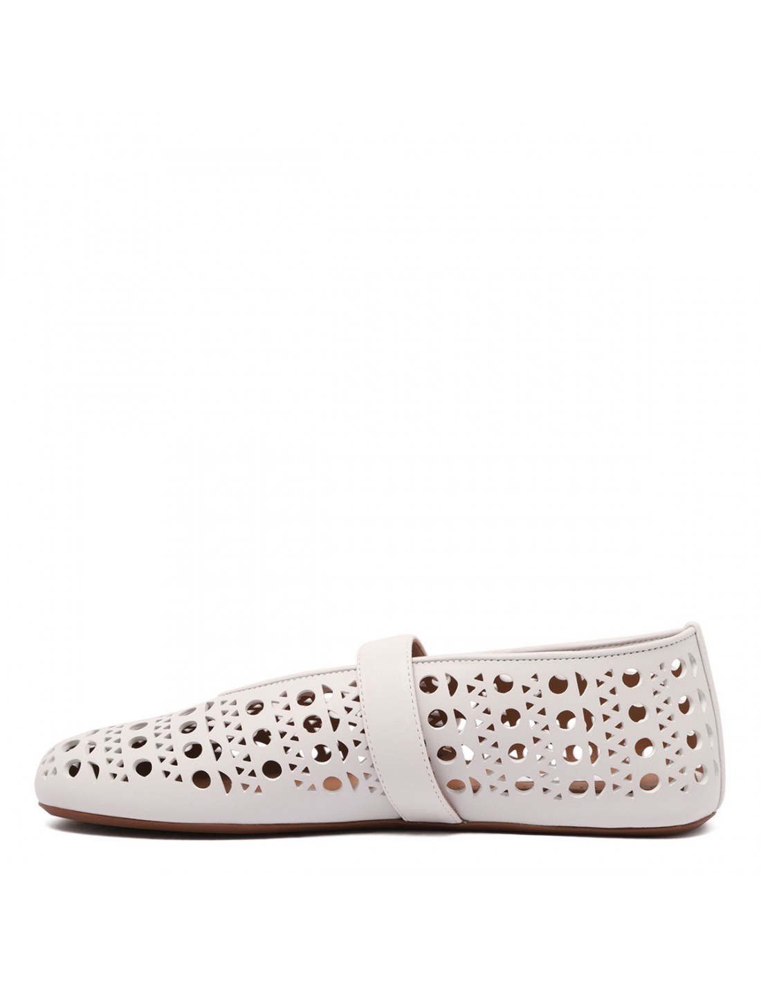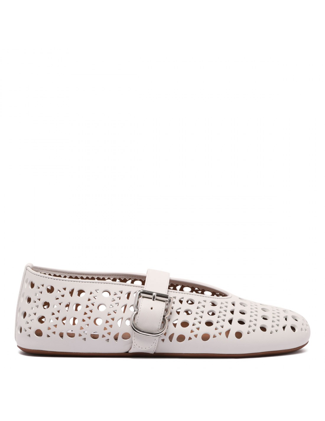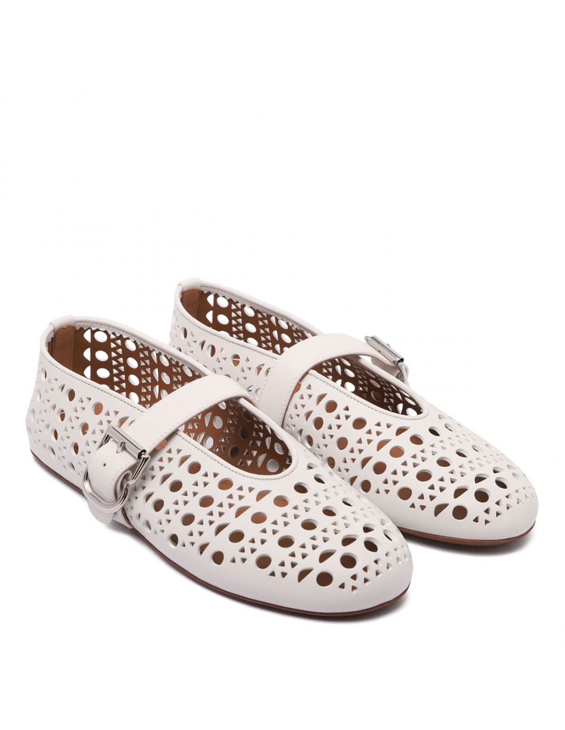 White perforated leather ballerinas from Alaia featuring Vienne motif, strap with buckle fastening, round toe, leather insole, rubber sole. Inspired by classical Japanese shoes.