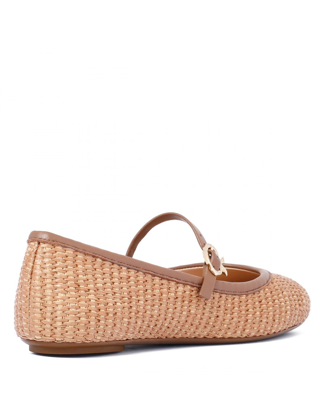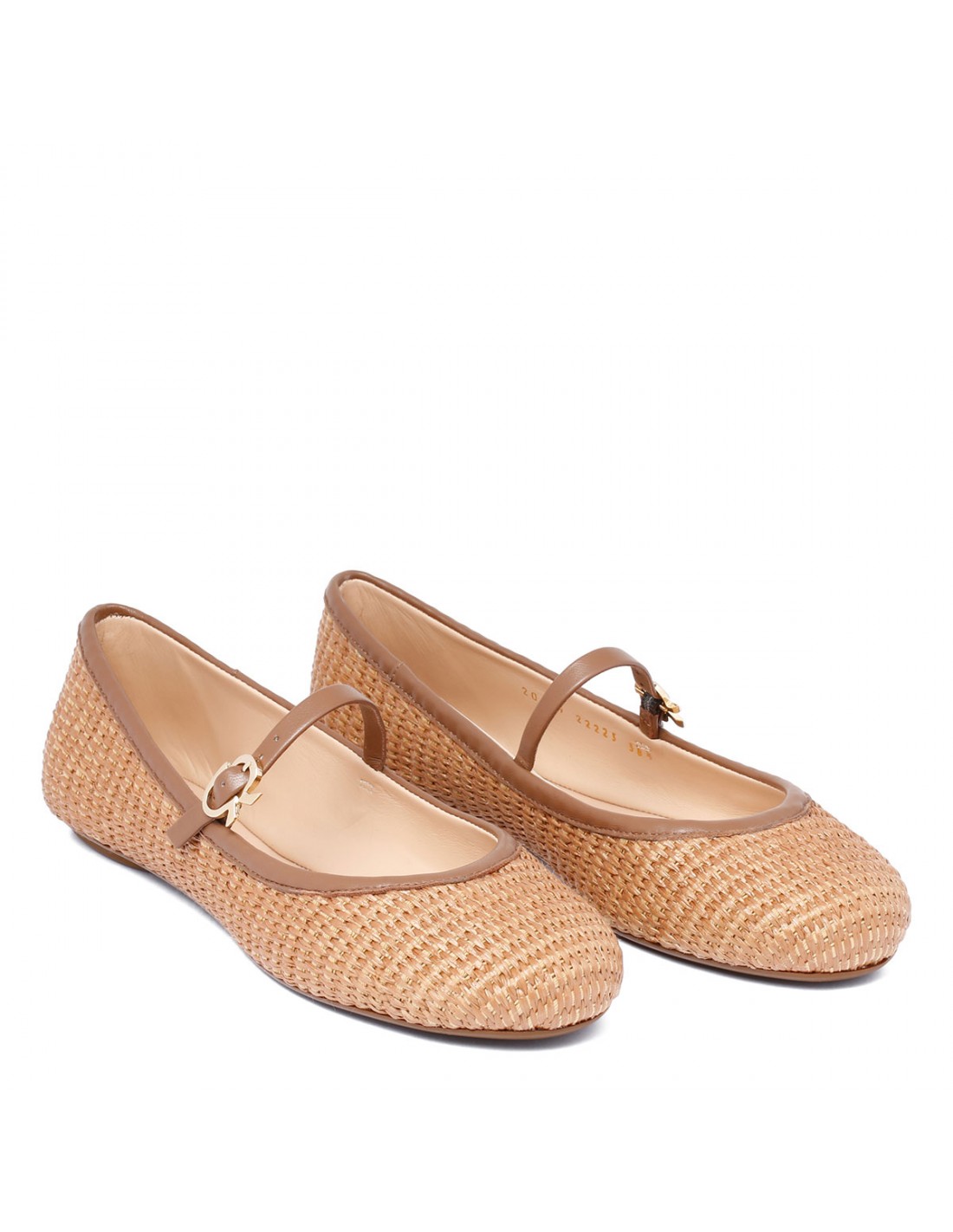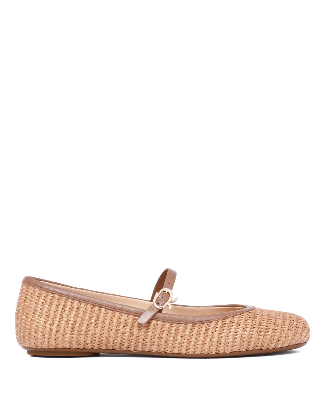 Tan hue leather and woven raffia fabric Carla flat ballerinas from Gianvito Rossi featuring Mary Jane strap with iconic Ribbon buckle closure, round toe, leather insole and rubber sole.