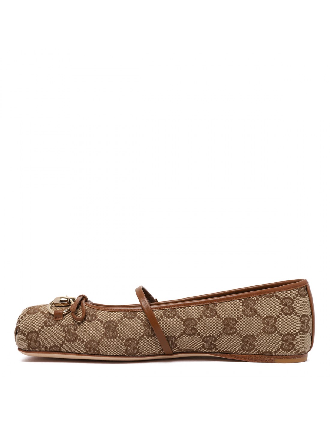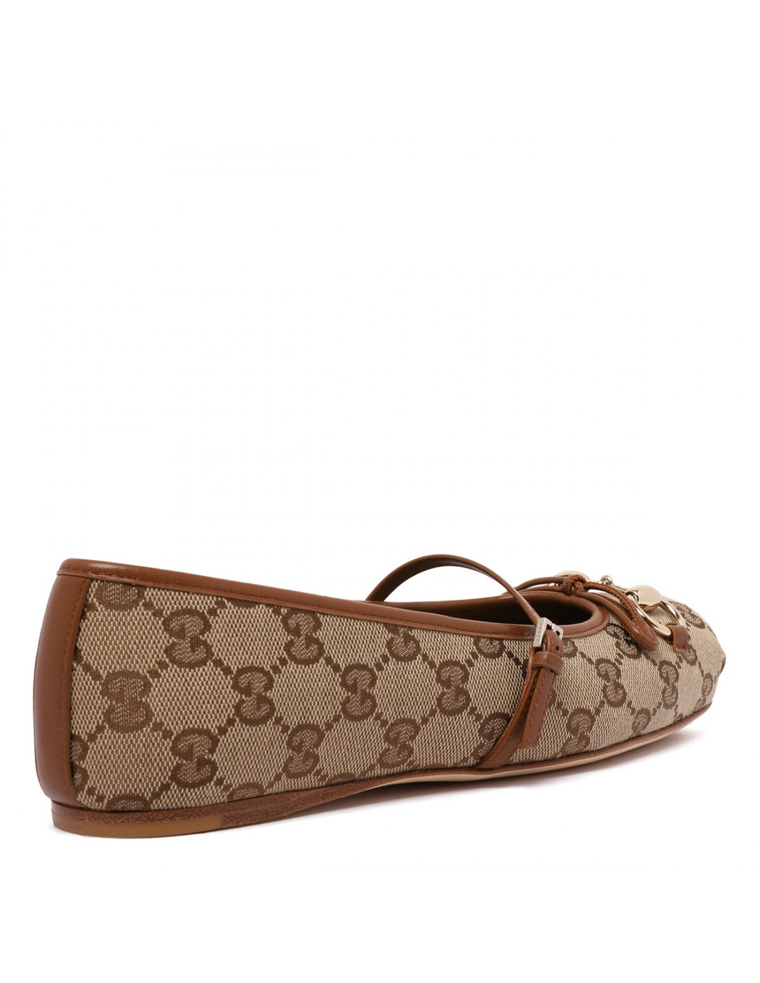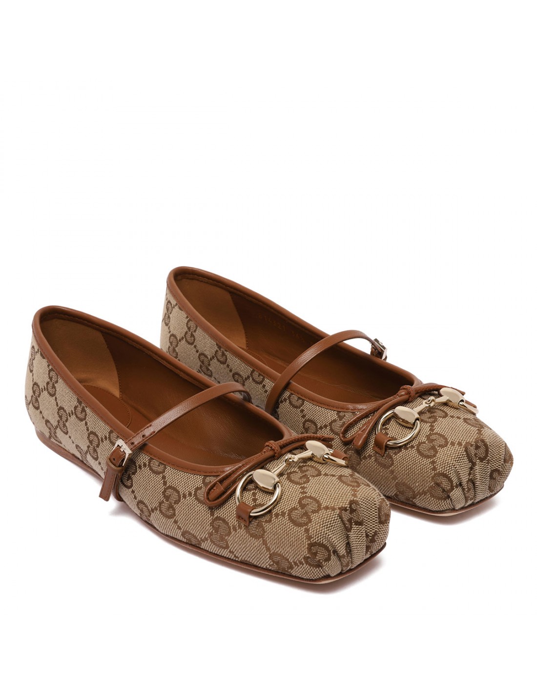 Beige and dark brown Original canvas ballerinas from Gucci featuring GG motif, light gold-toned Horsebit and hardware, leather bow detail, Sacchetto construction, leather strap closure with adjustable buckle, leather lining, soft padded insole, leather sole.