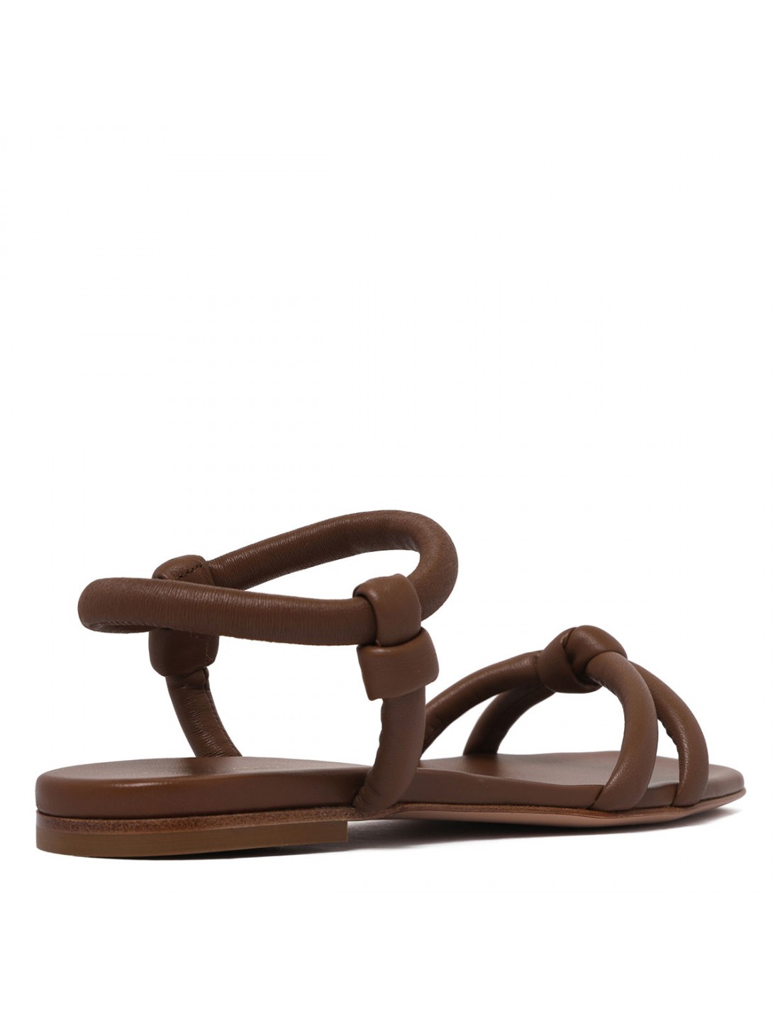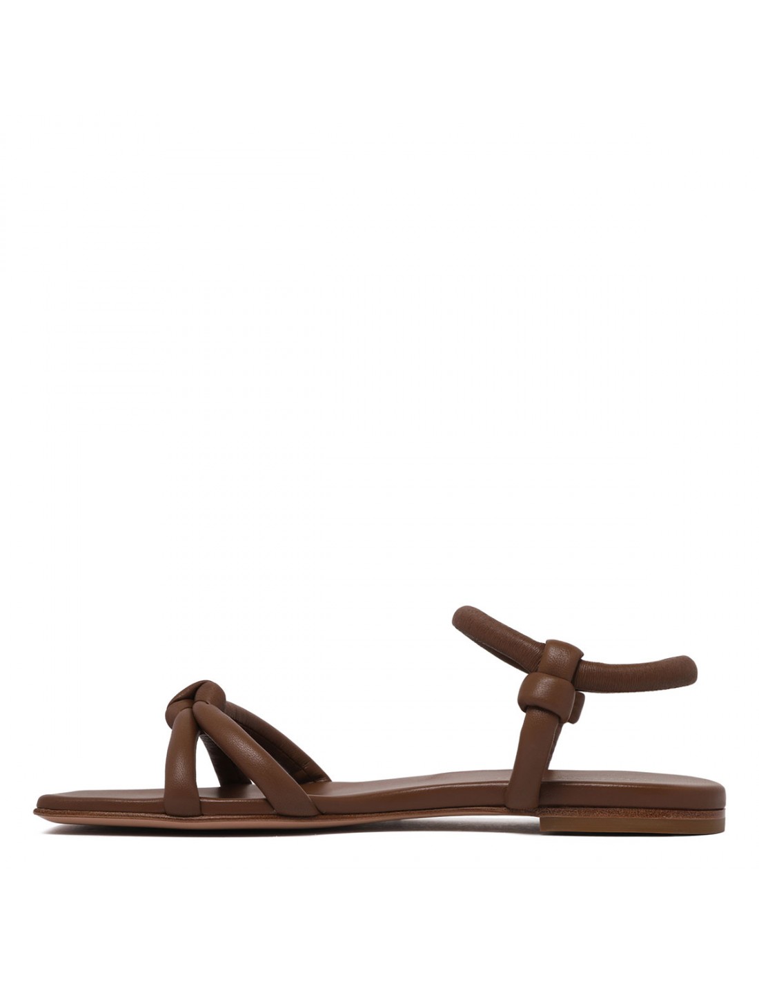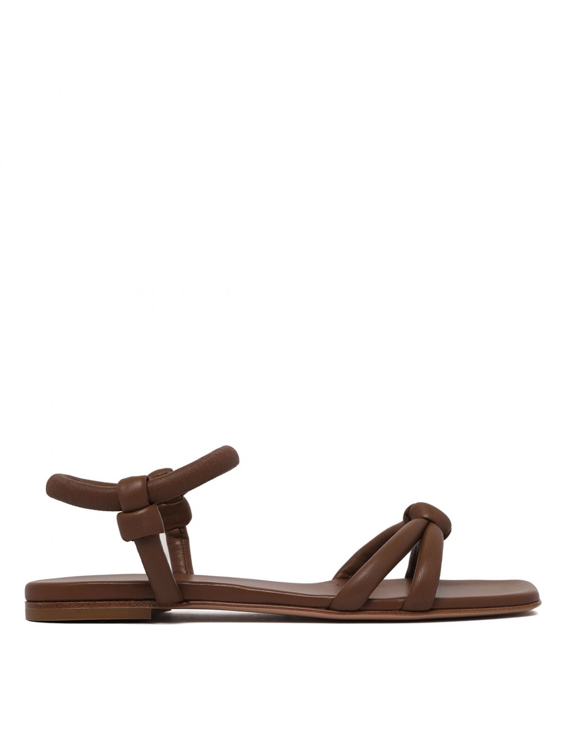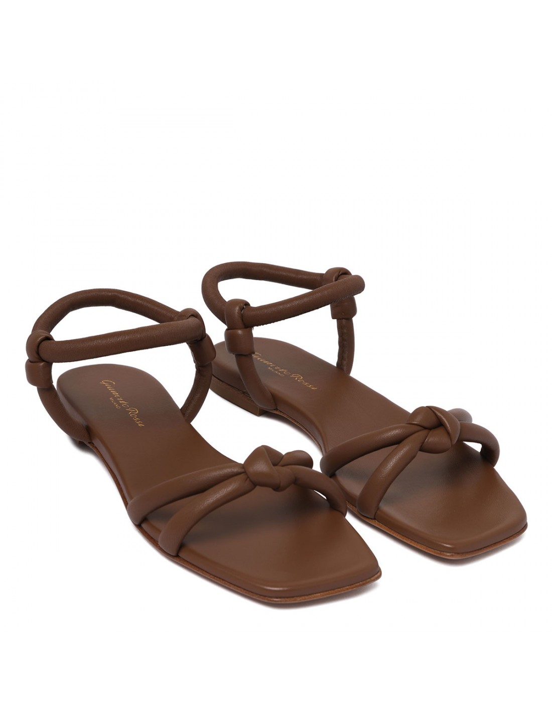Brown leather Juno 05 sandals from Gianvito Rossi featuring tubular upper straps with knotted details, round tubular elastic ankle strap, open square toe, low stack heel, leather insole and sole.