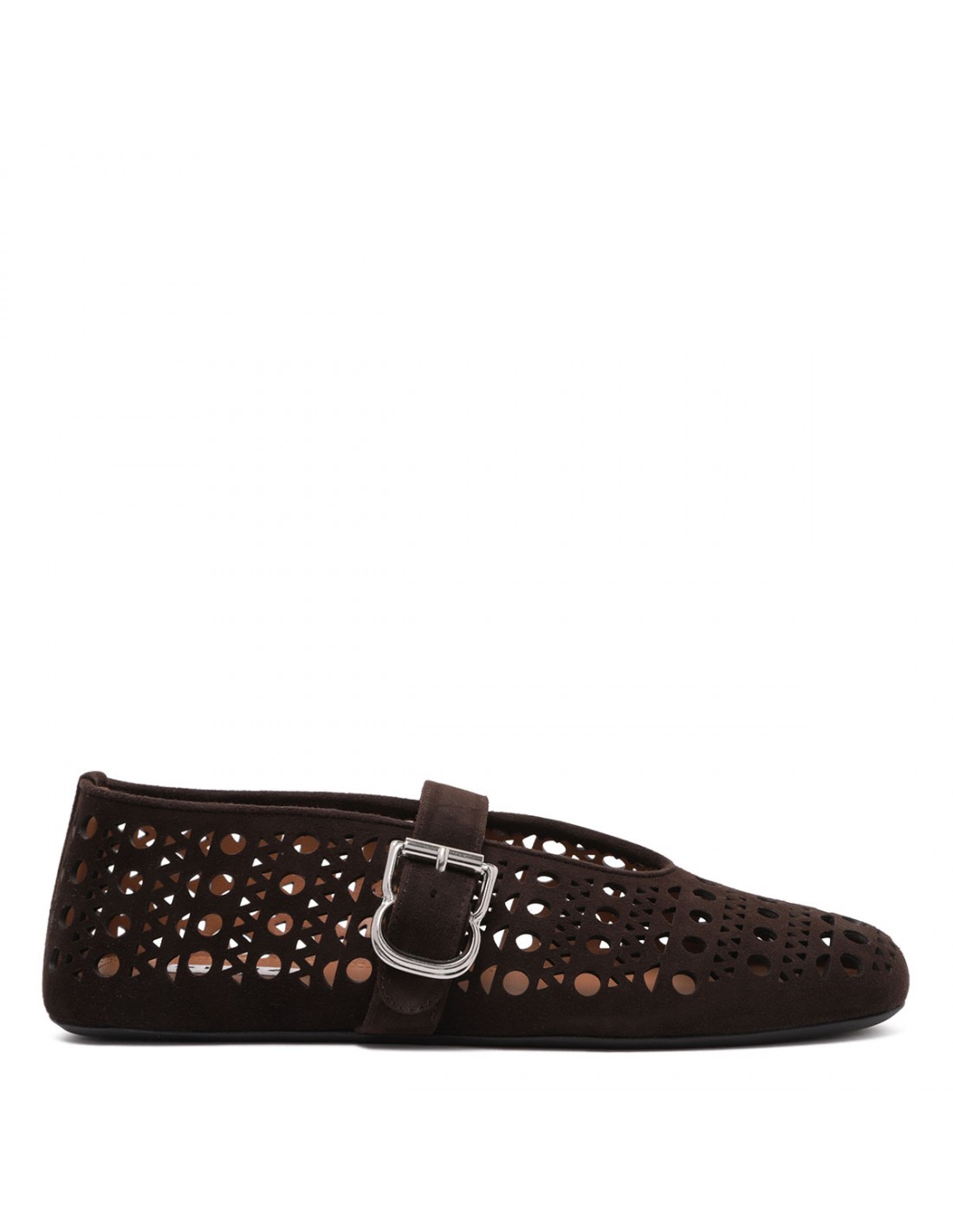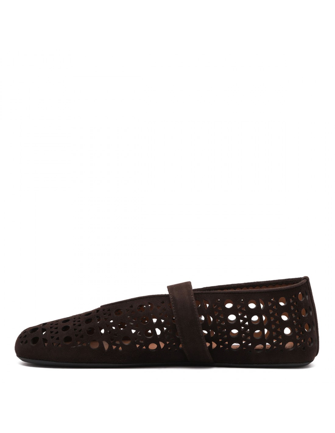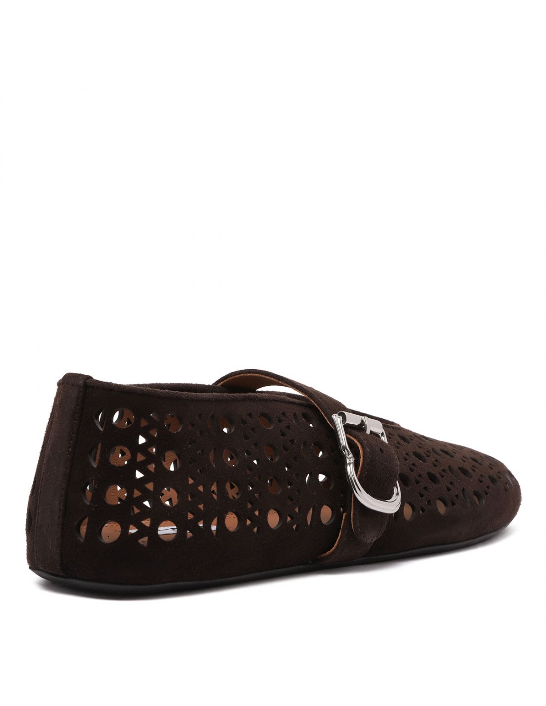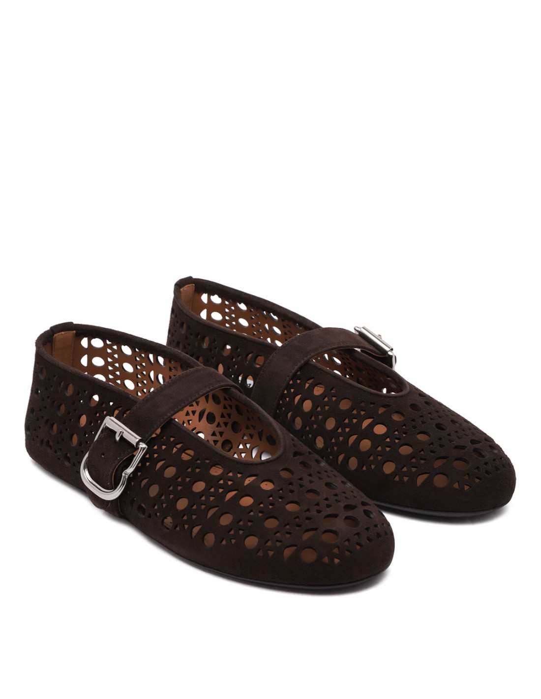 Brown suede ballerinas from Alaia featuring perforated Vienne motif, strap with buckle fastening, round toe, leather insole and rubber sole.