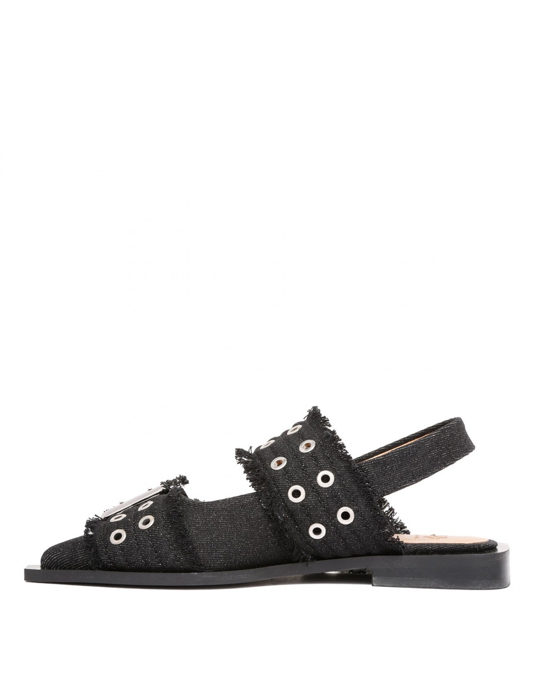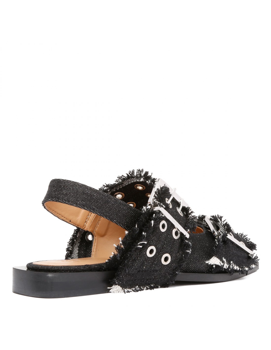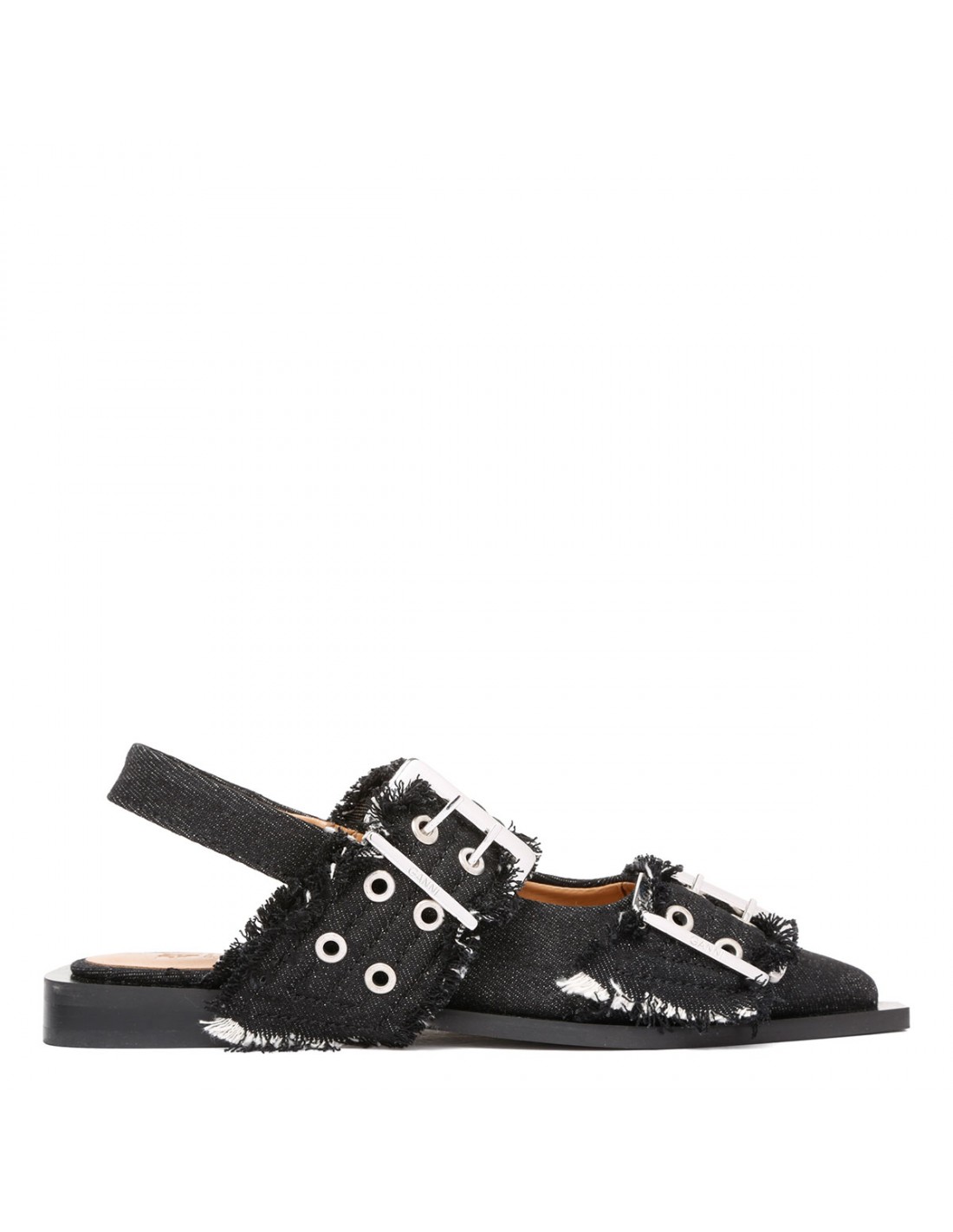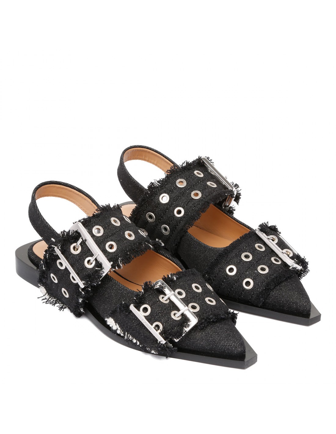 Black denim Feminine Buckle ballerinas from Ganni featuring raw fringed edges, two silver-tone buckles with signature eyelets, pointed toe, squared low block heel, slingback strap.