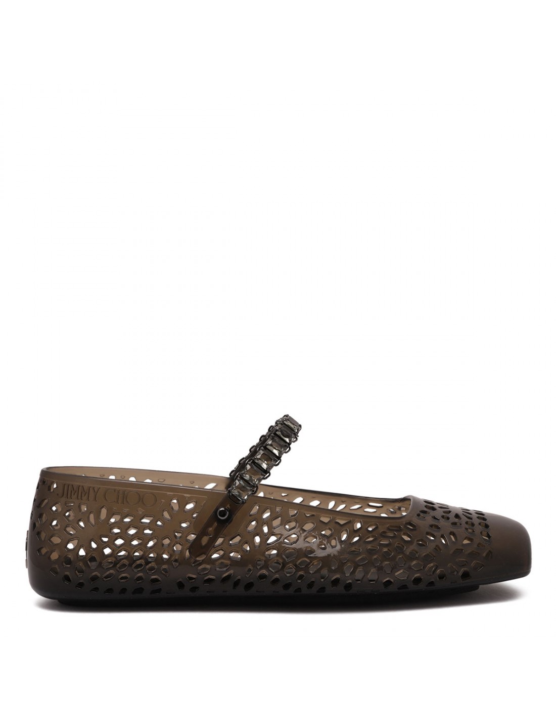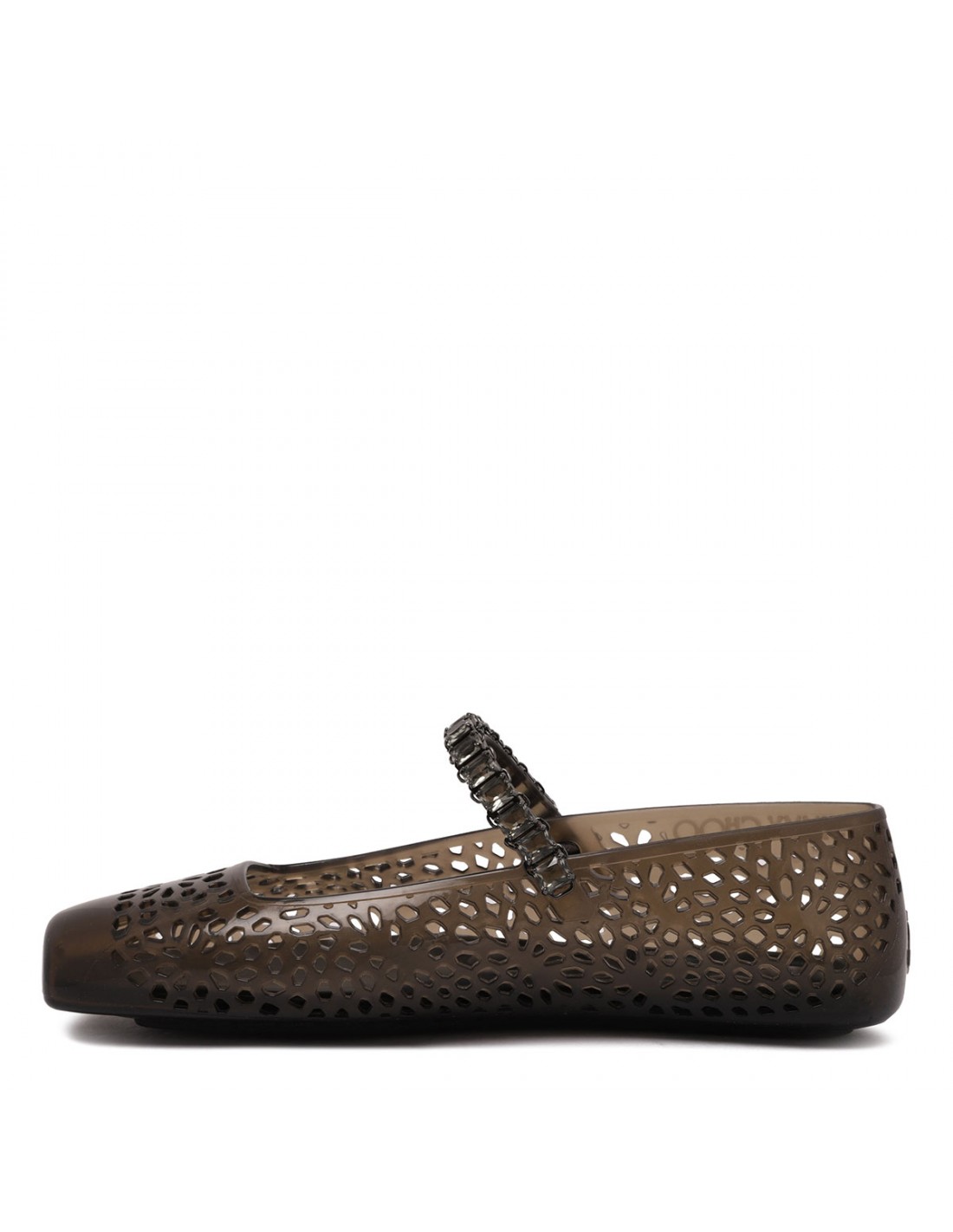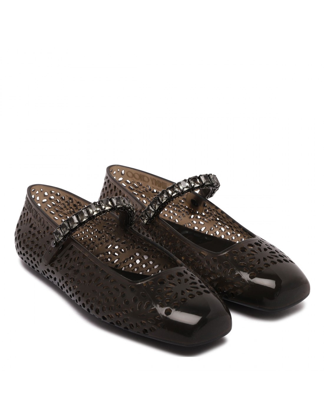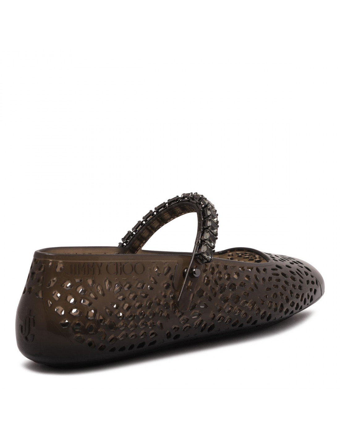 Black-smoke transparent TPU The Jelly ballerinas from Jimmy Choo featuring cut-out design inspired by lacework, detachable crystal-embellished strap, squared toe, soft foam footbed, debossed logo.