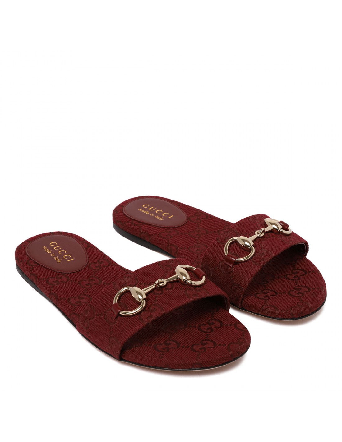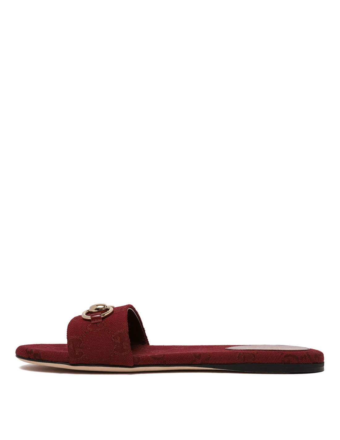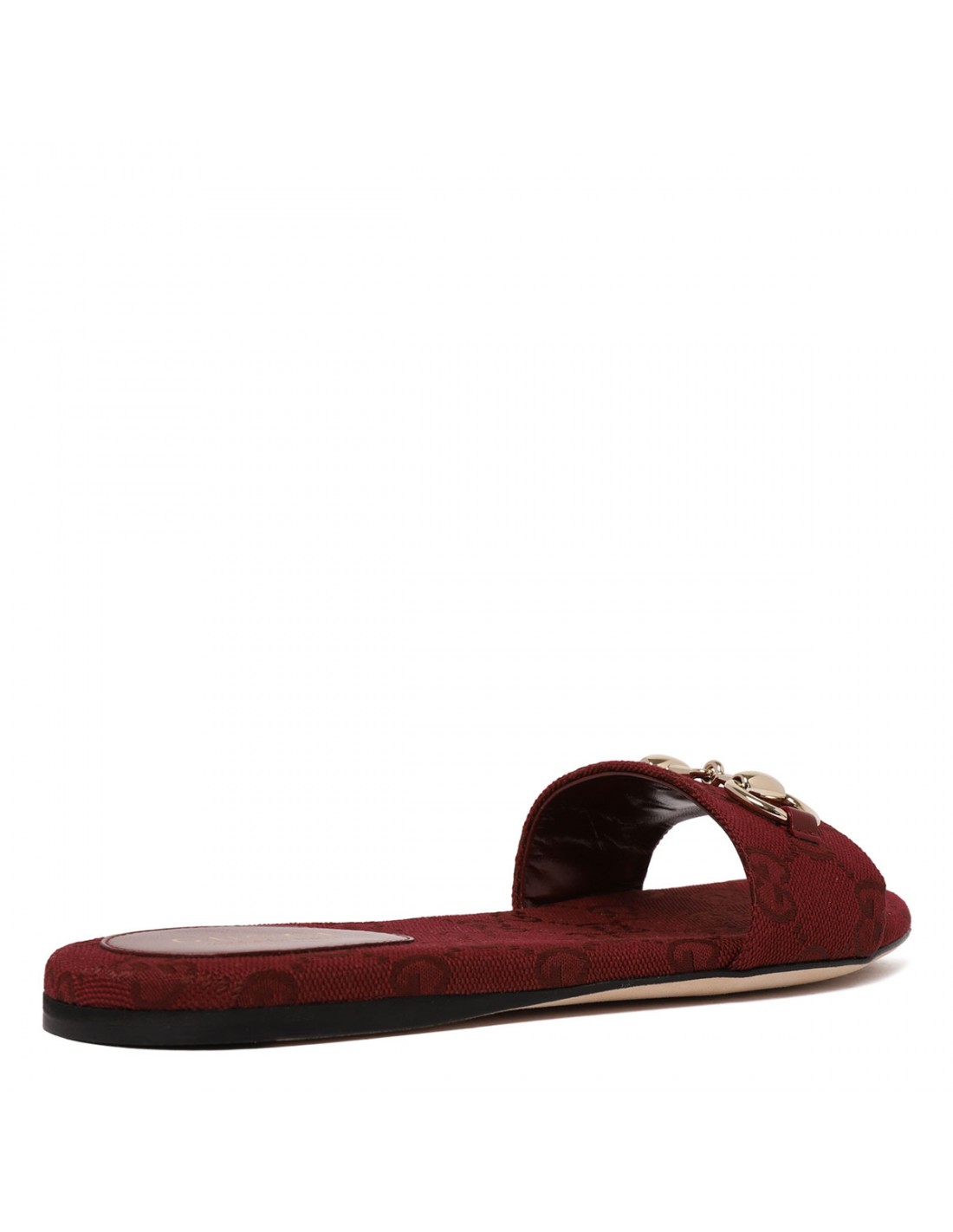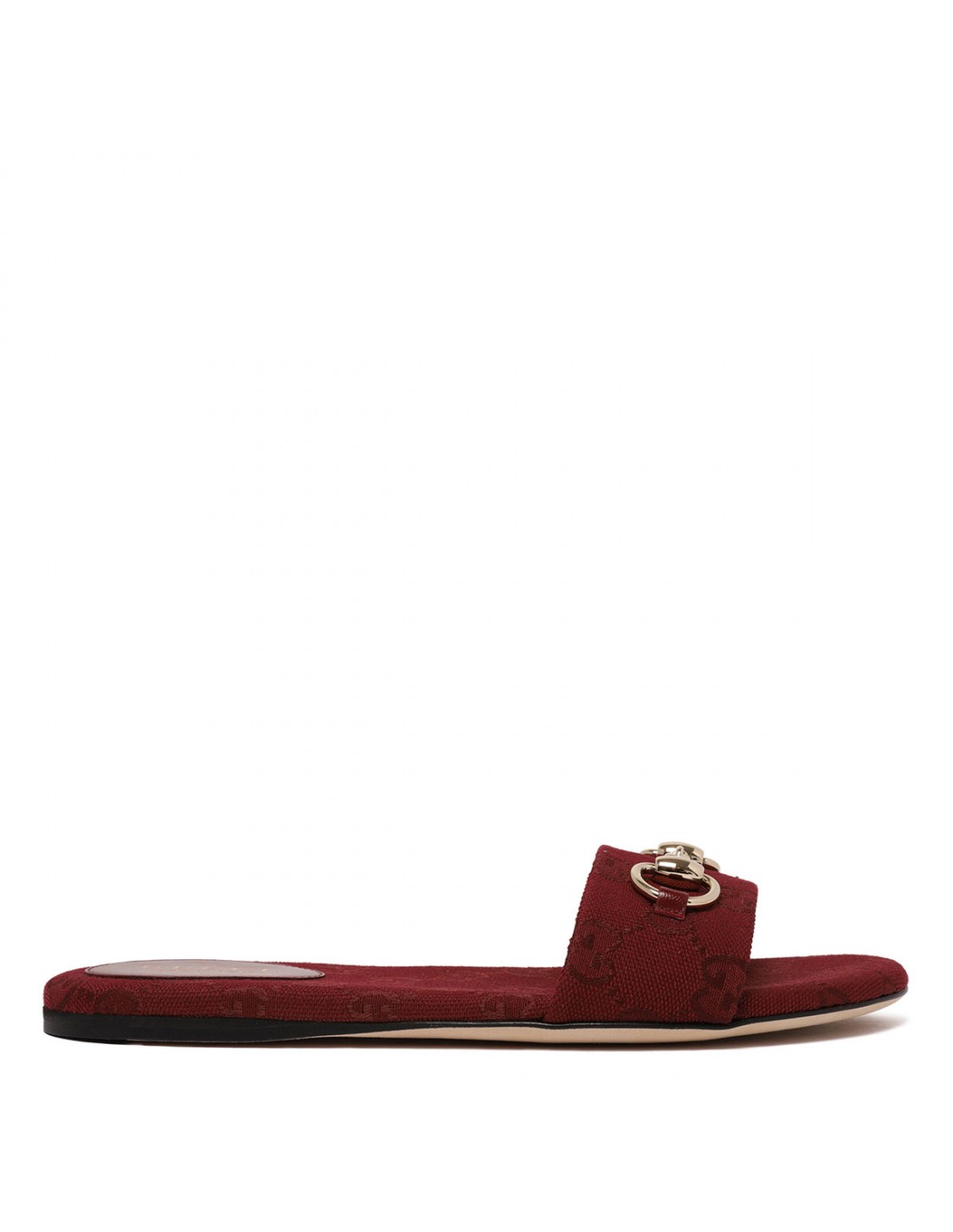 Rosso Ancora red canvas slide sandals from Gucci featuring GG motif, light gold-toned Horsebit and hardware, leather flat sole.
