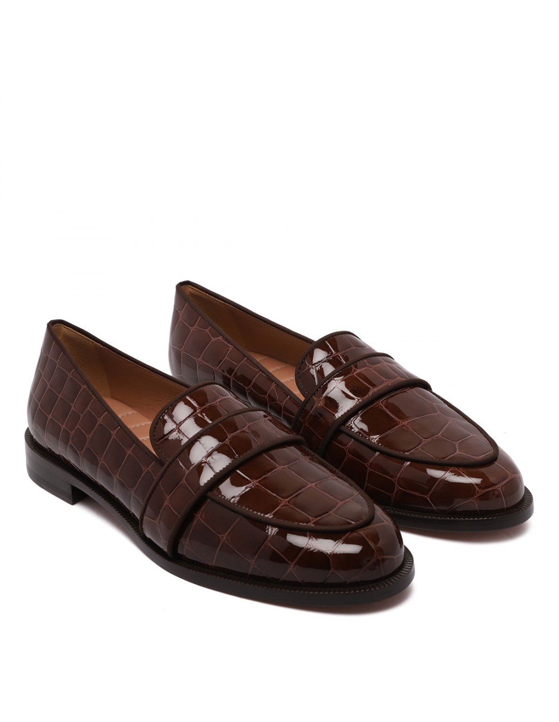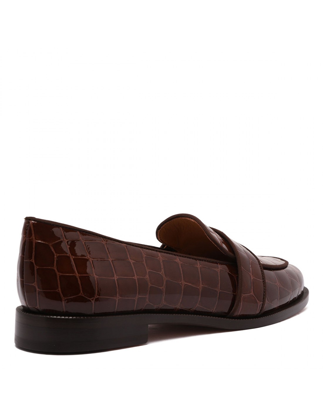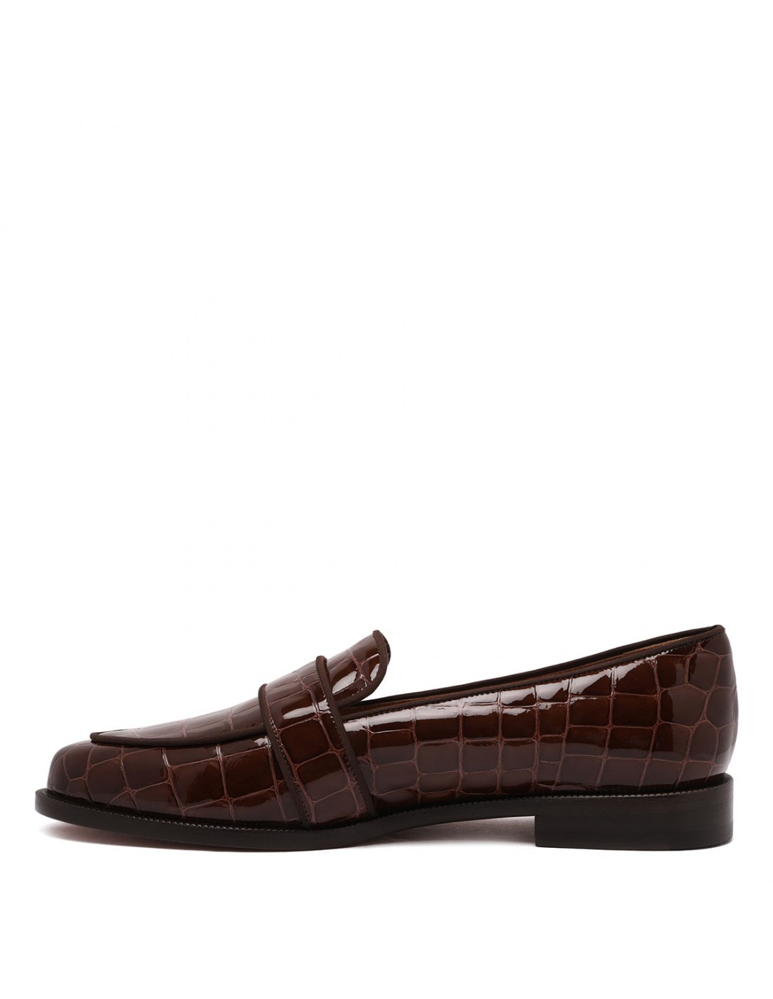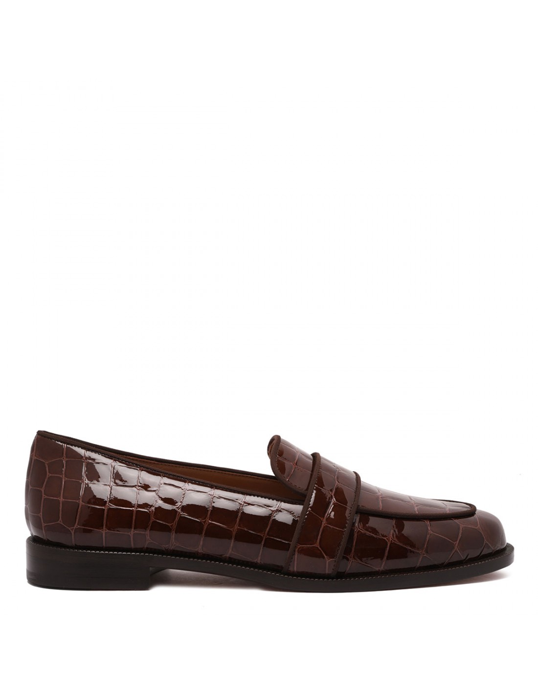 Espresso hue croc-embossed patent leather Martin mocassins from Aquazzura featuring grosgrain trims, notched vamp, rounded toe, padded leather insole and leather outsole.