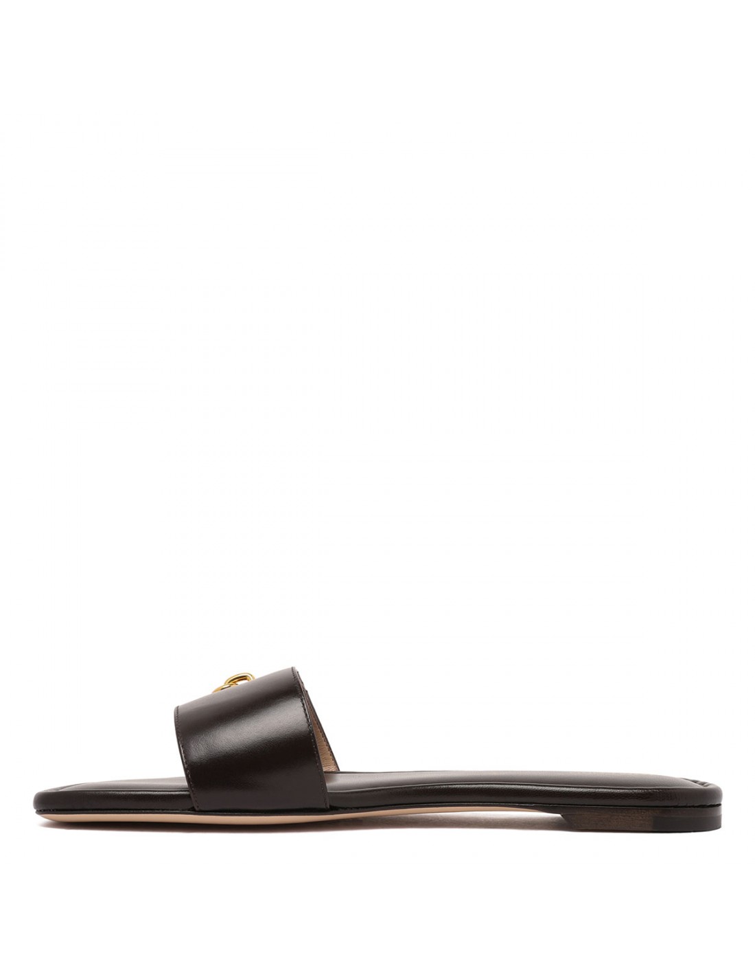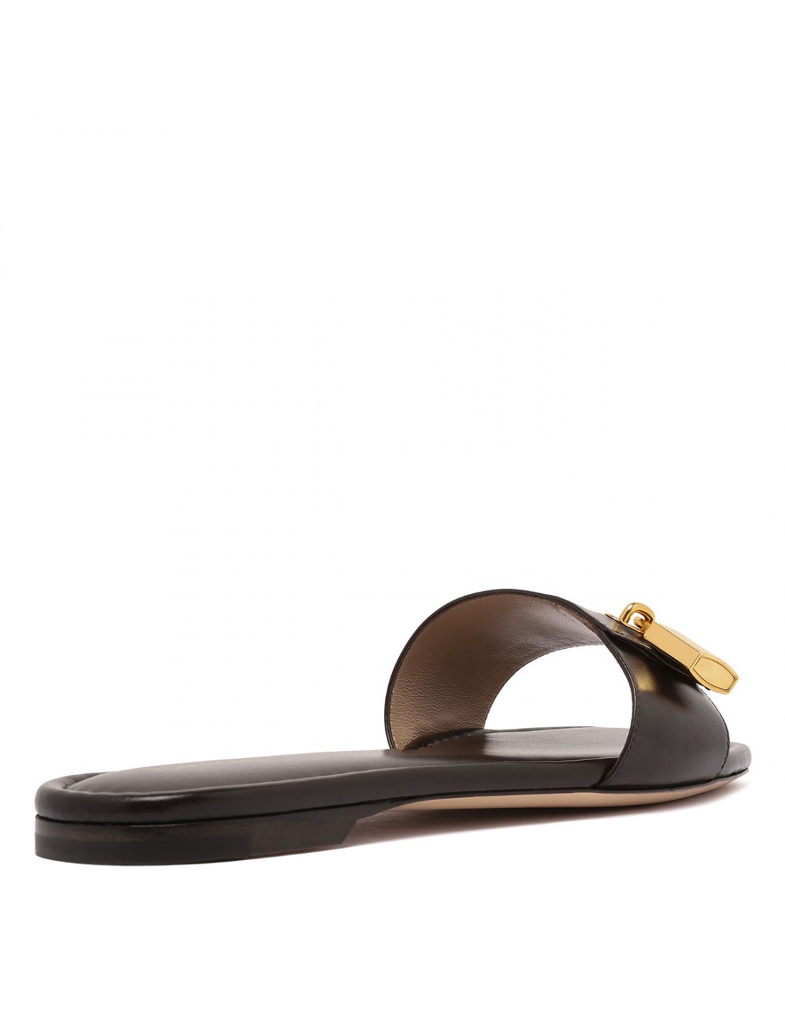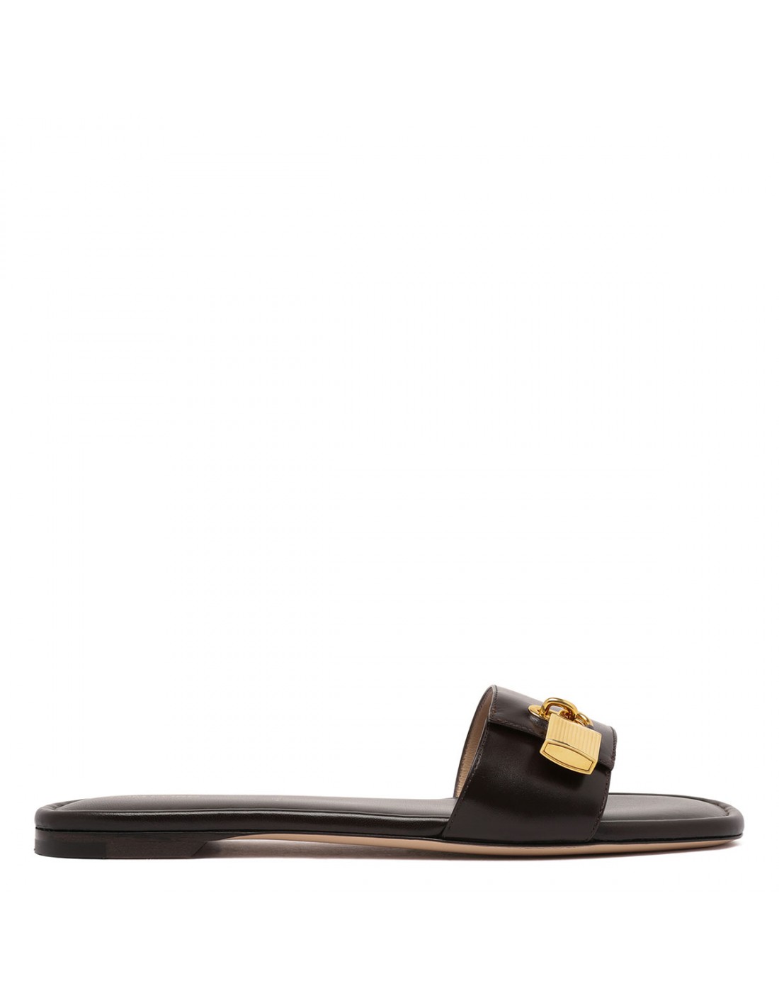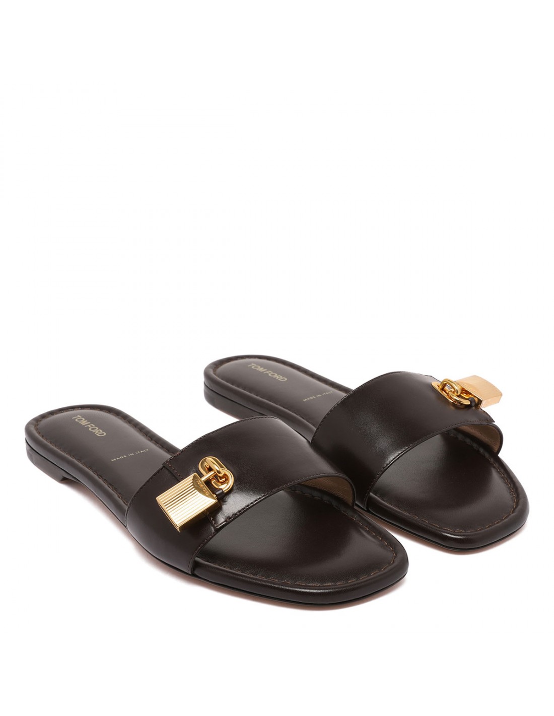 Espresso hue leather slide sandals from Tom Ford featuring gold-tone padlock embellishment on upper, square open toe, flat heel, padded insole, leather sole.