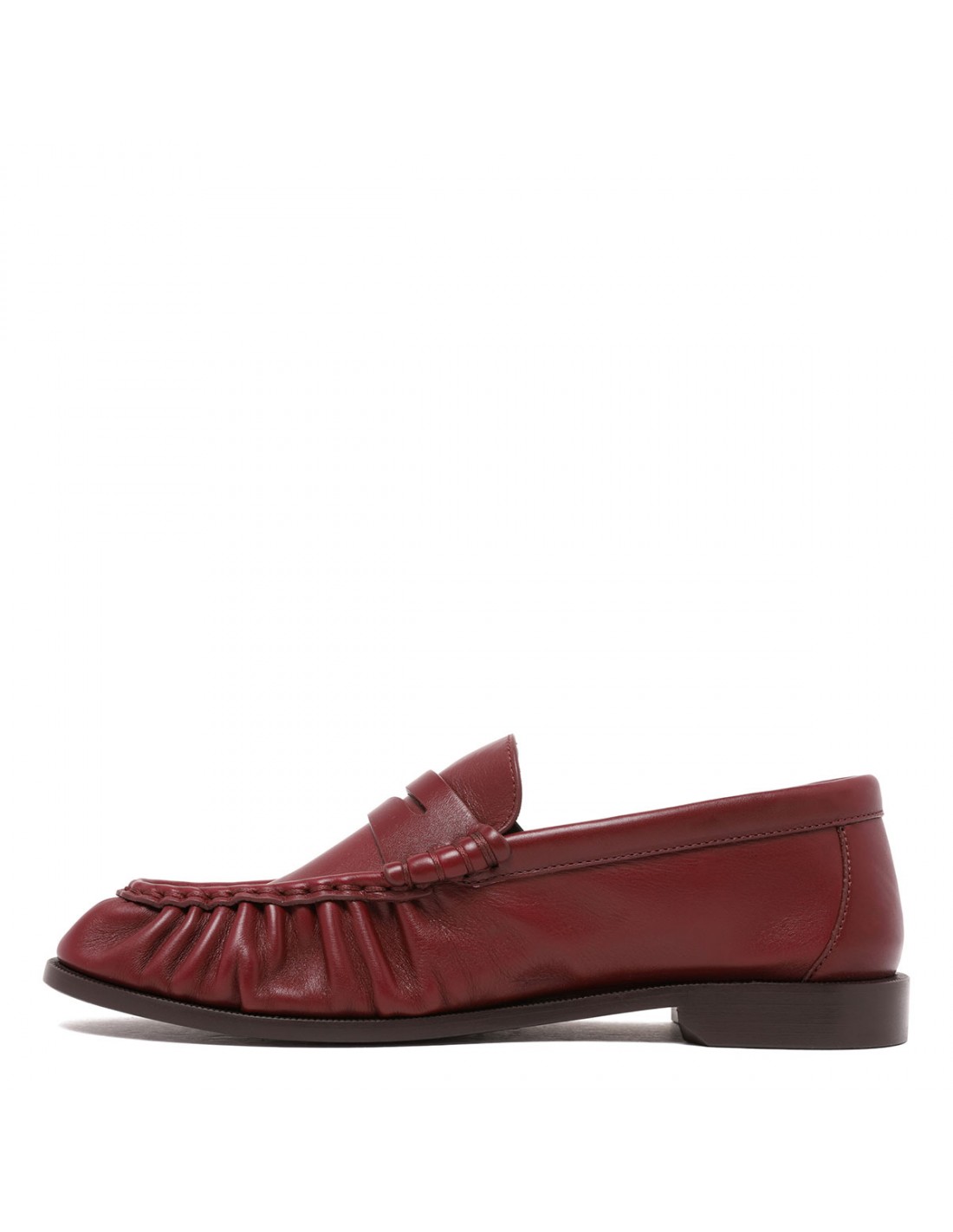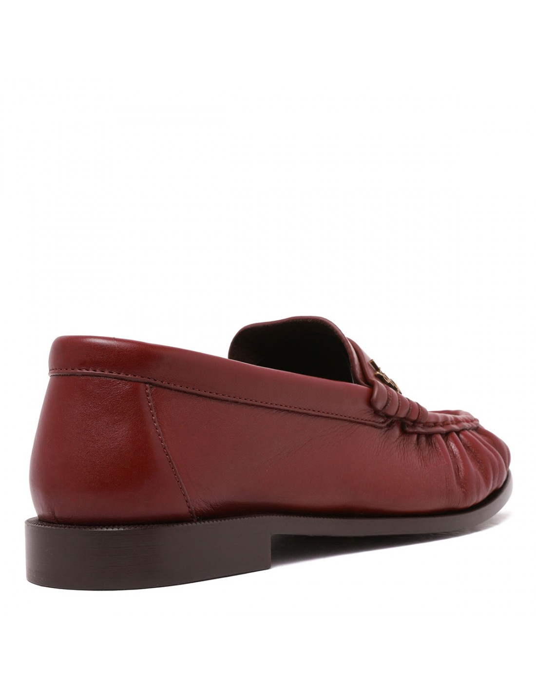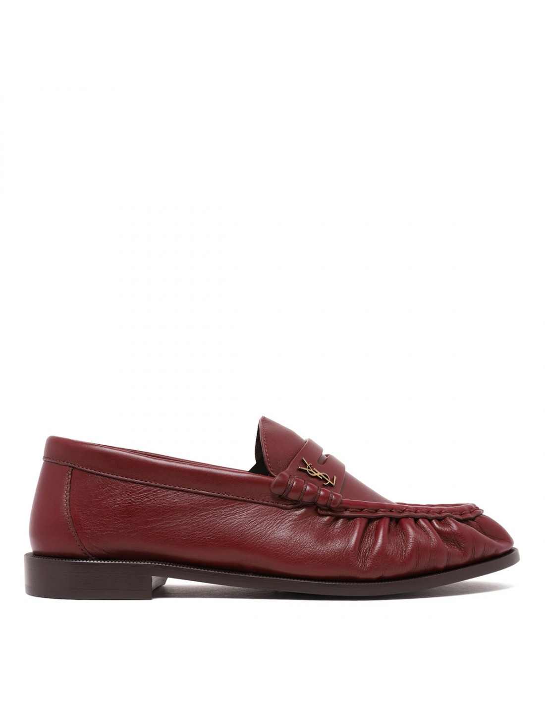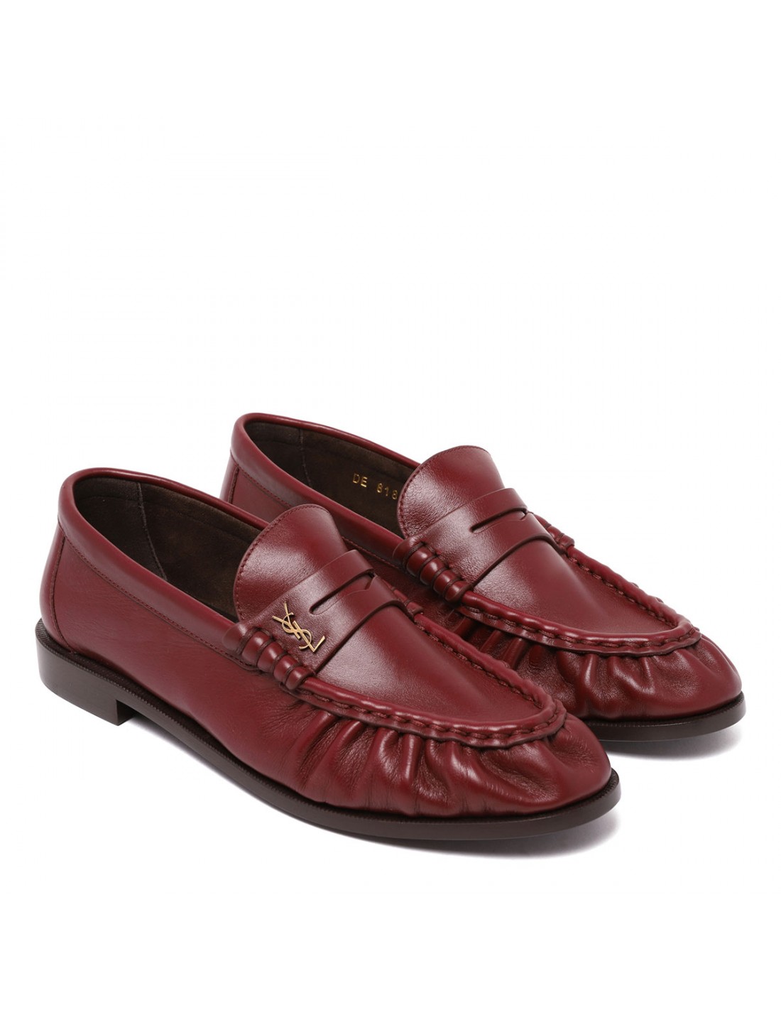 Dark ruby hue smooth leather Penny loafers from Saint Laurent featuring Cassandre detail, hand-stitched almond moc toe, leather lining and sole.