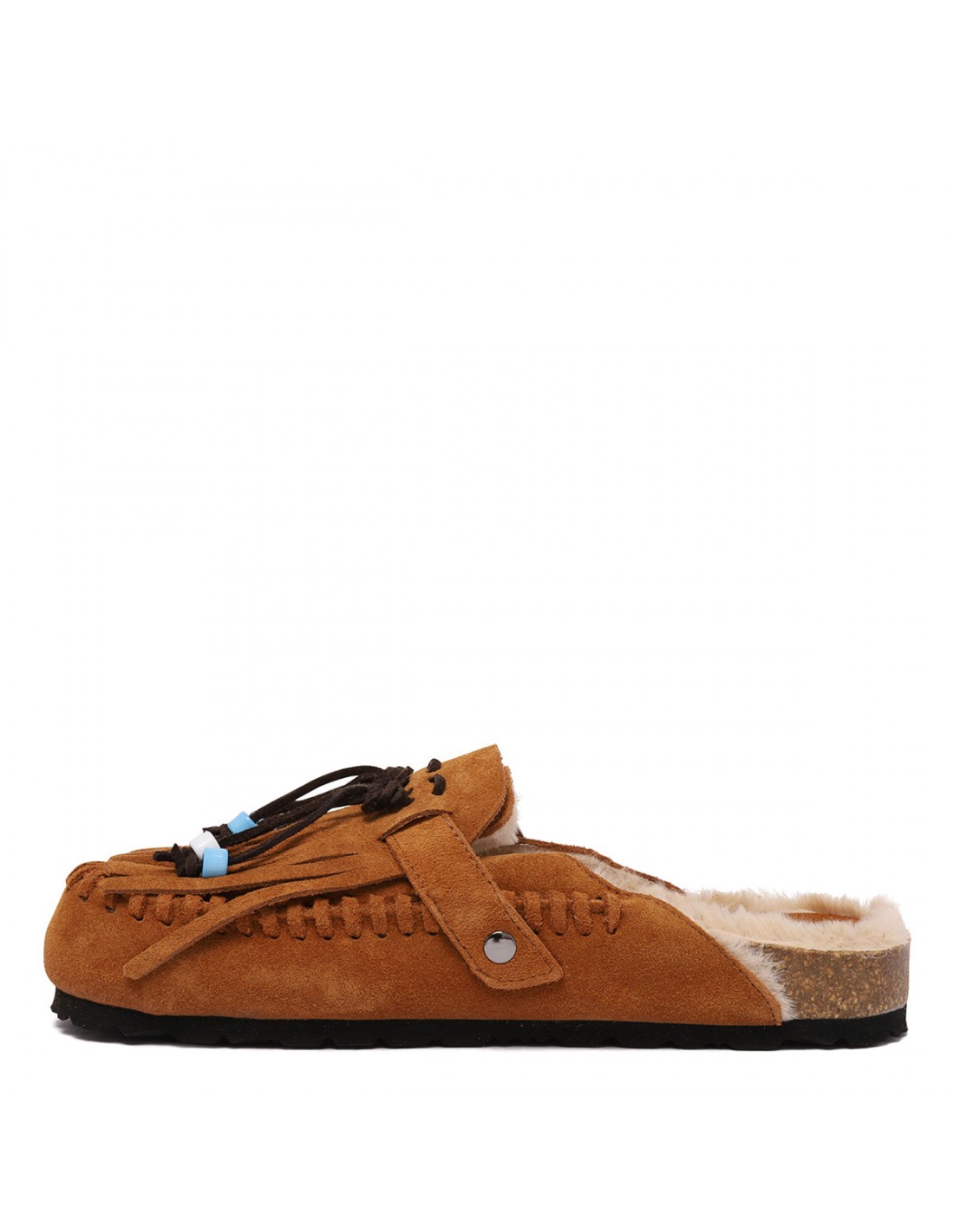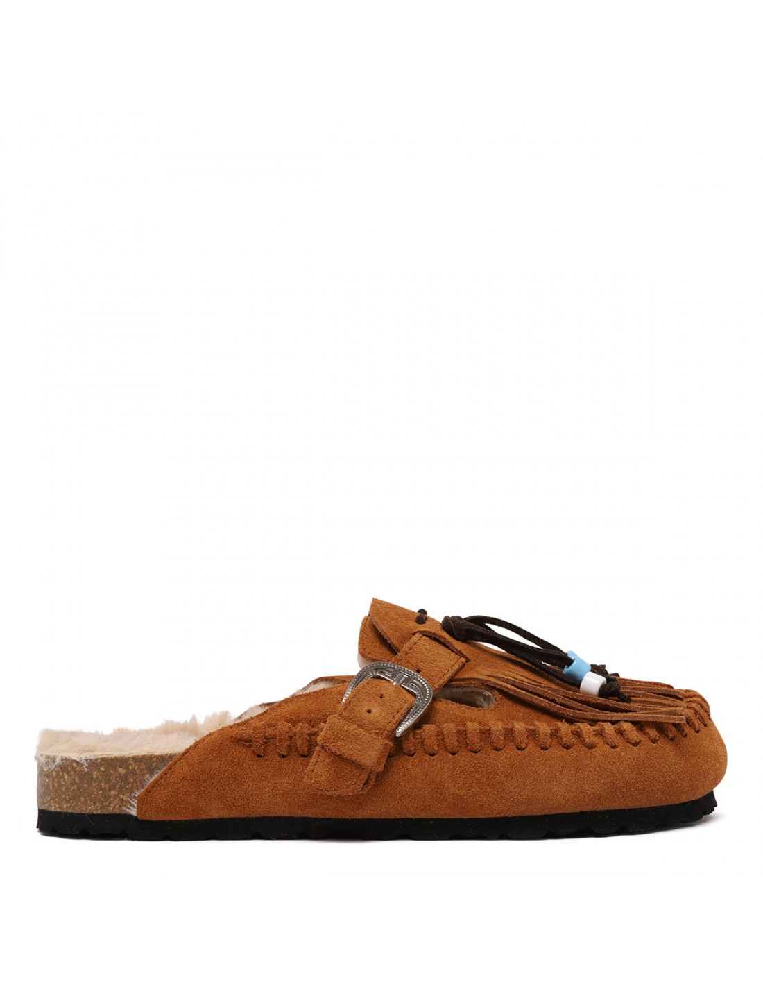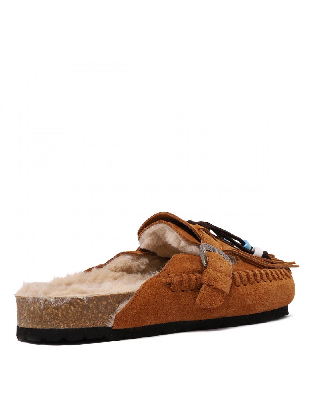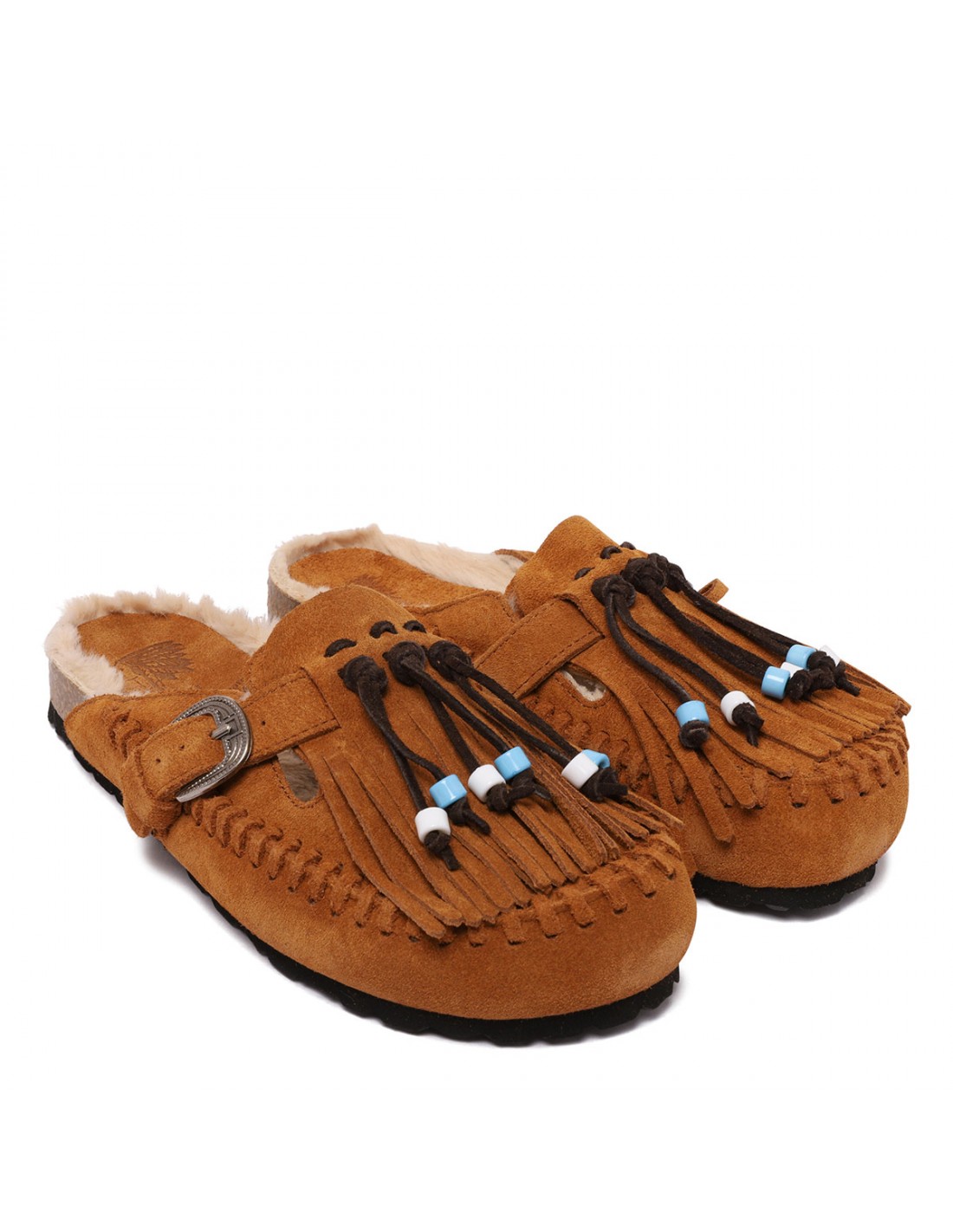 Tan hue suede Caribe mules from Taju featuring fringes with colored beads, one textured silver-tone metal buckle, slip on design, calf leather and faux fur lining, anatomical sole.