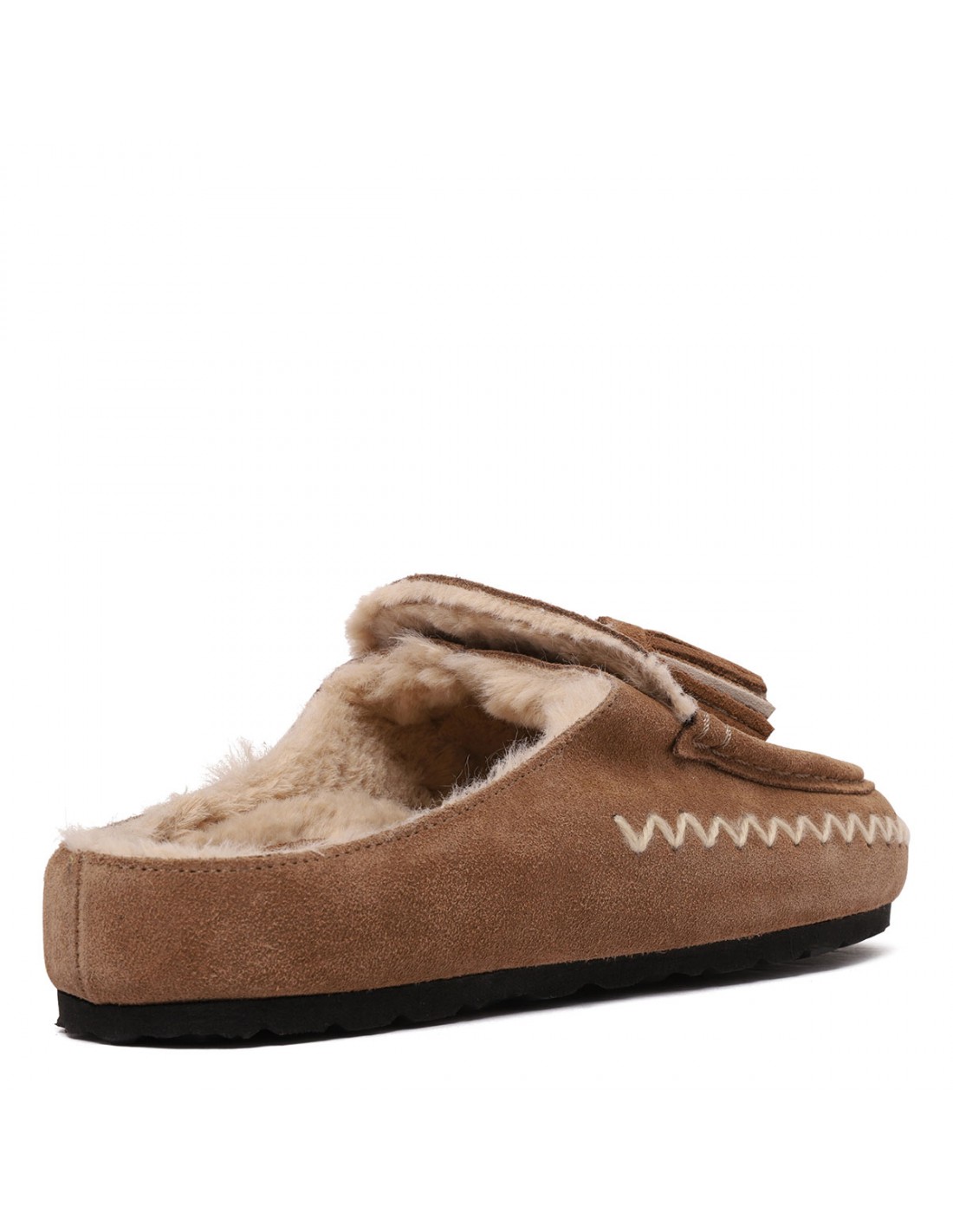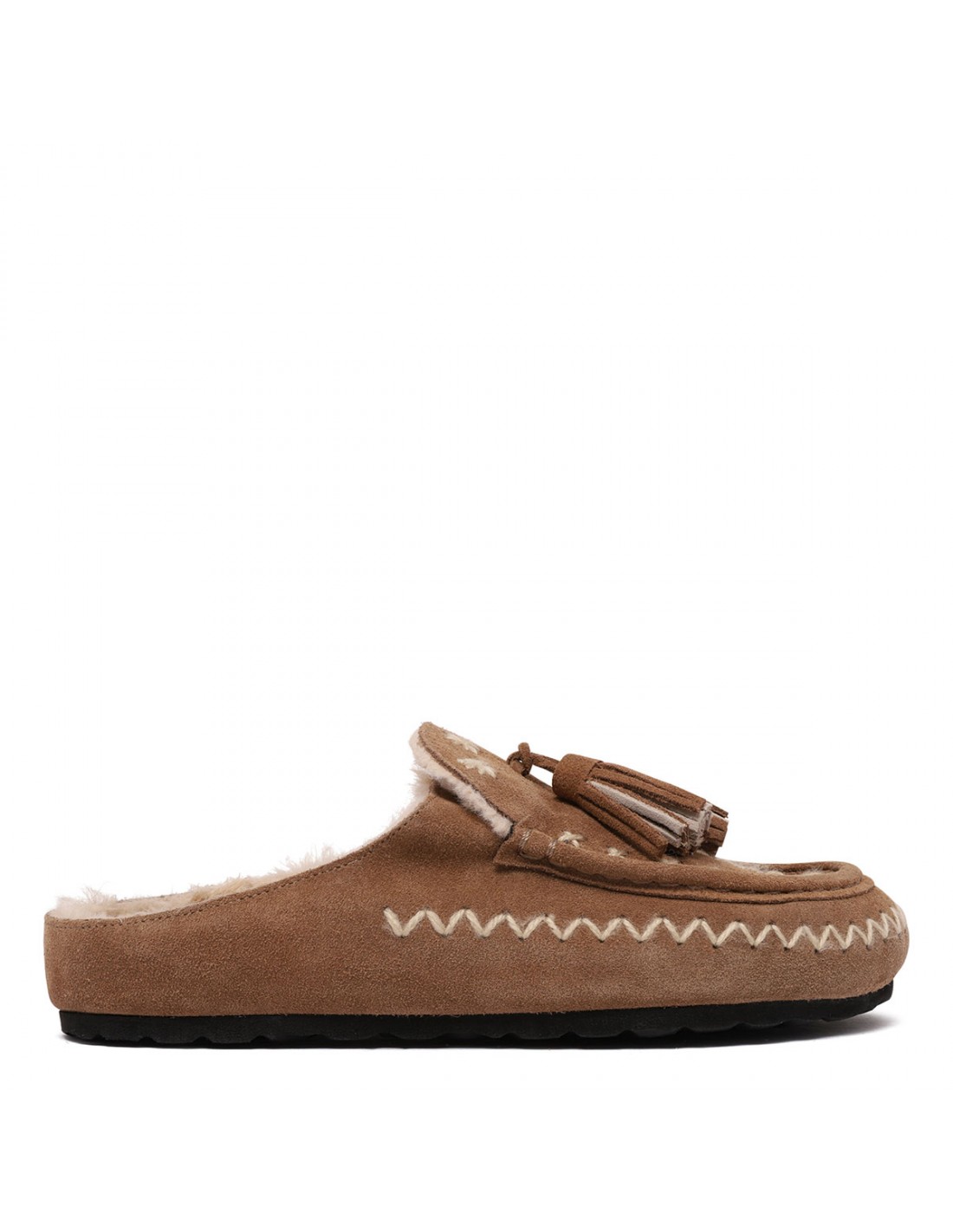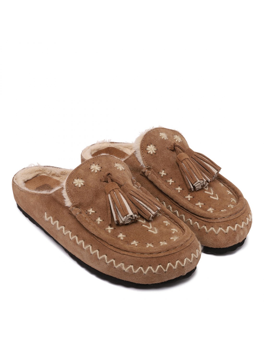 Tan hue suede Kai mules from Taju featuring two-tone tassels, contrasting embroideries, slip on design, mocassin stitching, calf leather and faux fur lining, anatomical sole.
