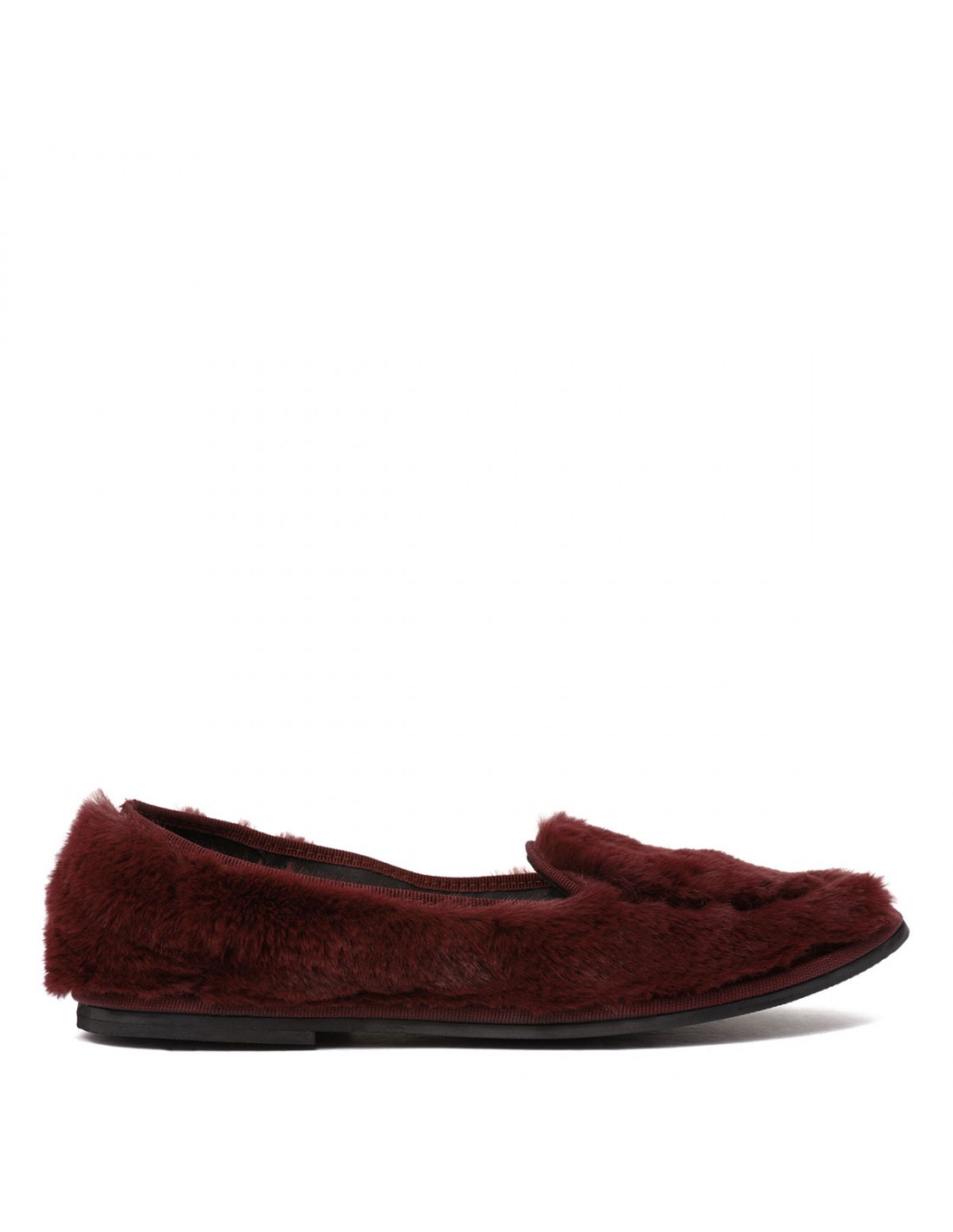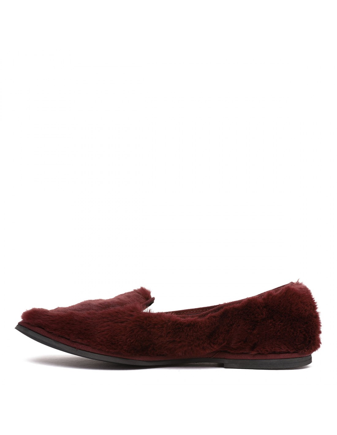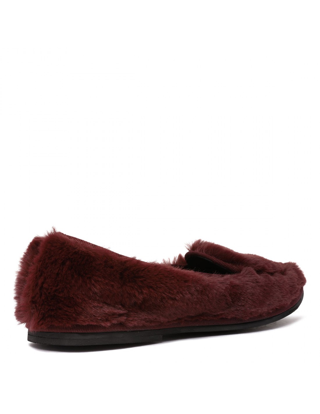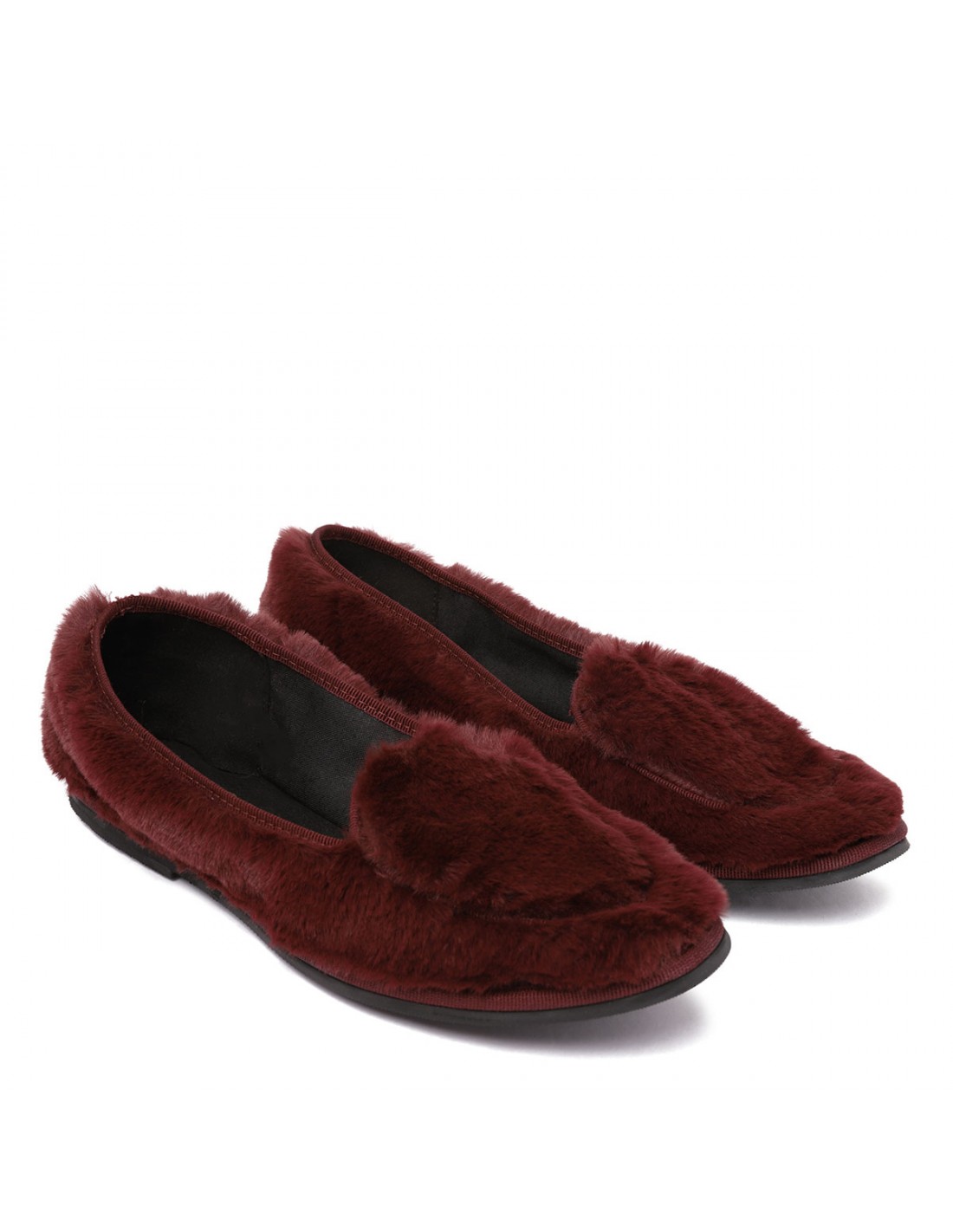 Bordeaux fur-effect loafers from Le Noir featuring round toe, tonal gros-grain trims, flat sole.