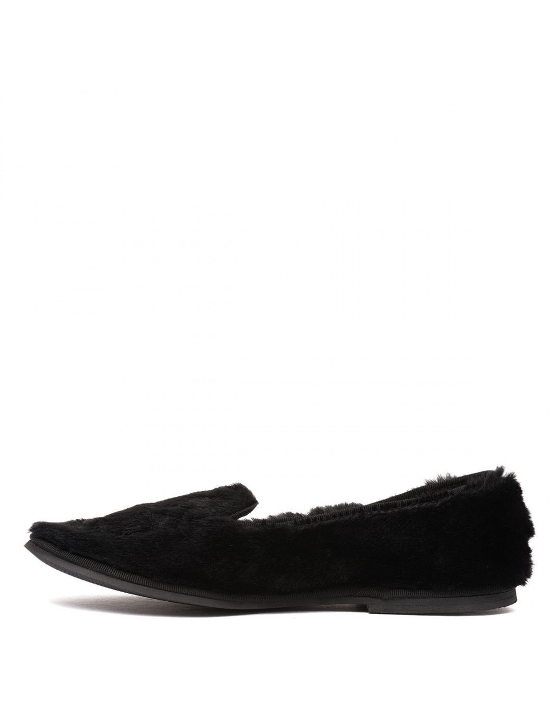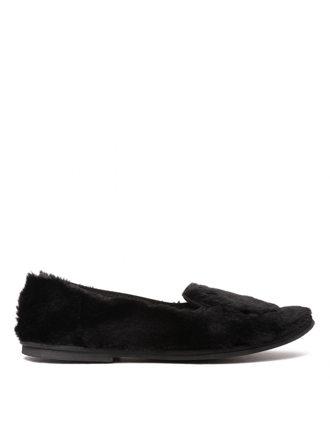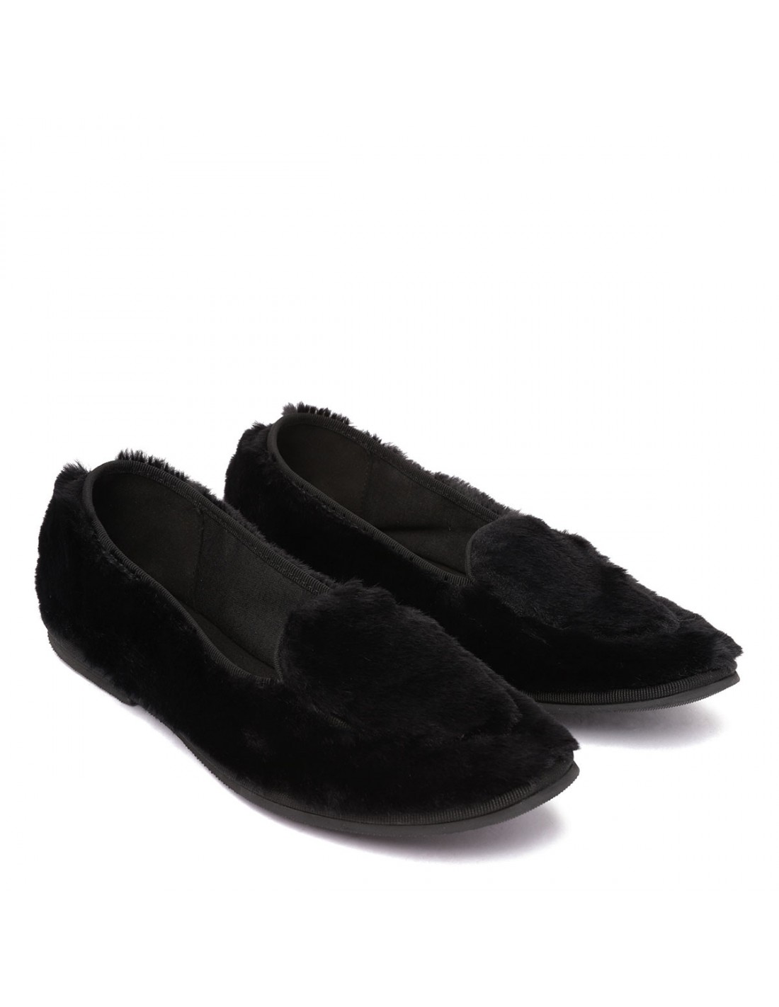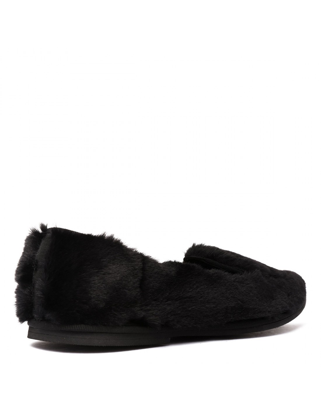 Black fur-effect loafers from Le Noir featuring round toe, tonal gros-grain trims, flat sole.