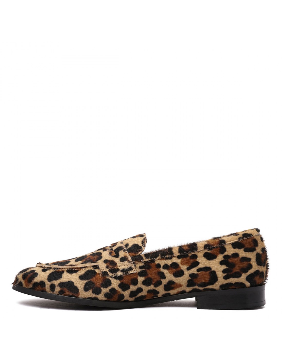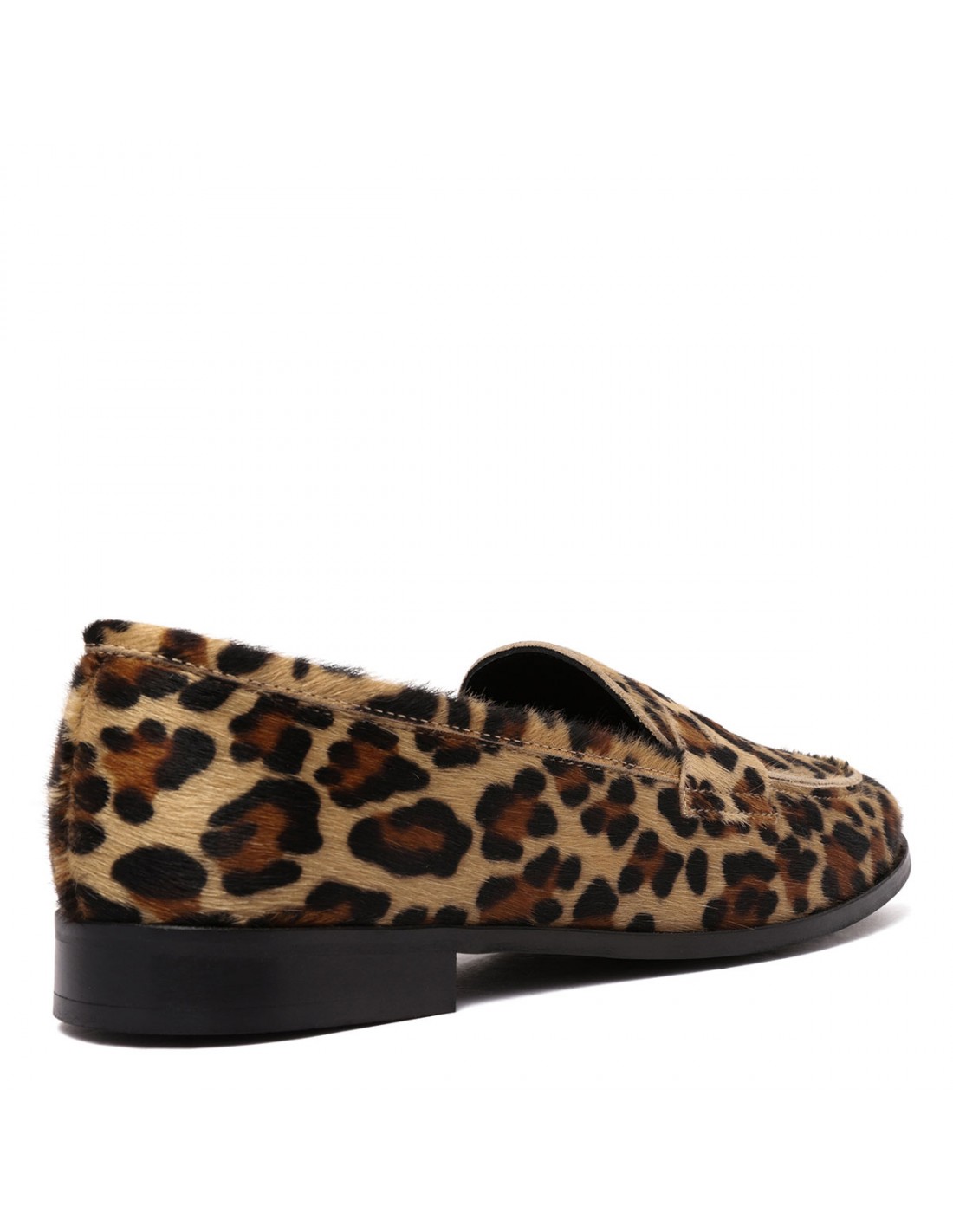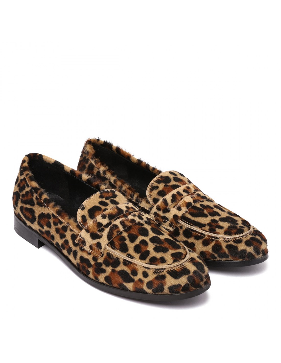 Beige, brown and black calf-hair loafers from Le Noir featuring leopard motif, printed allover, round toe, low heel, leather lining and sole.