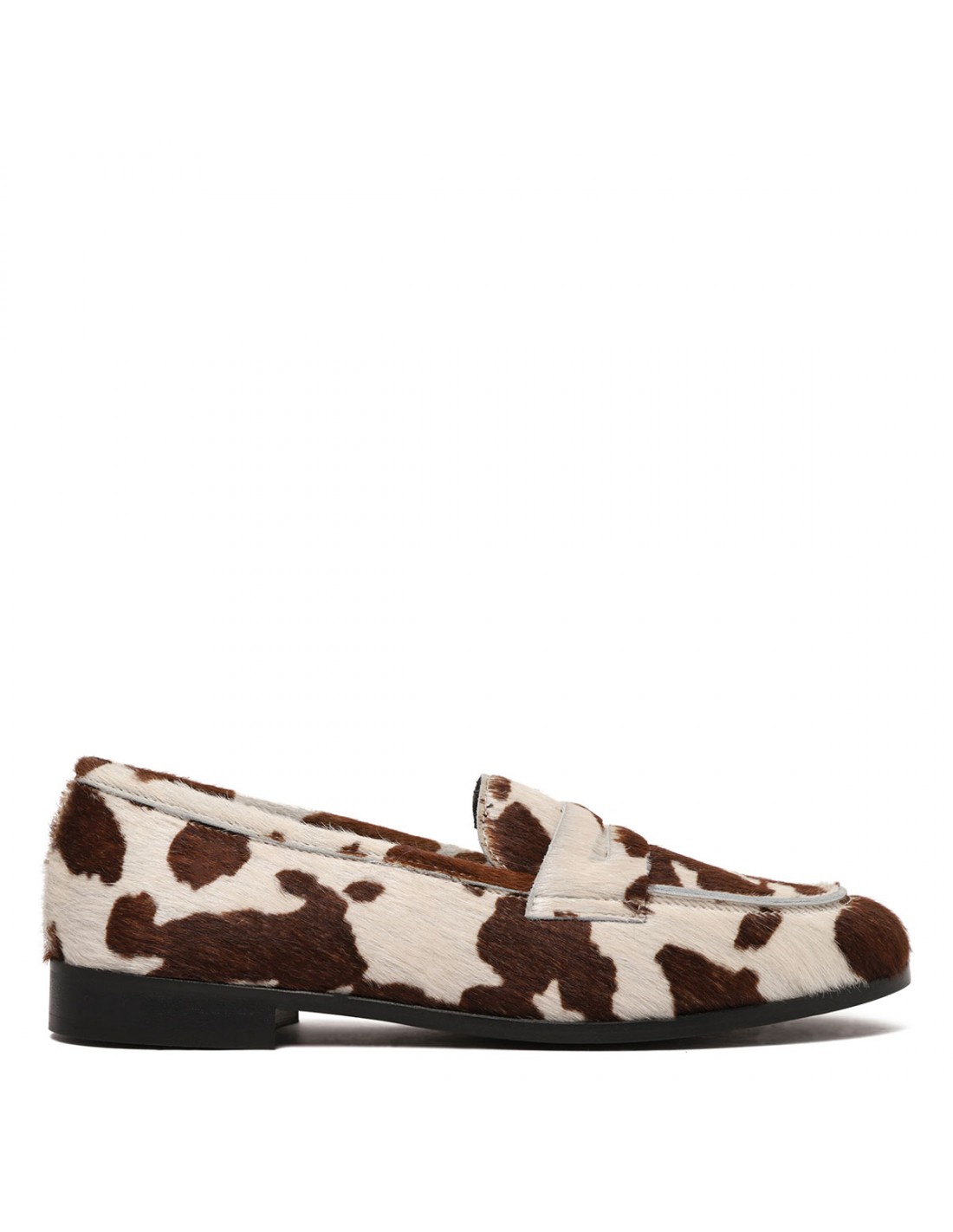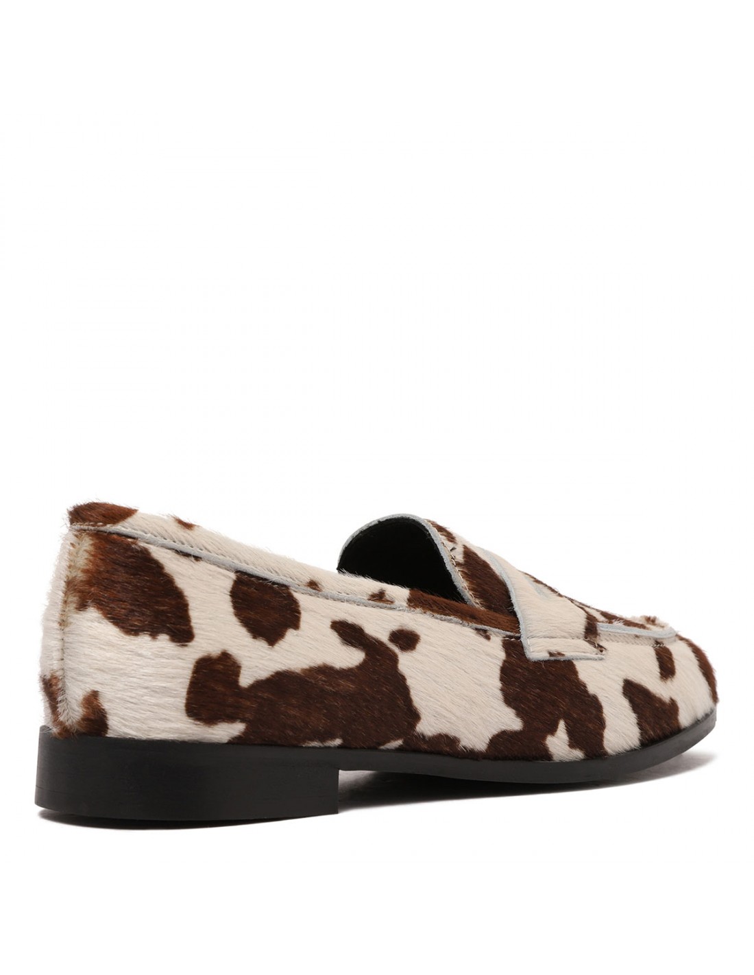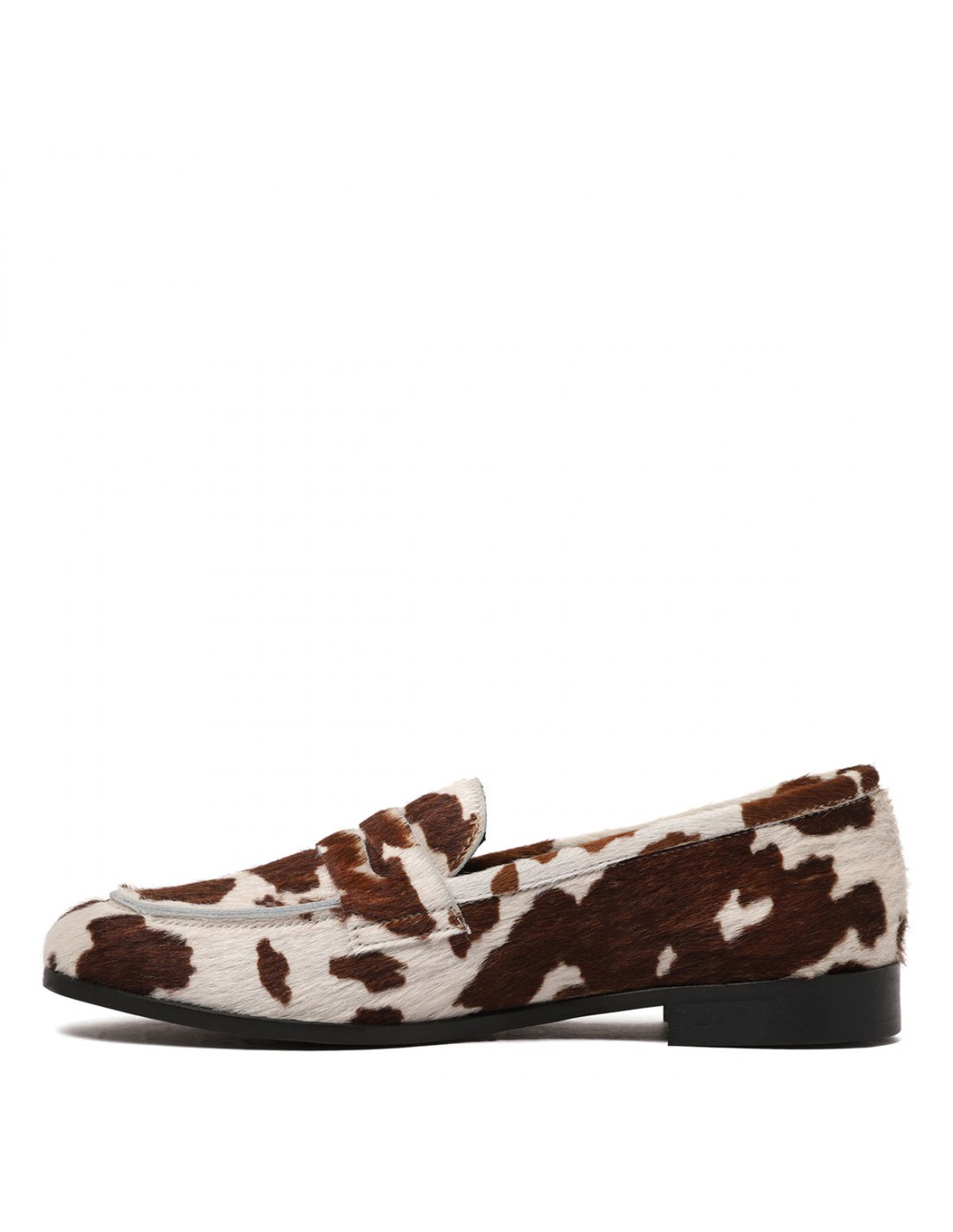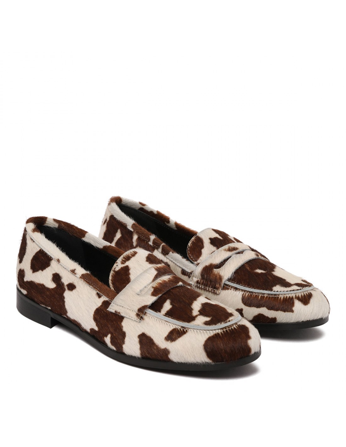 Brown and ivory calf-hair loafers from Le Noir featuring leopard motif, printed allover, round toe, low heel, leather lining and sole.