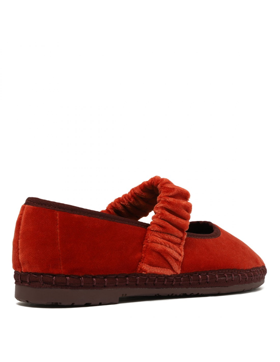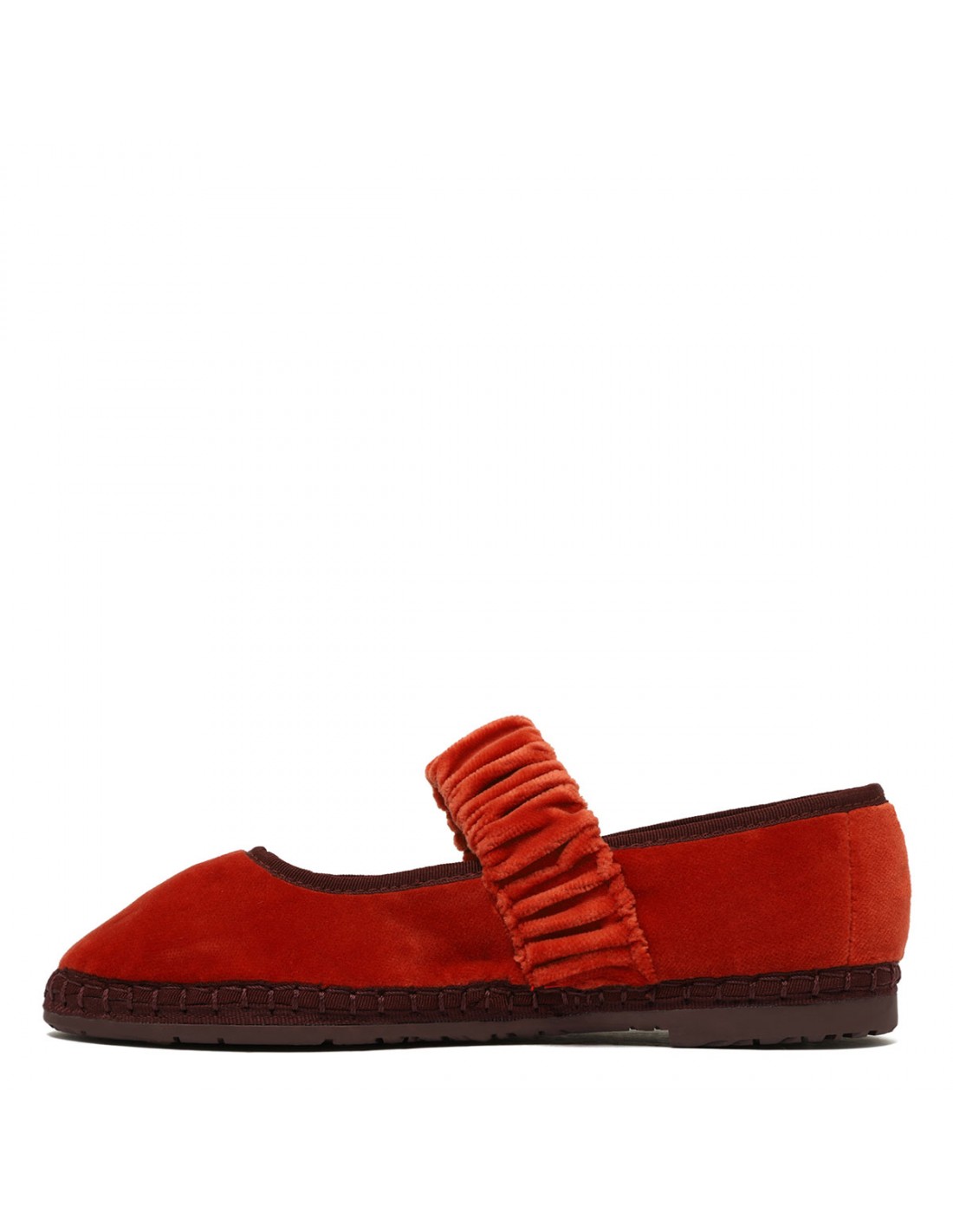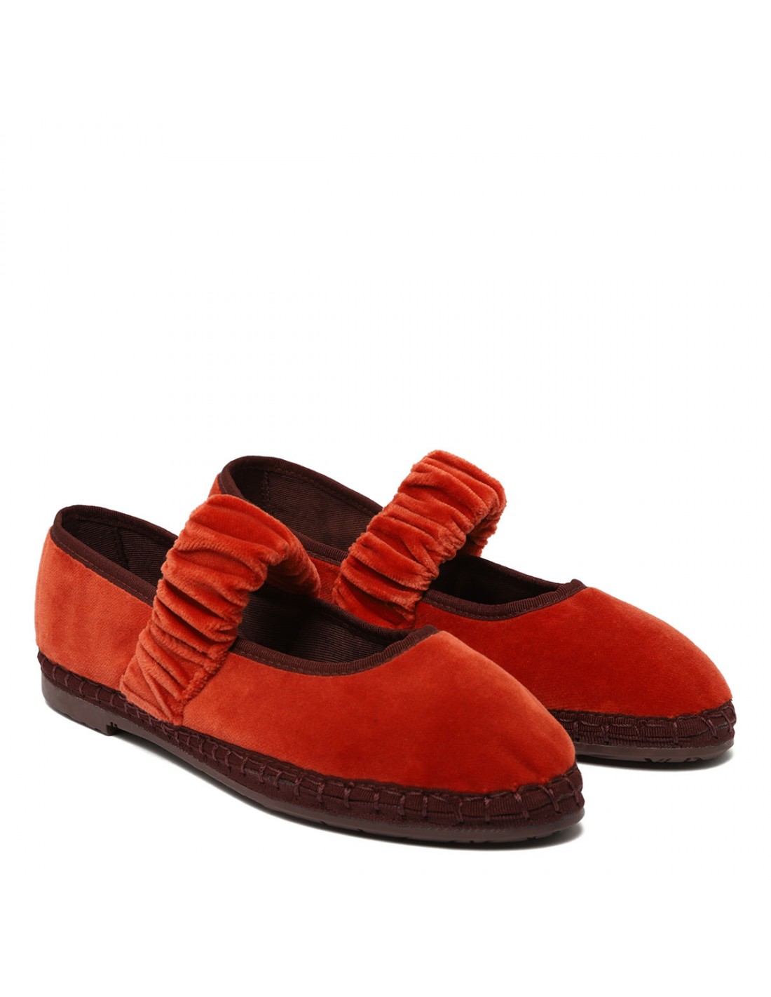 Orange velvet Mafalda Mary Jane ballerinas from Flabelus featuring garnet hue piping, gray ruched strap, almond toe, organic cotton lining with anti-bacterial treatment, recycled rubber sole.