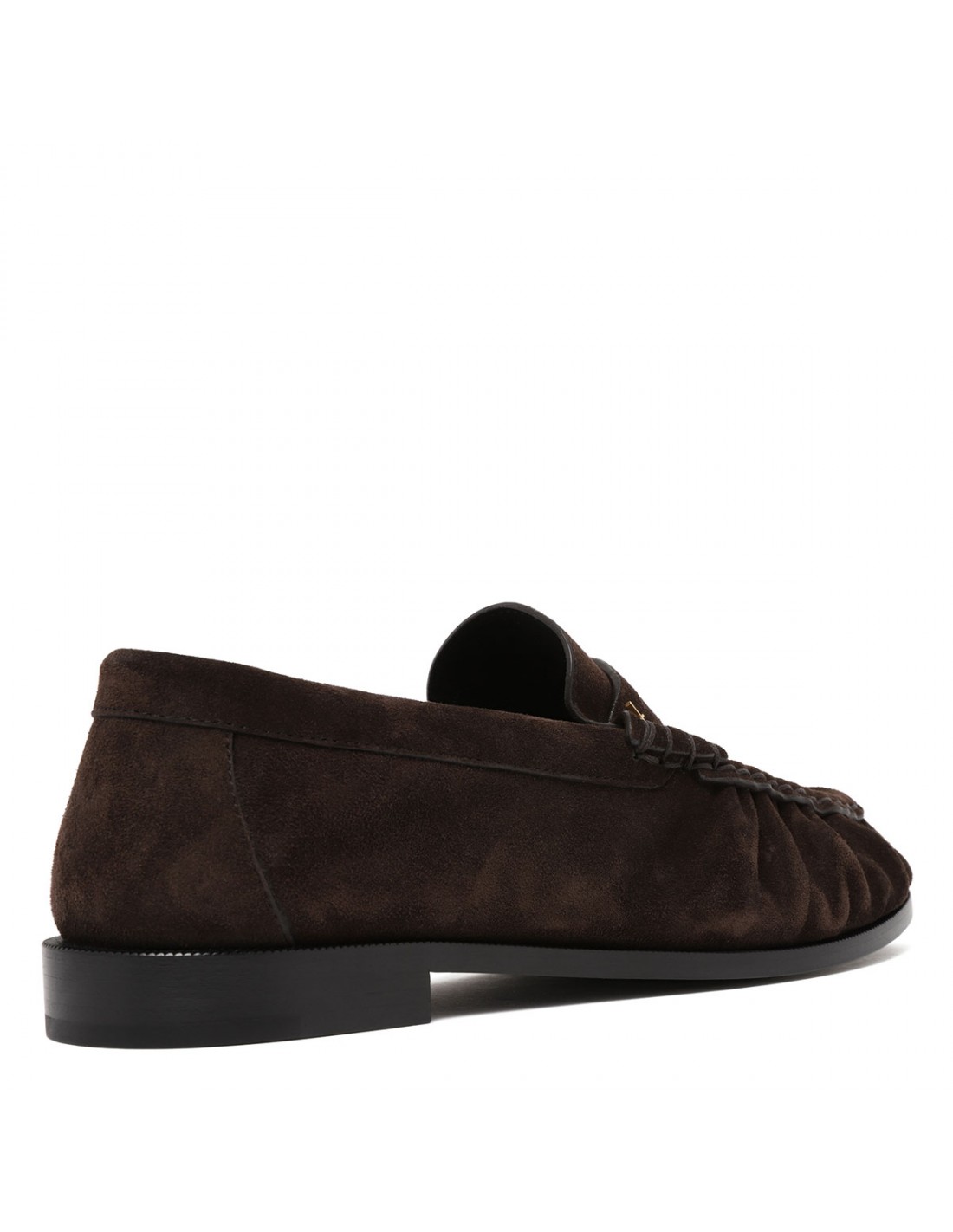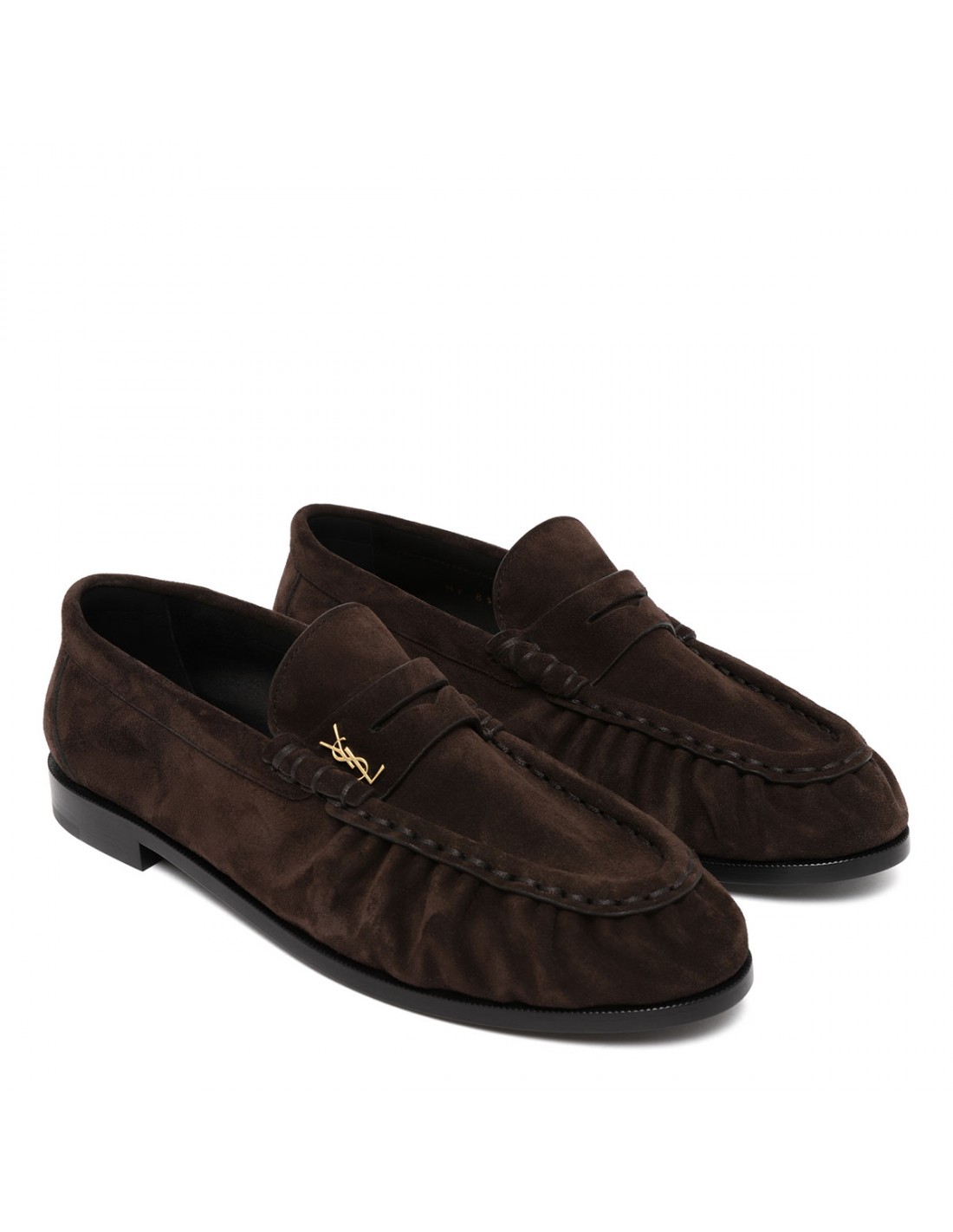 Dark chocolate suede leather penny loafers from Saint Laurent featuring Cassandre decoration, hand-stitched moc toe, leather insole and sole.