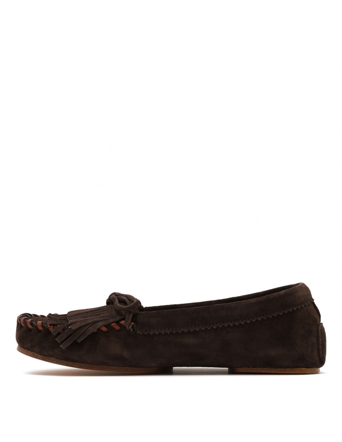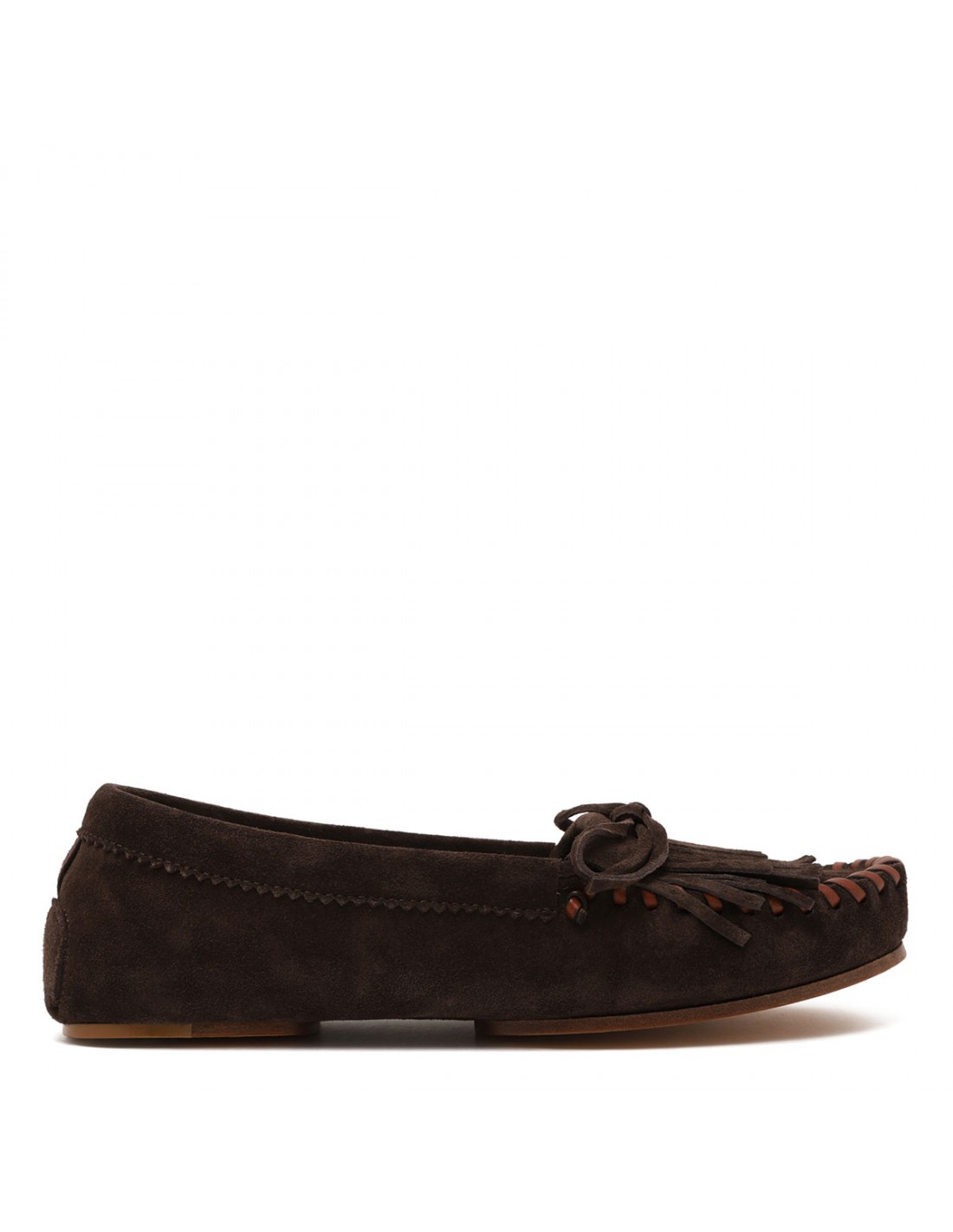 Ebony suede leather Indiana loafers from Paris Texas featuring fringing on the upper, contrasting stitching, bow, almond toe, leather insole and sole.