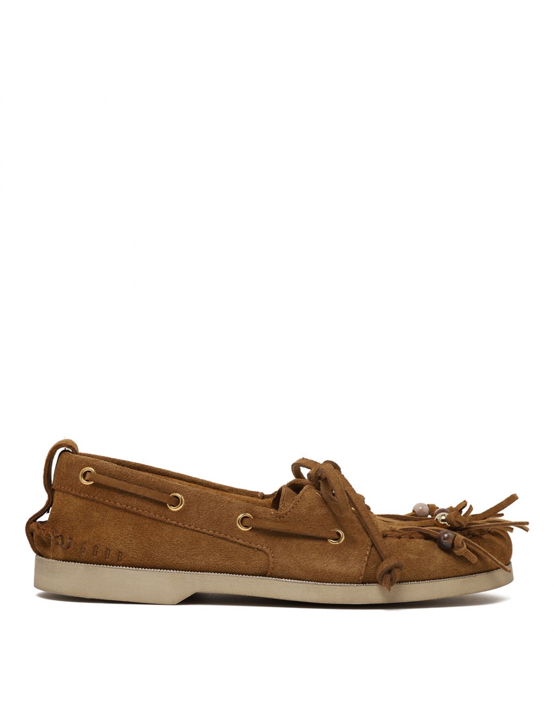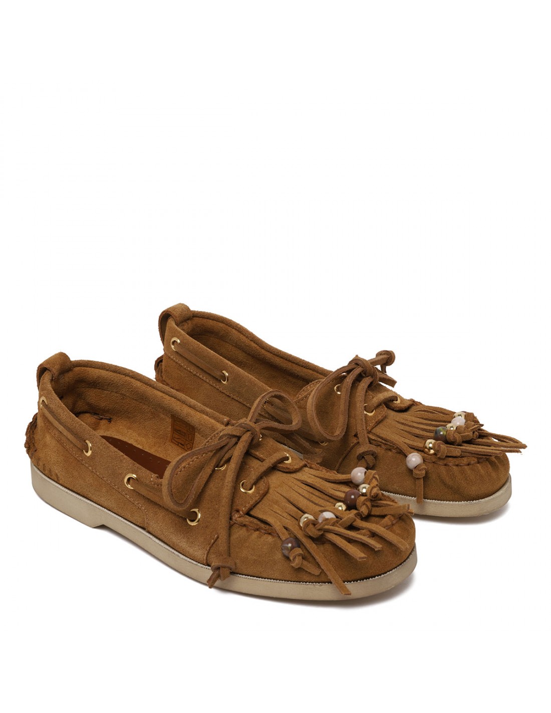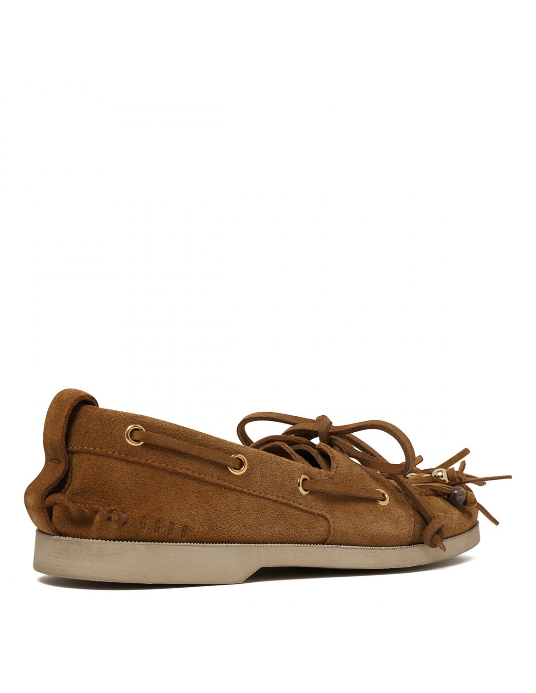 Camel hue suede Cruise boat loafers from Golden Goose featuring fringes and multicolored beads, camel colored laces, tone-on-tone heel loop, vintage finish, round toe, silver-tone metal eyelets, leather lining and rubber sole.