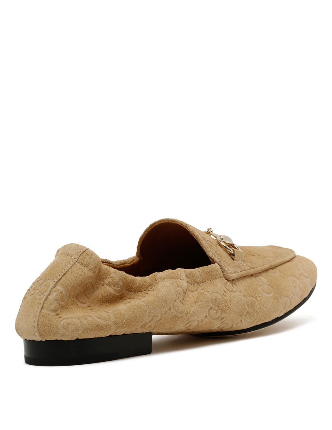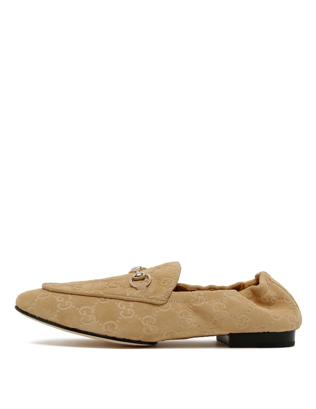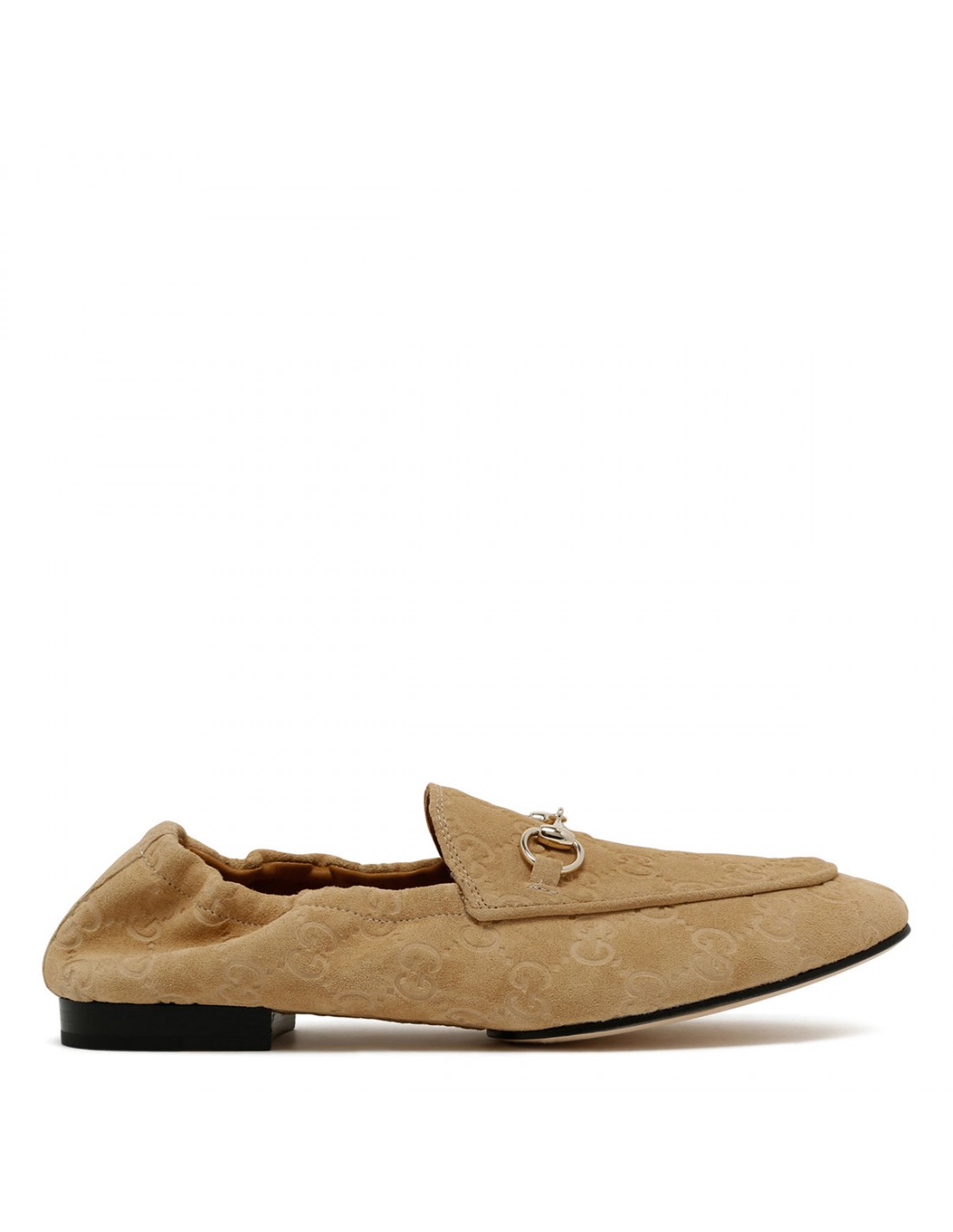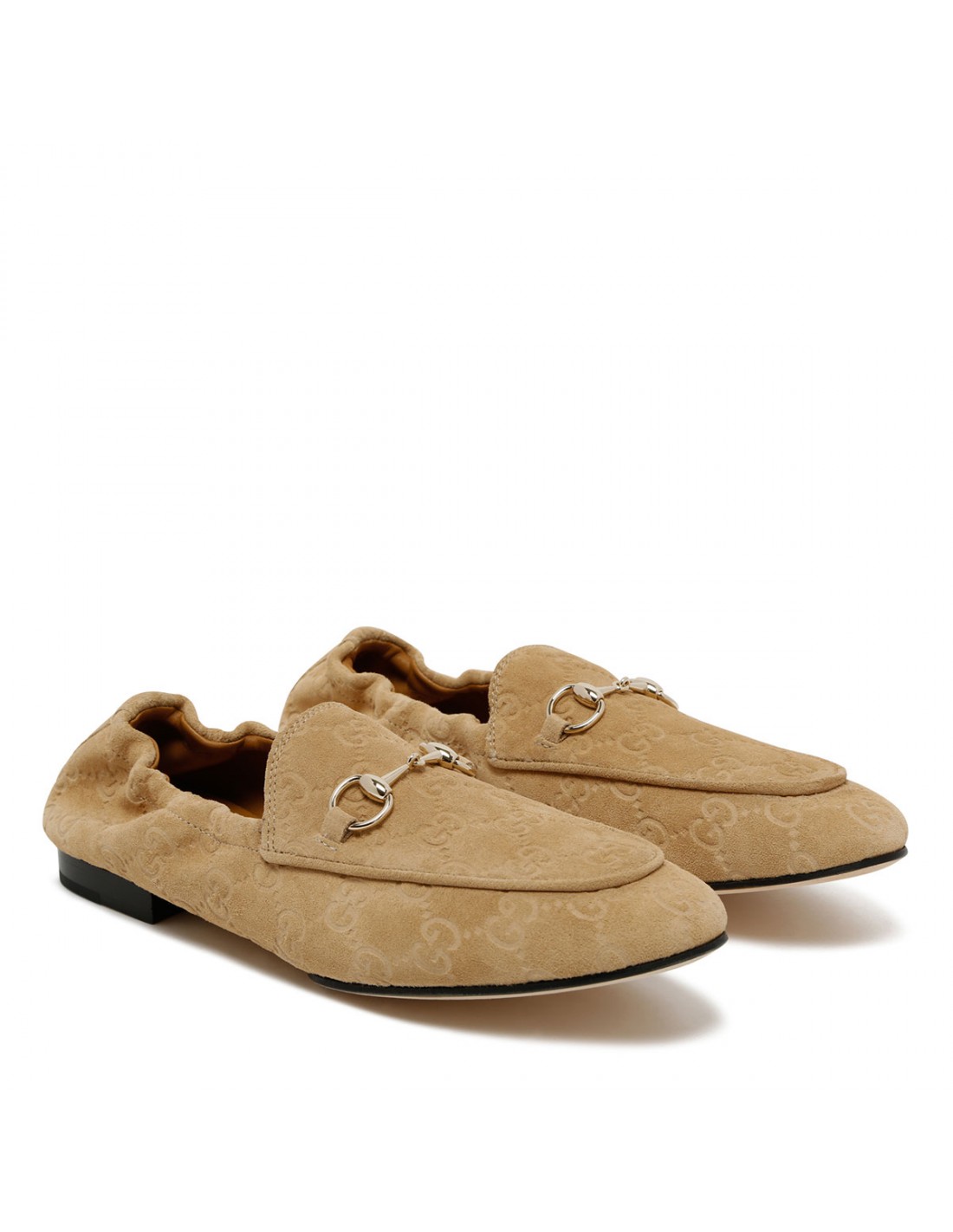 Wheat hue suede Jordaan loafers from Gucci featuring GG motif, light gold-toned hardware and Horsebit, deconstructed silhouette, elastic heel, leather lining, flat leather sole.