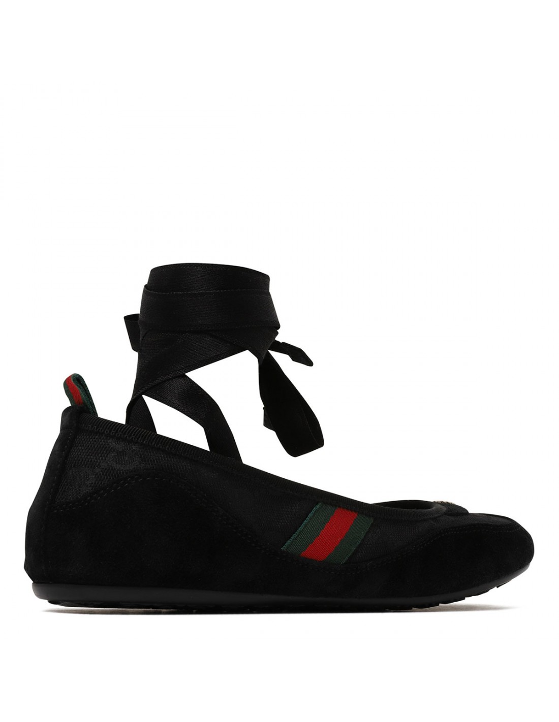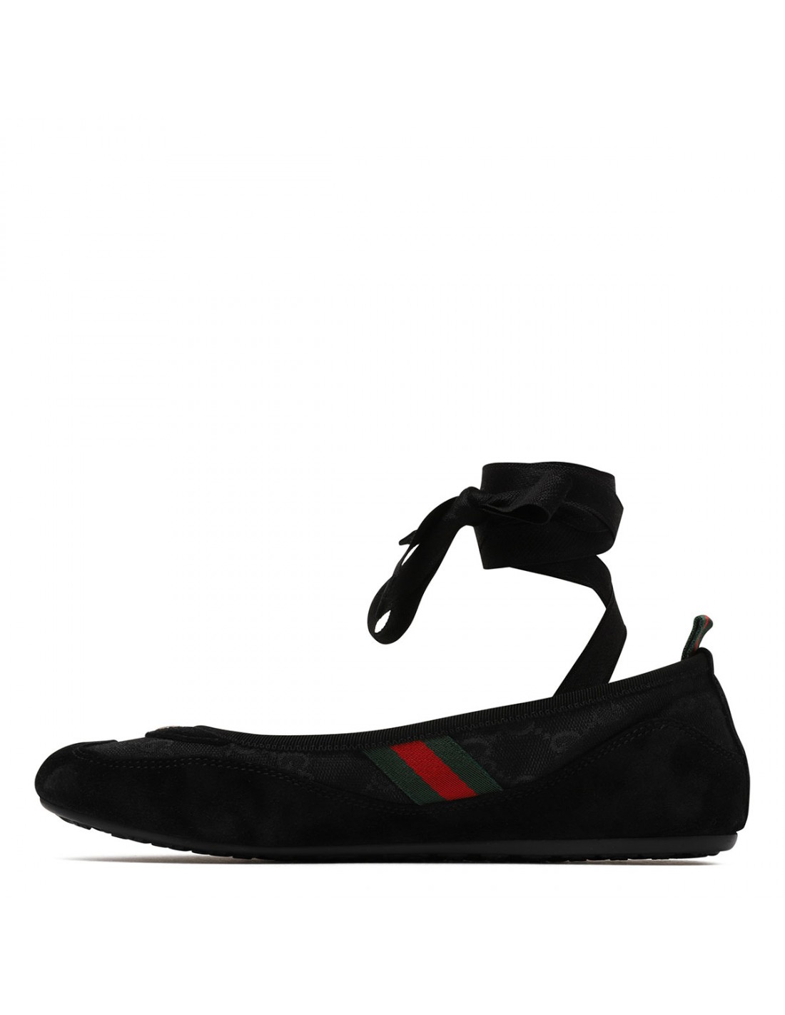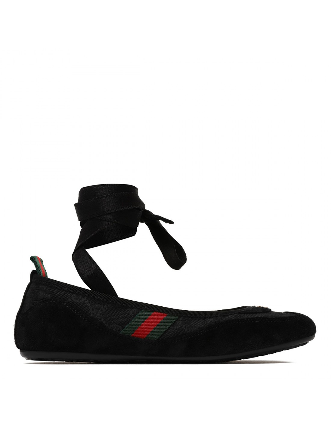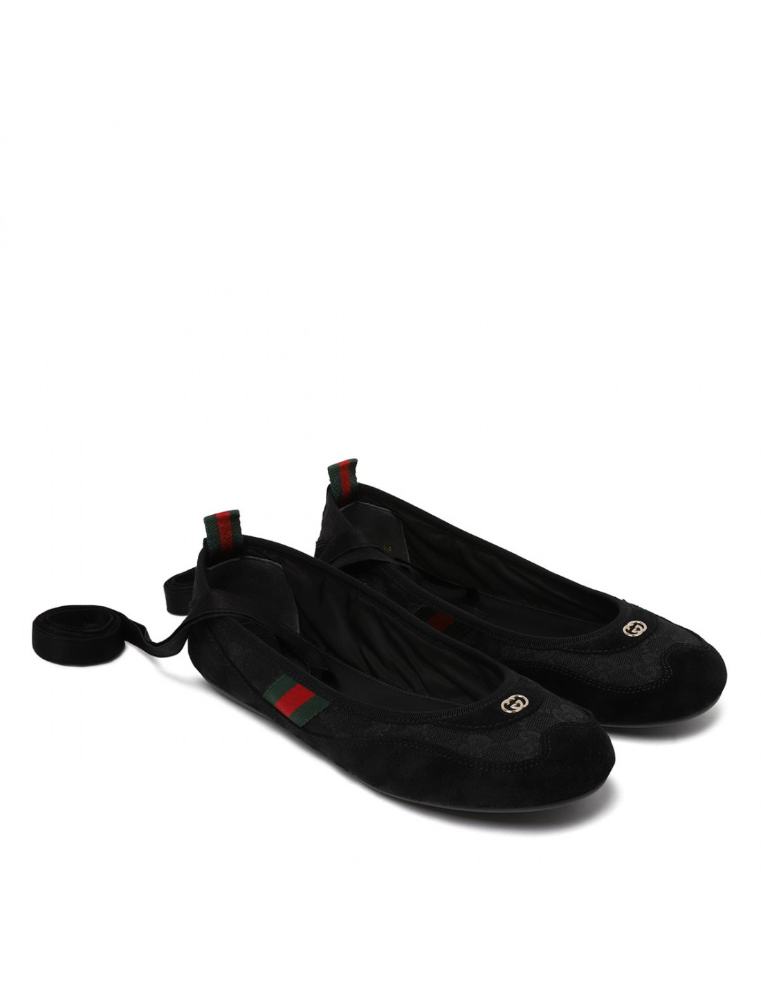 Black GG canvas Shift ballerinas from Gucci featuring tonal suede trims, round toe with interlocking G hardware detail, Web detail on side and loop on back, detachable satin laces, flexible rubber sole with Interlocking G motif.