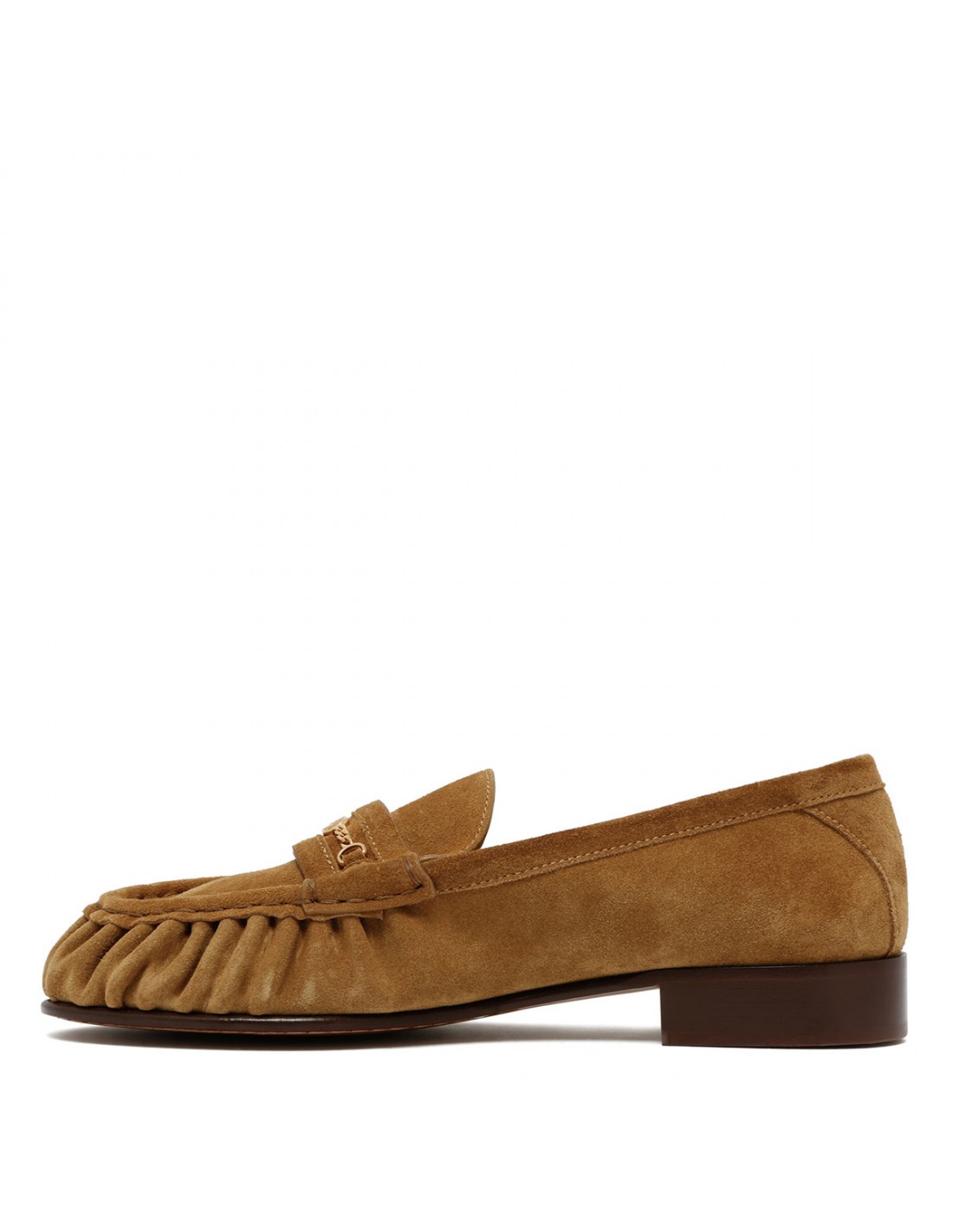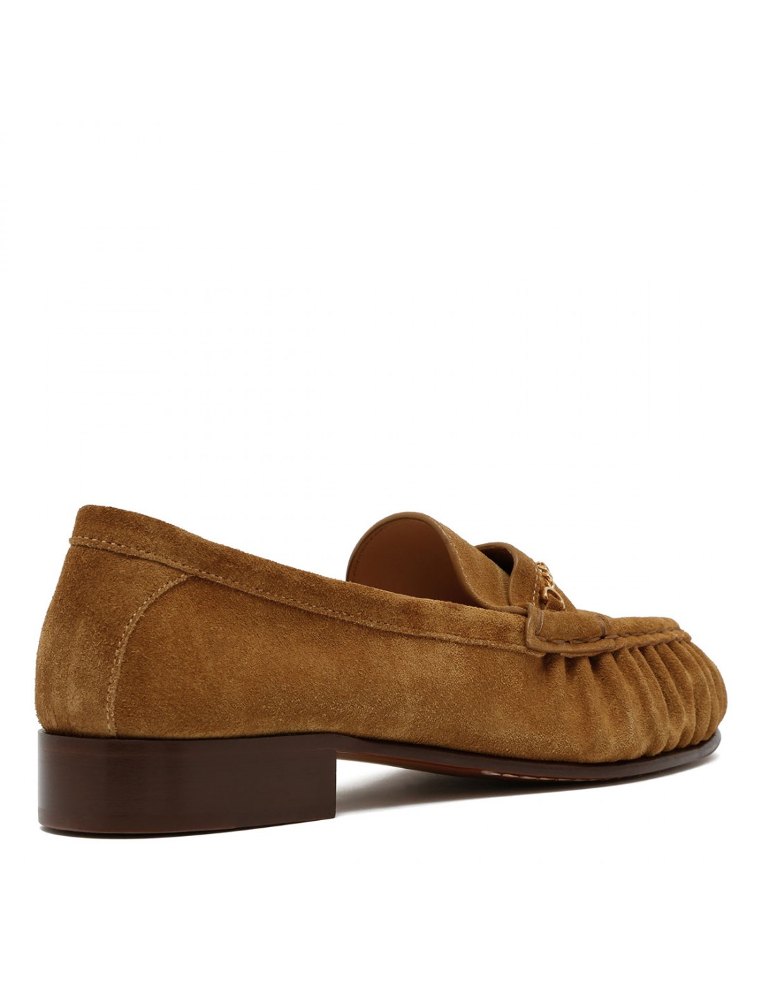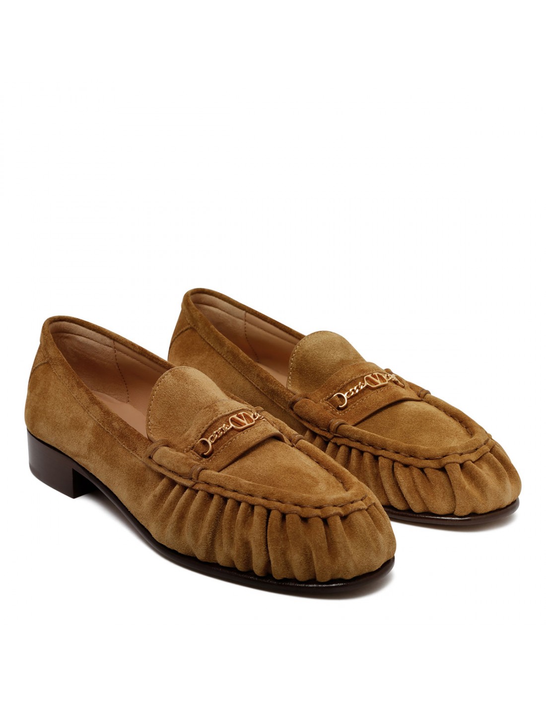Havana beige suede loafers from Valentino Garavani featuring iconic VLogo Signature chain across the vamp, gathering detail, almond toe, low heel, leather insole and sole.