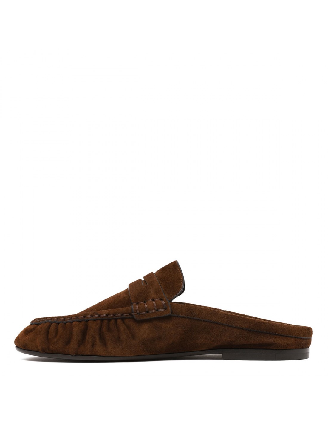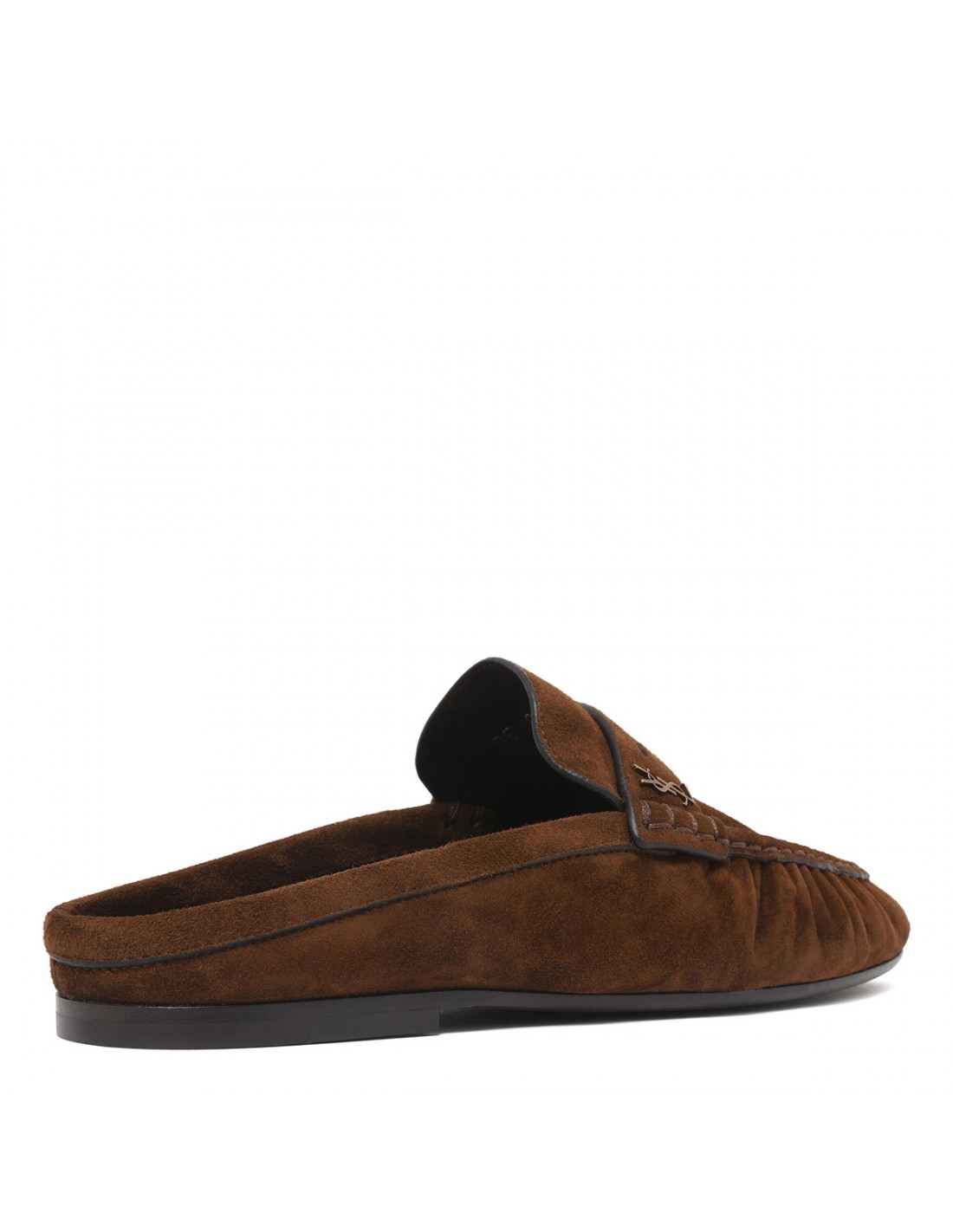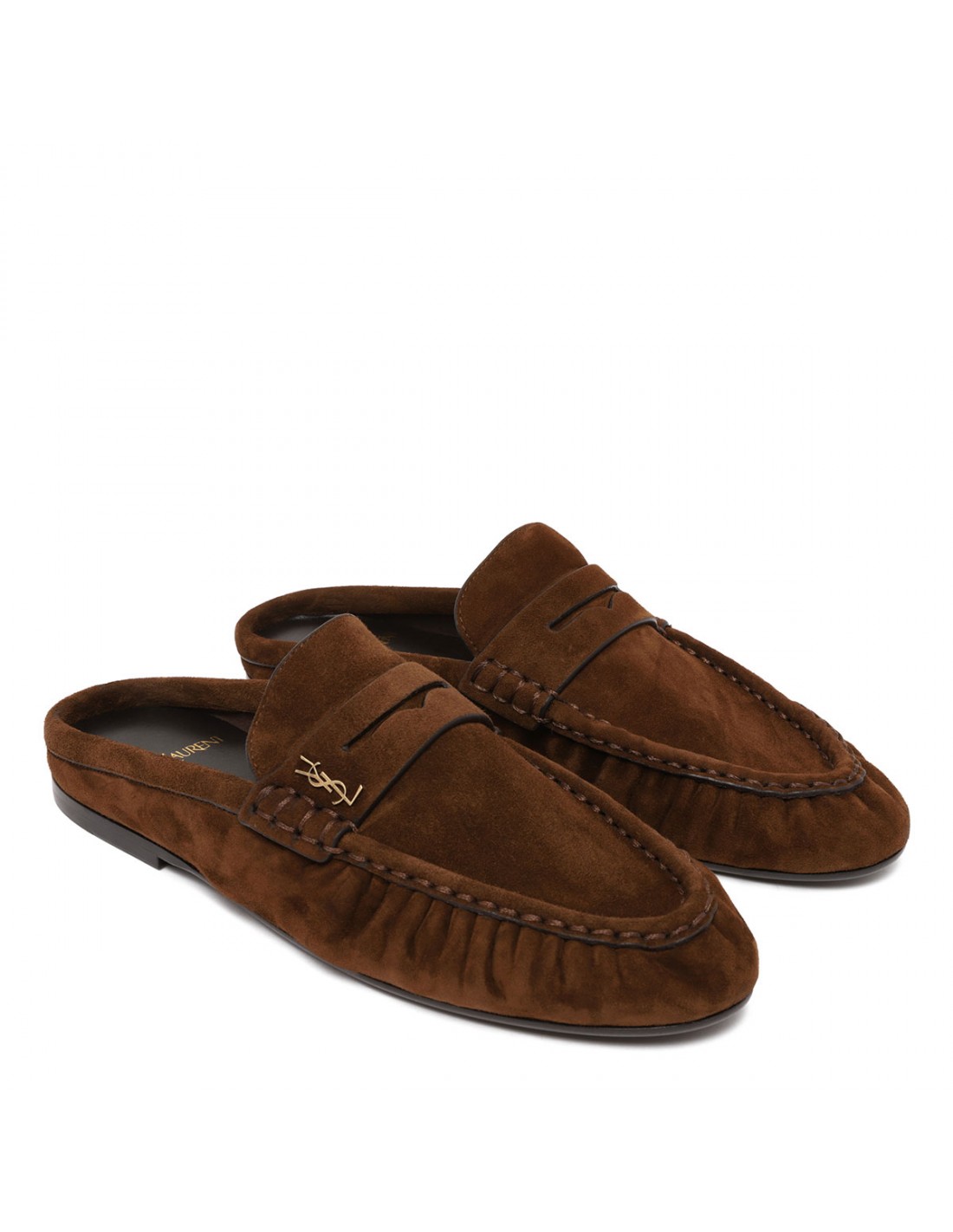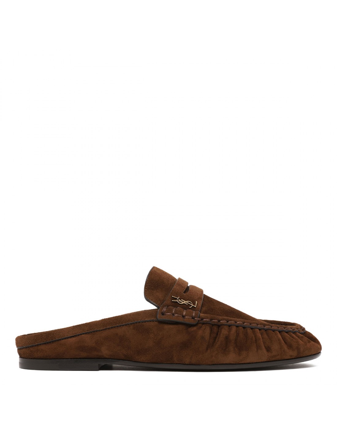 Dark havana suede leather Le Loafers mules from Saint Laurent featuring gold-tone metal Cassandre decoration, hand-stitched moc toe, leather insole and sole.