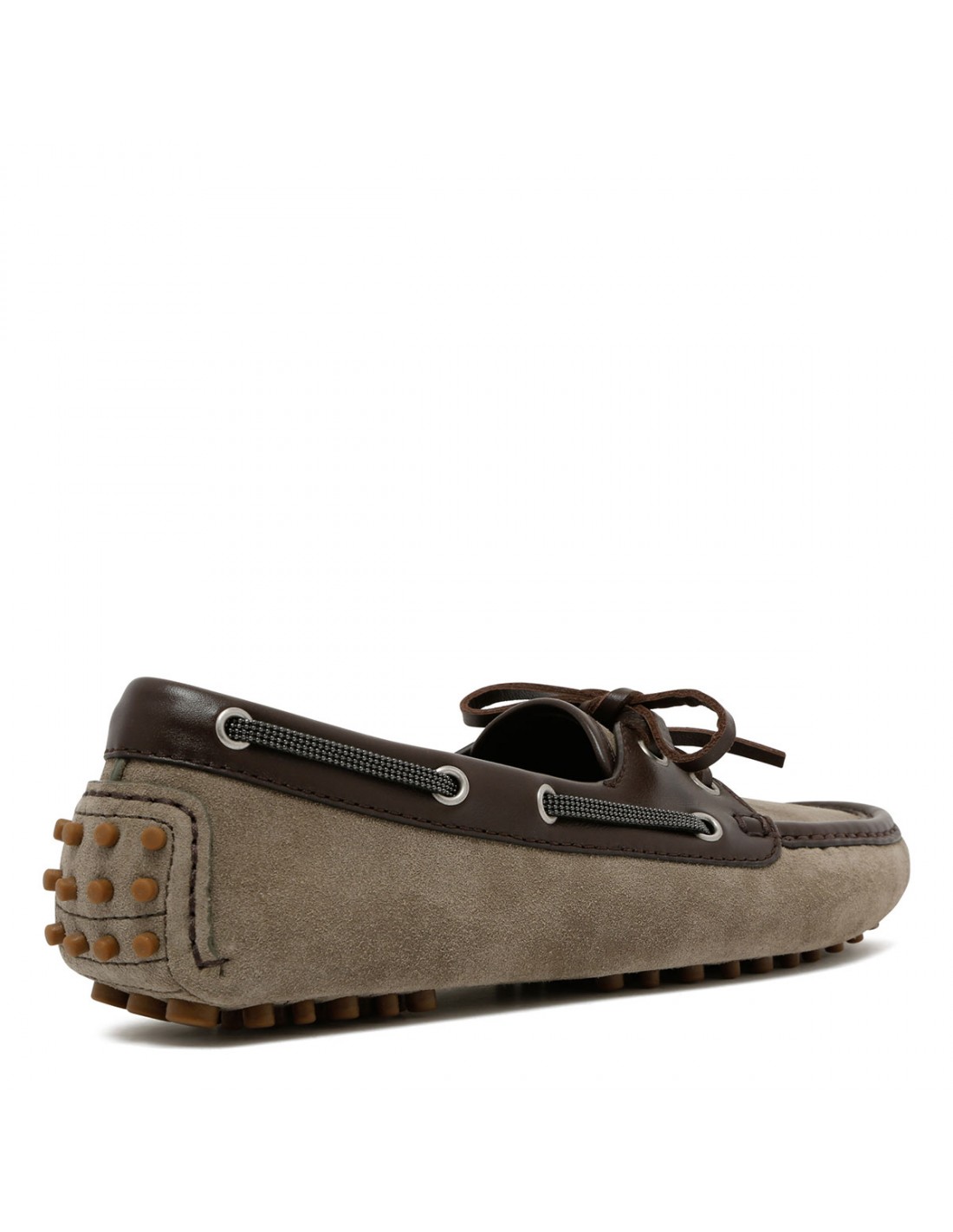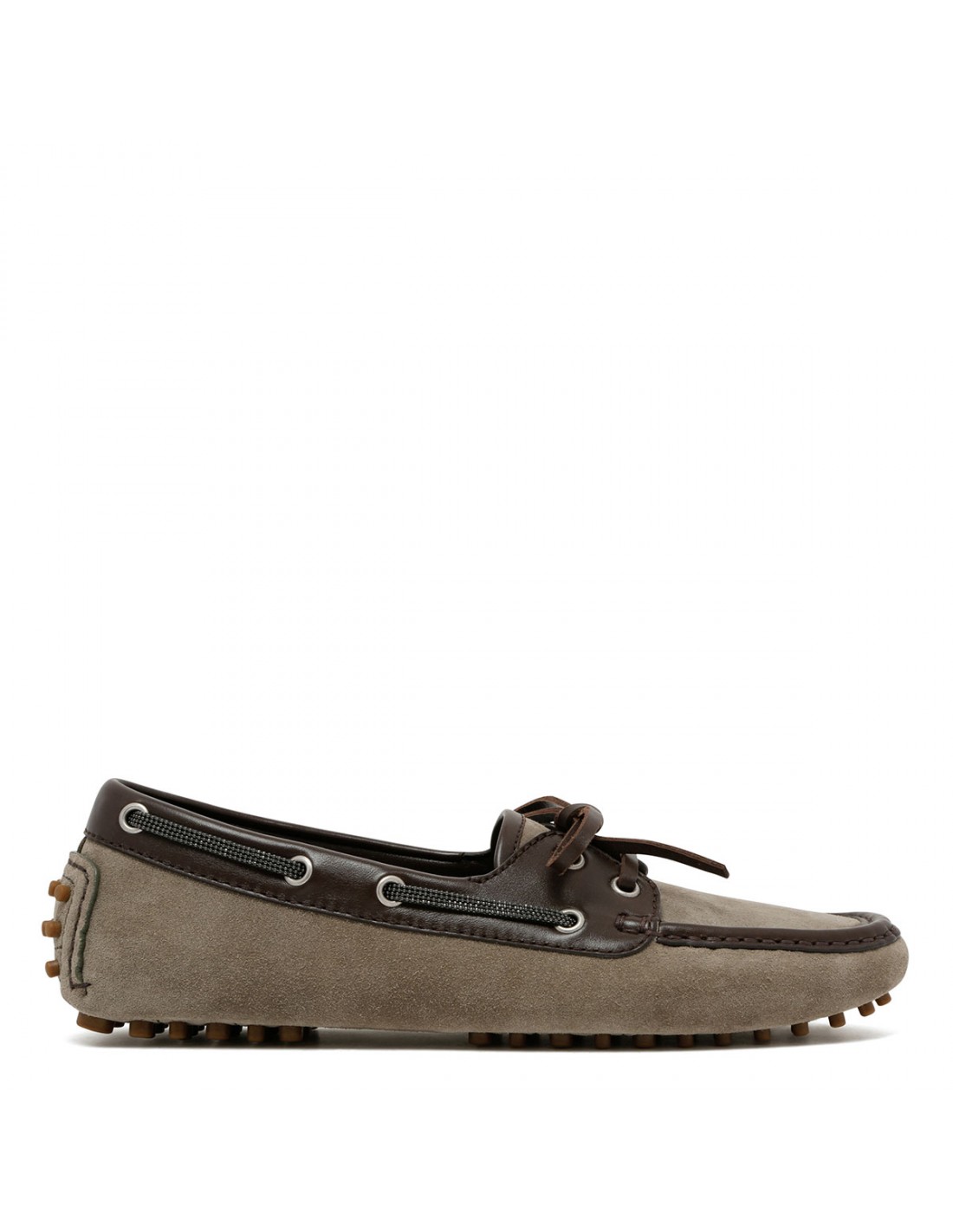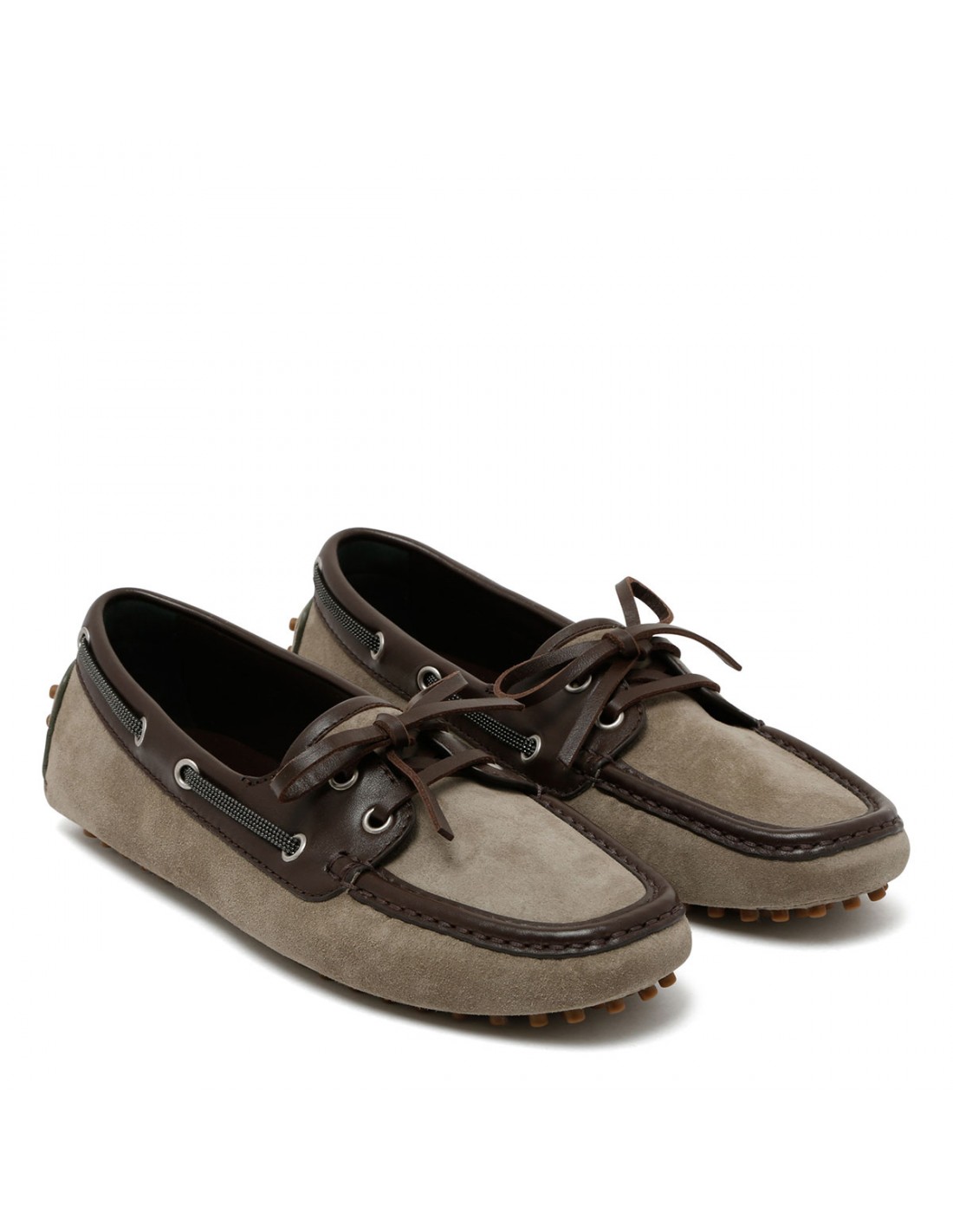 Khaki suede boat loafers from Brunello Cucinelli featuring contrasting smooth leather details, laced upper with self-tie laces, squared toe, leather lining, leather and rubber sole.