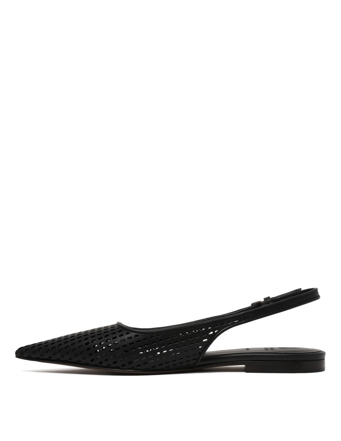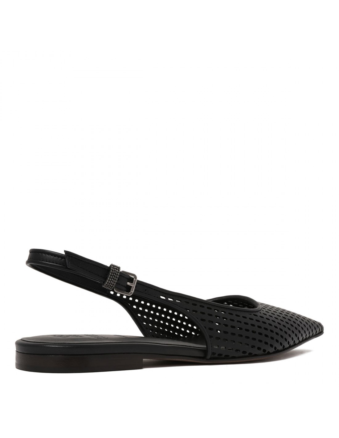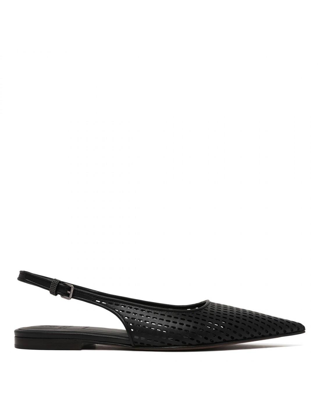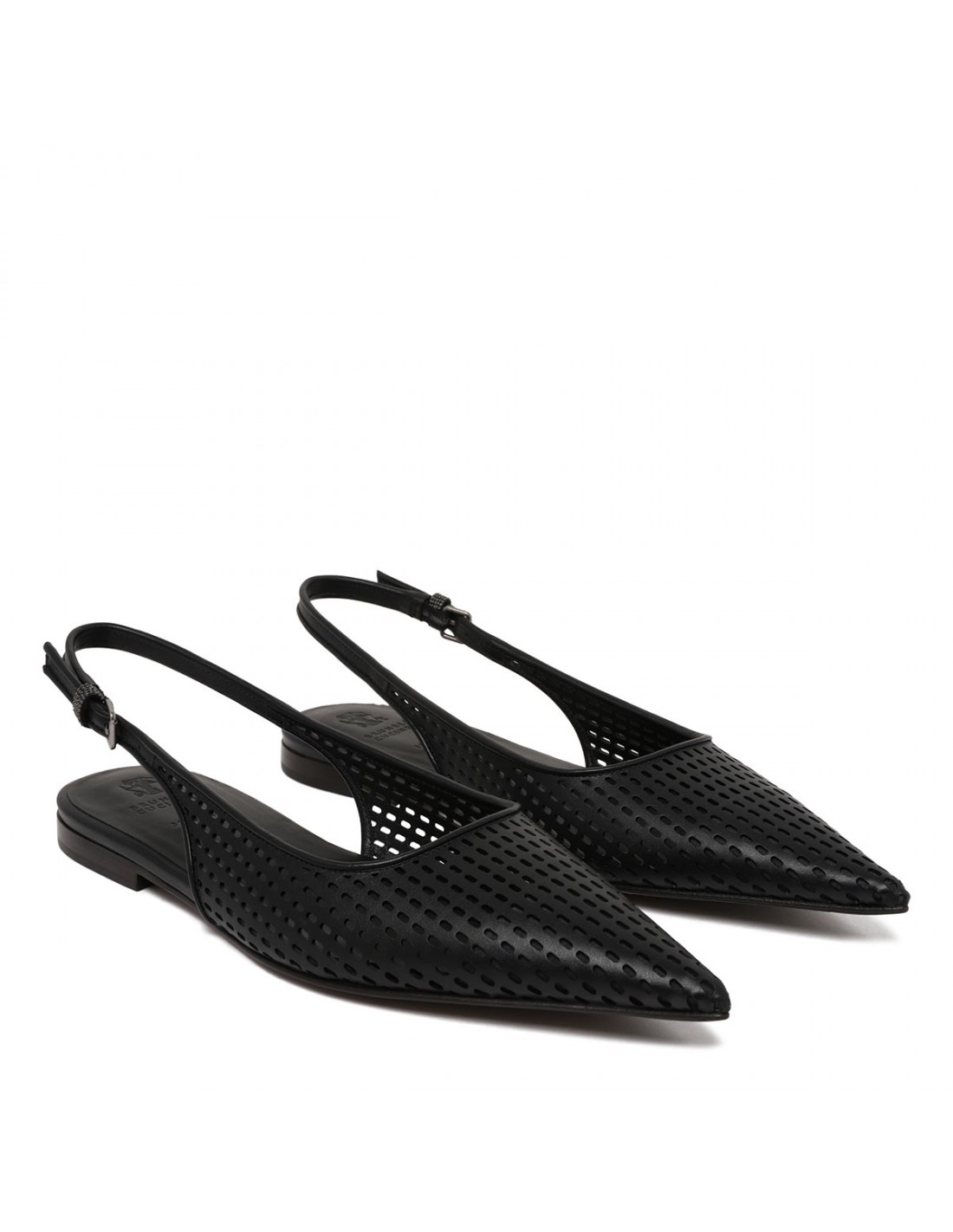 Black net leather slingback ballerinas from Brunello Cucinelli featuring slingback strap with iconic monili embroidery and buckle closure, pointed toe, leather lining, leather sole, non-slip TPU rubber at heel and toe.