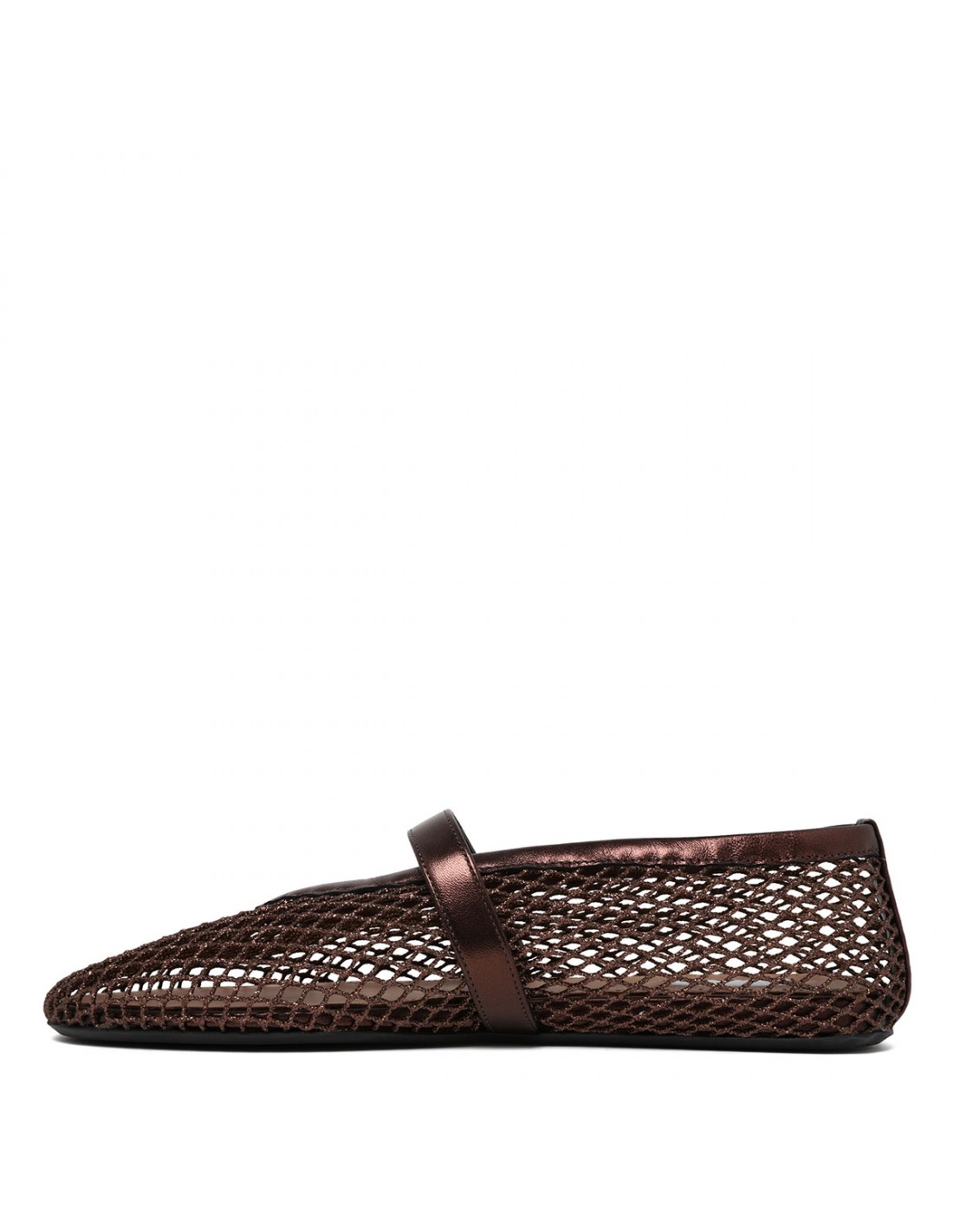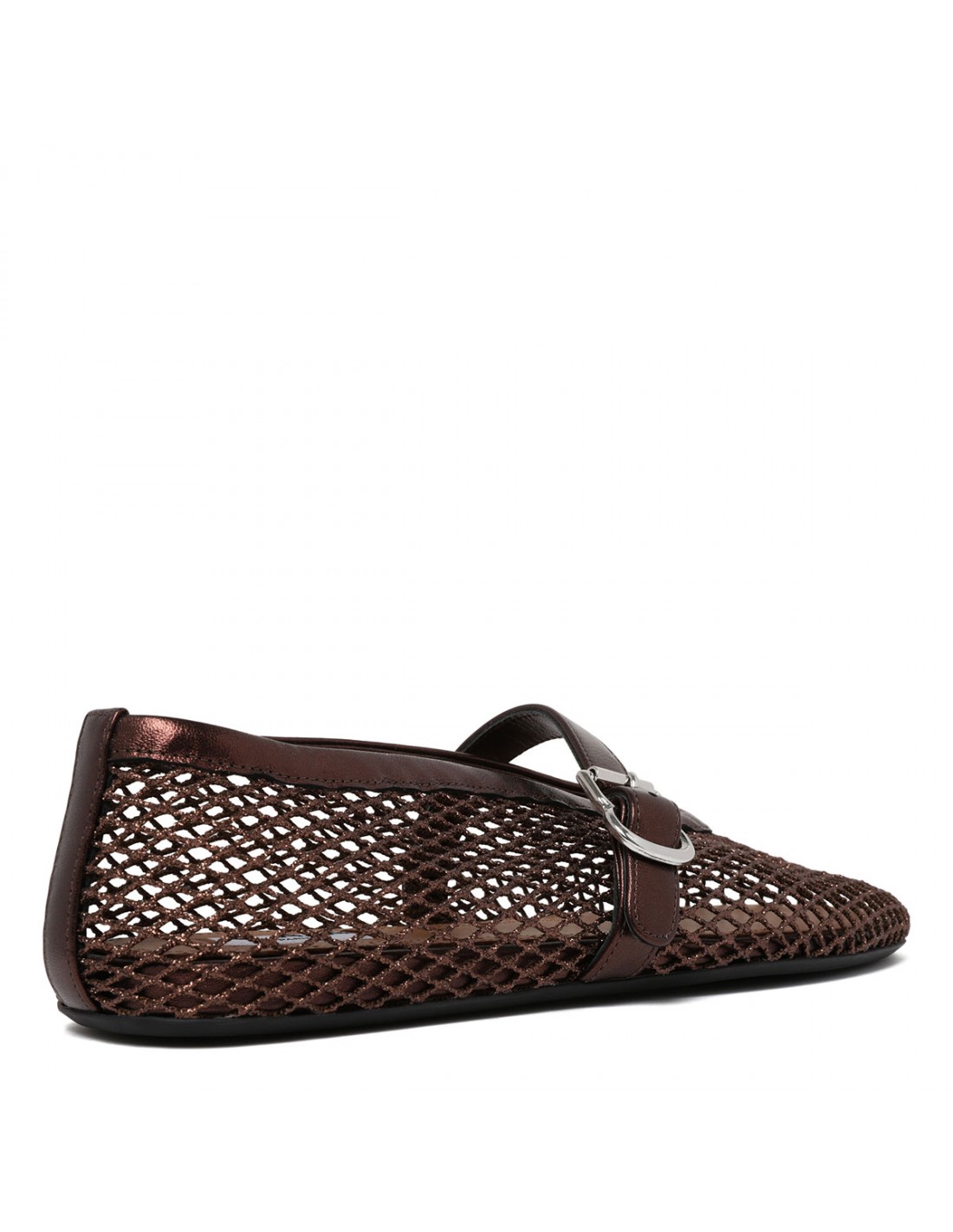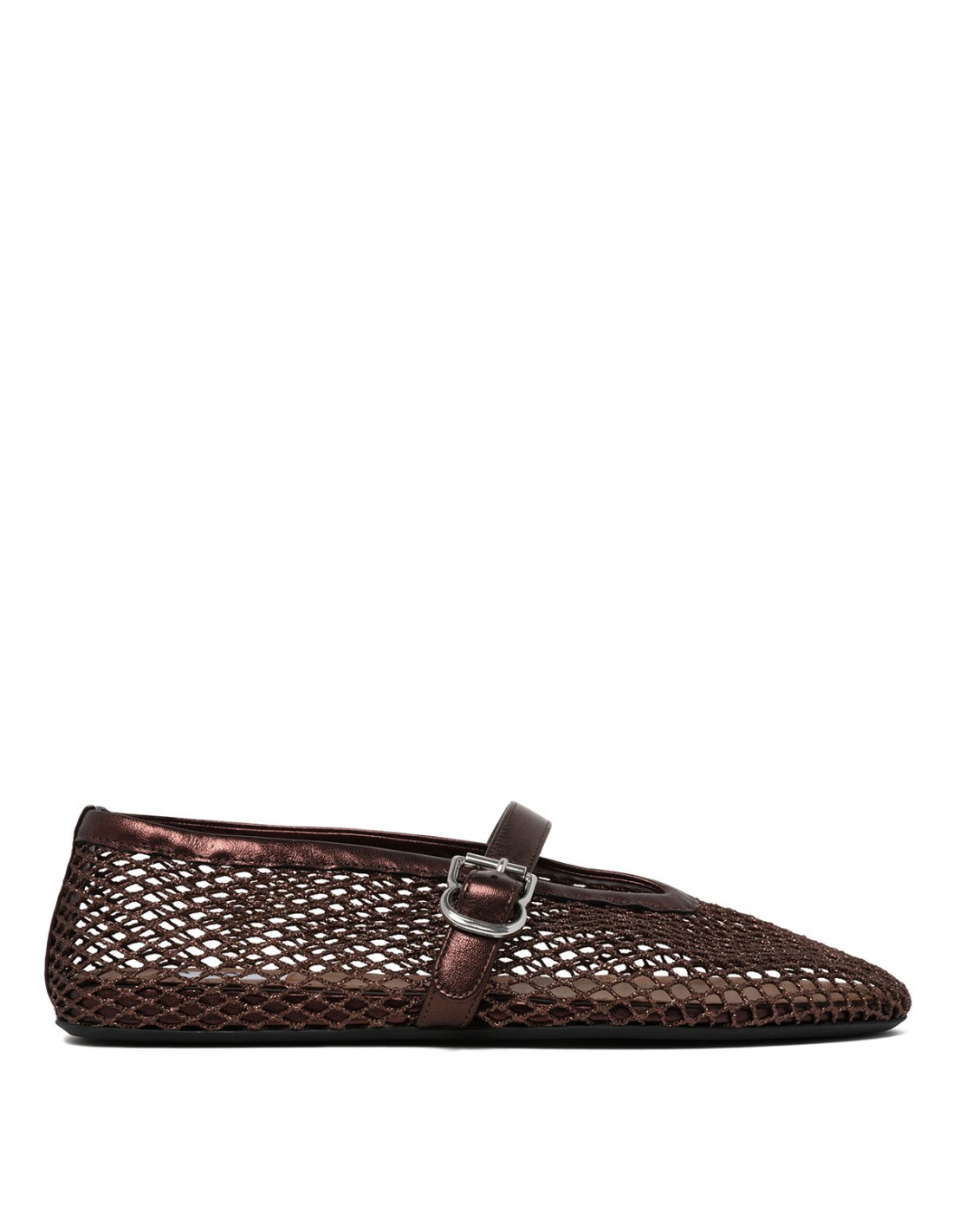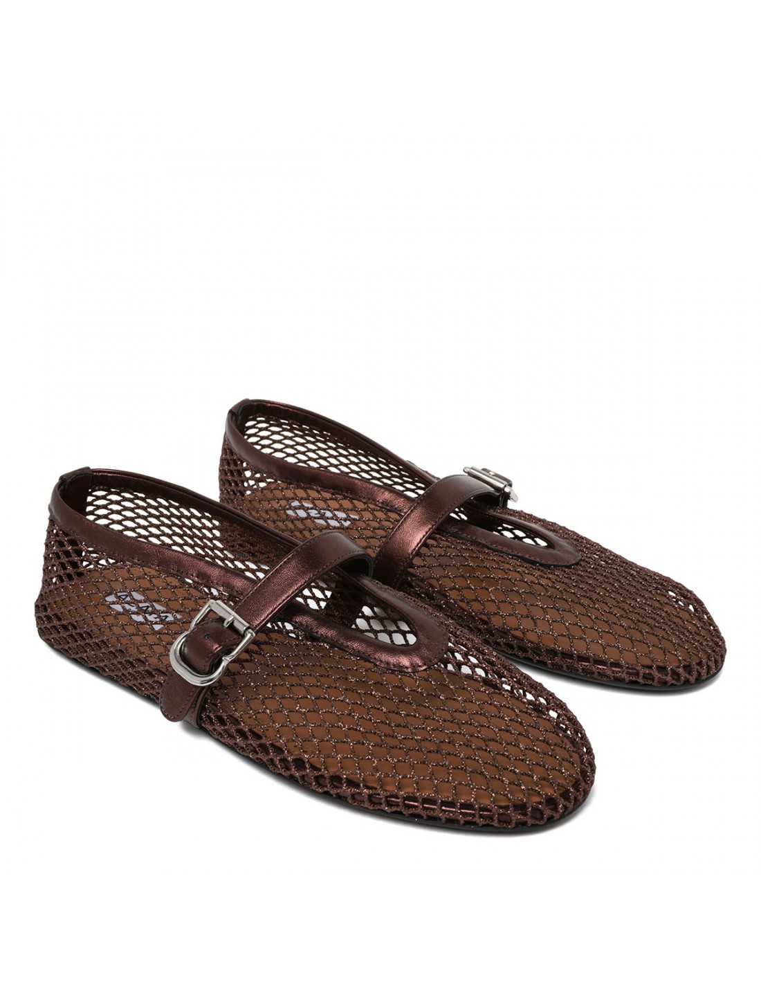 Bronze fishnet ballet flats from Alaia featuring metallic leather trims, buckle strap on top, round toe, leather insole and rubber sole.