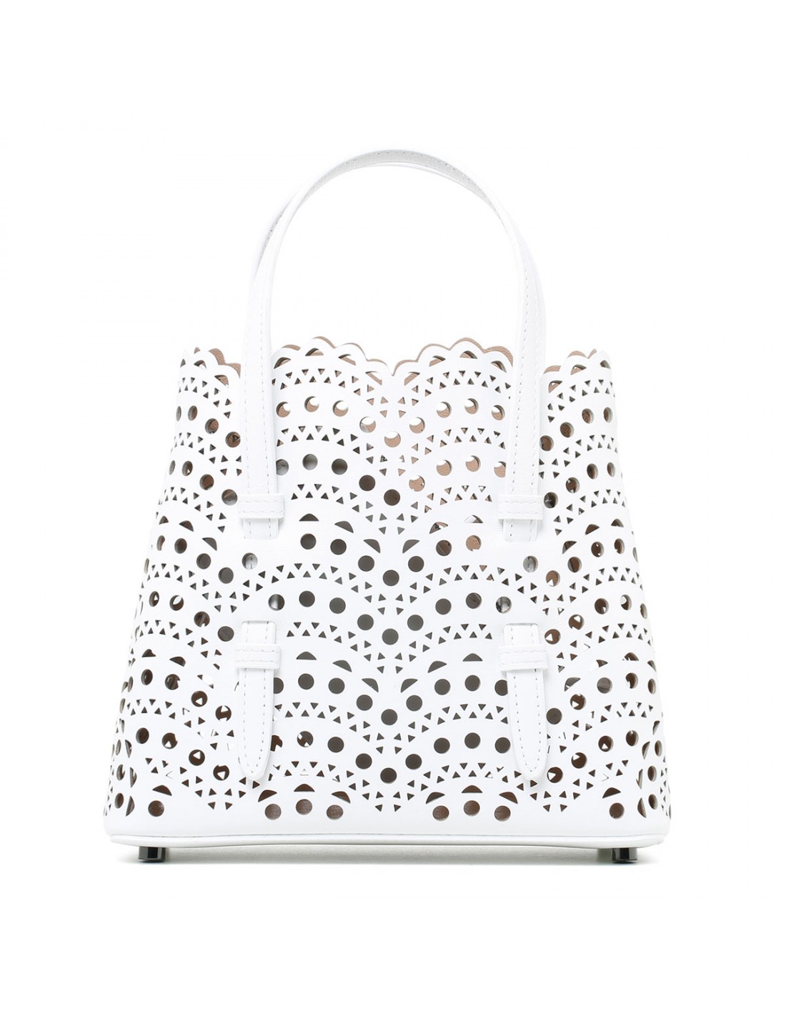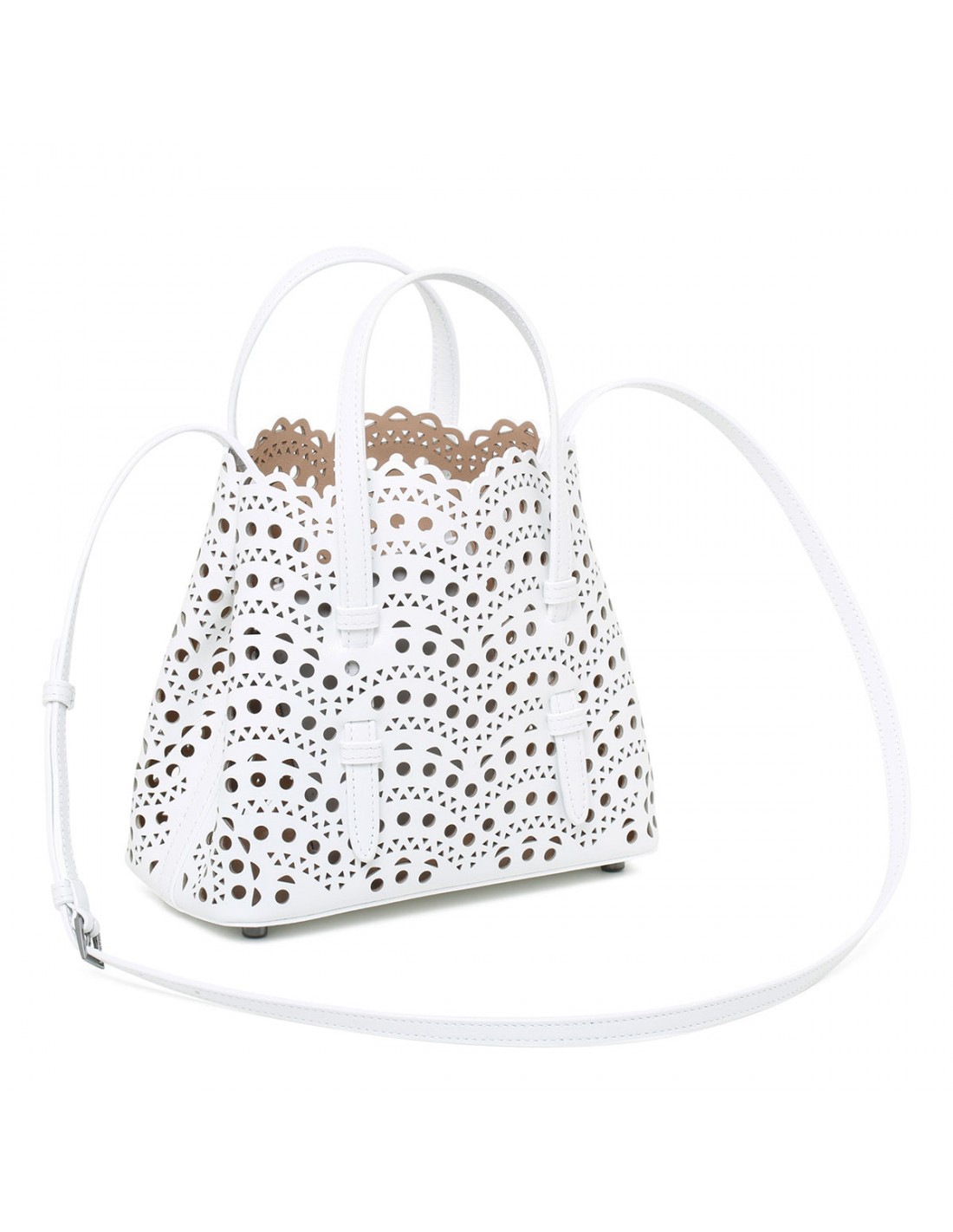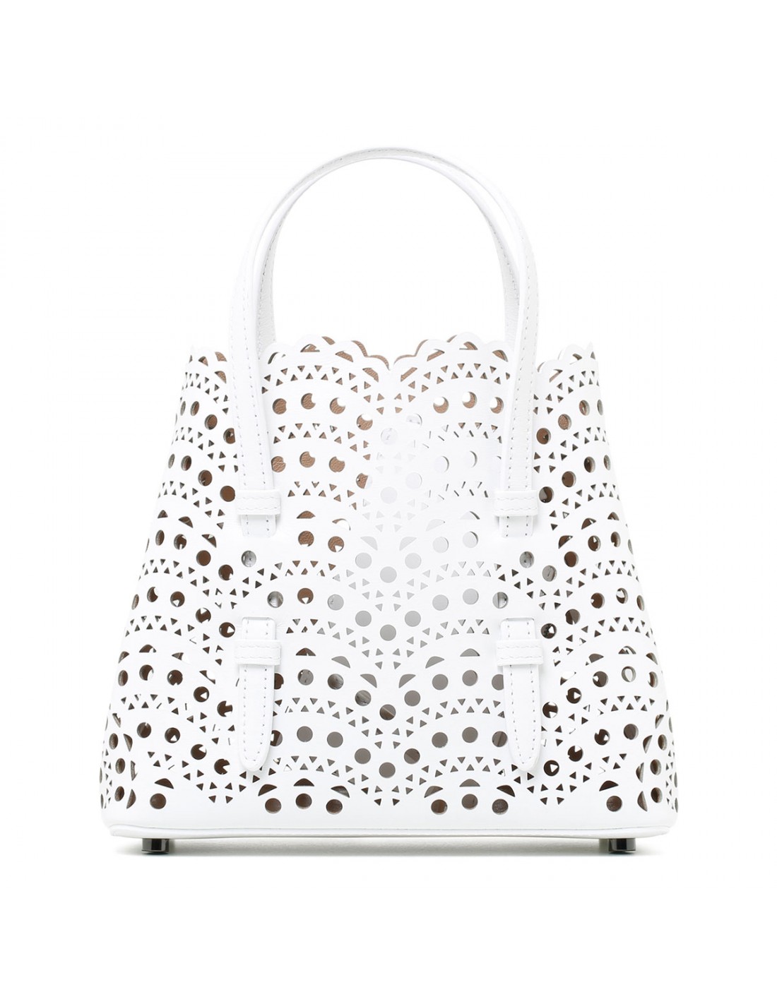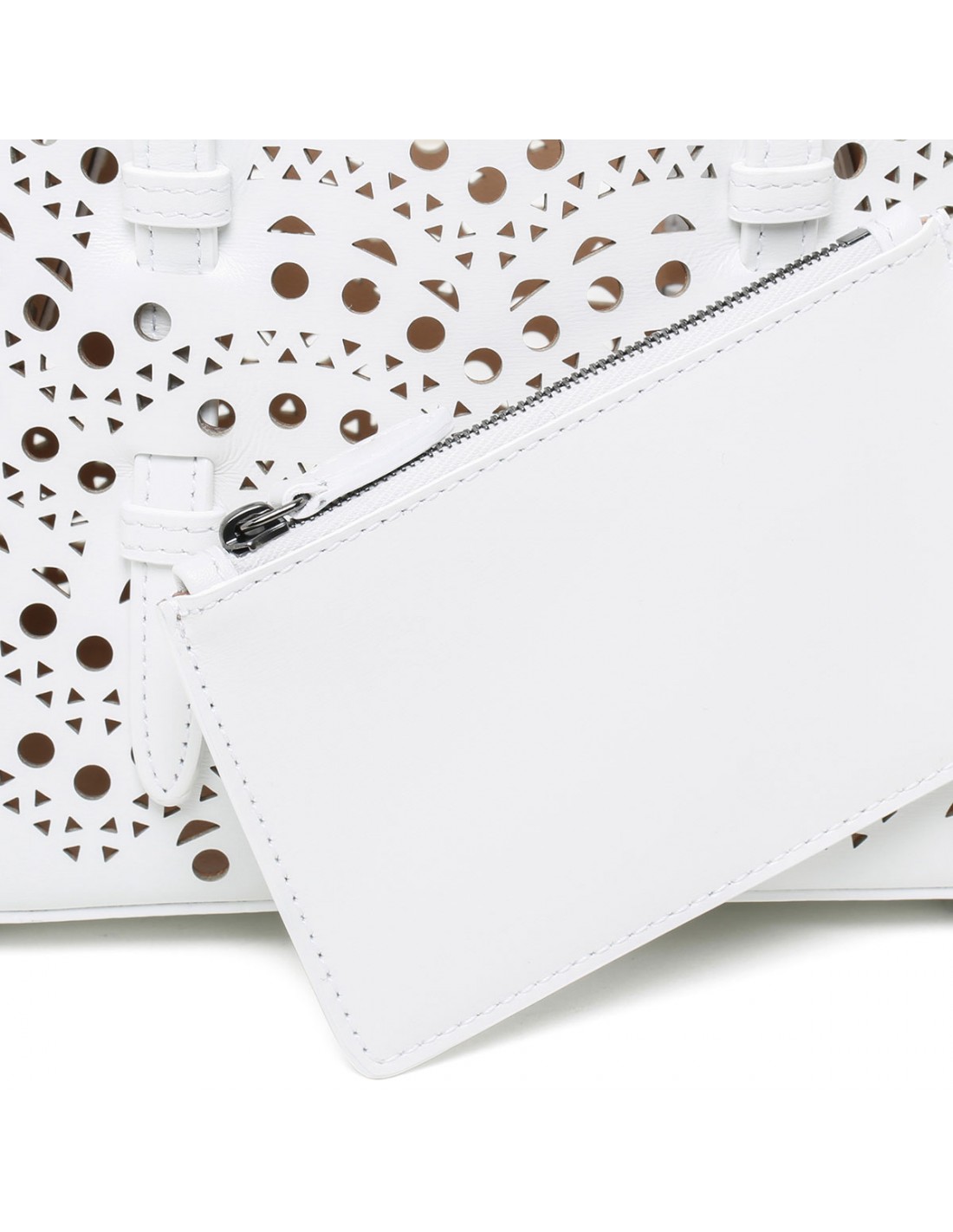 Optic white calf leather Mina 20 tote bag from Alaia featuring Vienne wave pattern, snap-fastening gusseted sides, double top handle, zipped leather pouch, adjustable shoulder strap.
