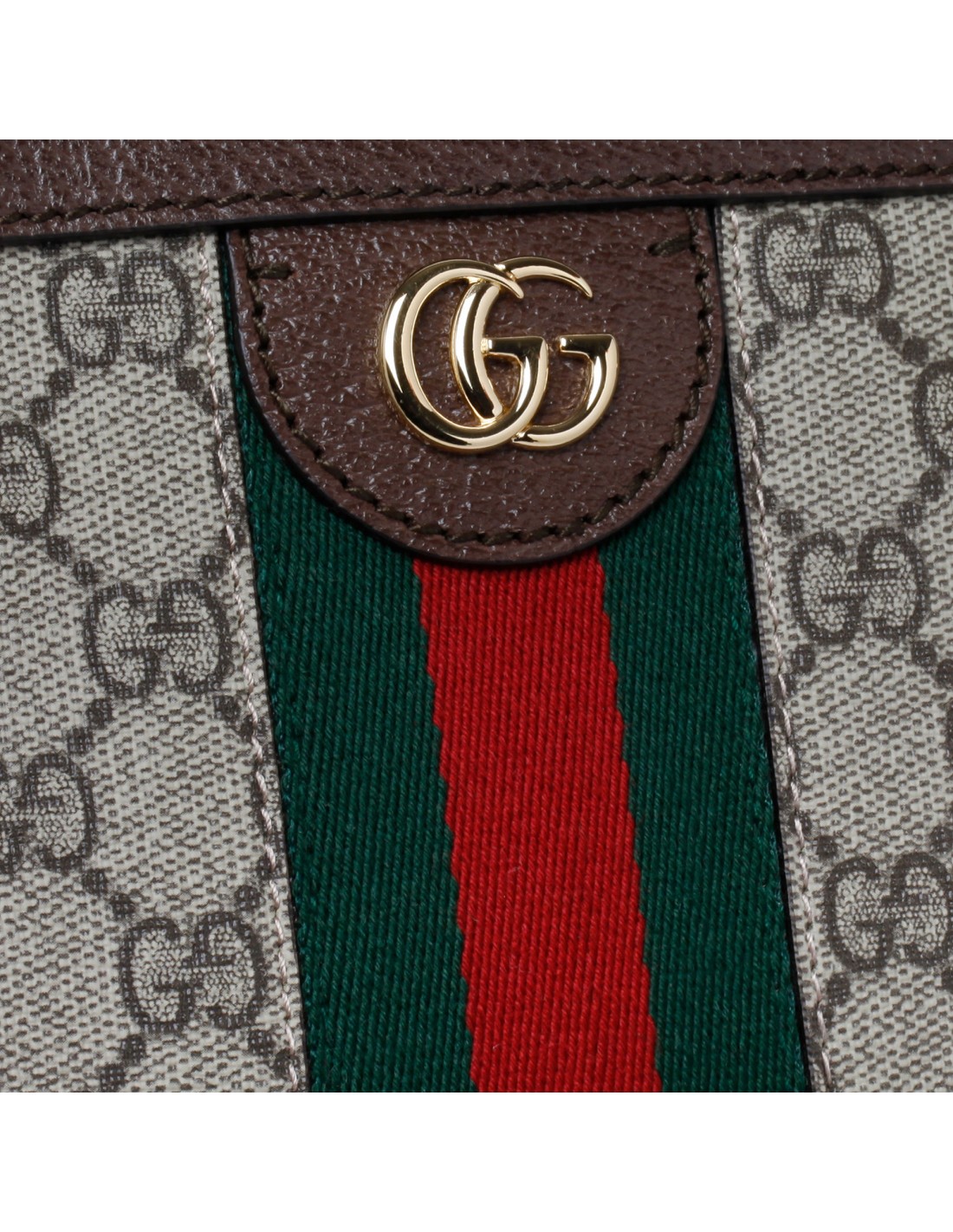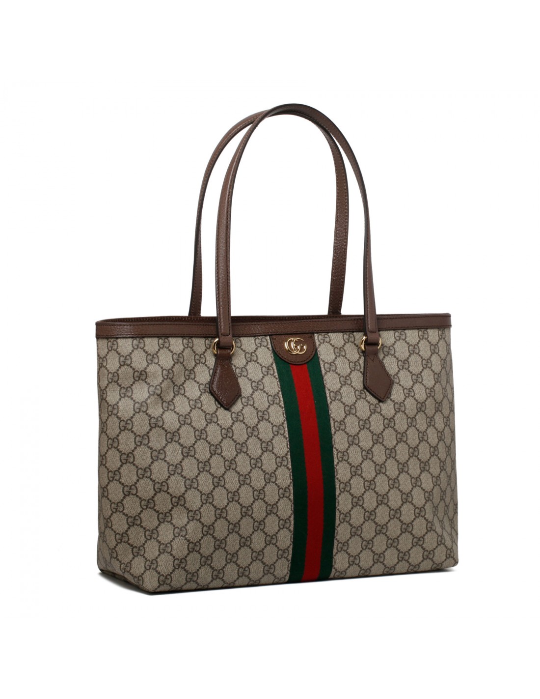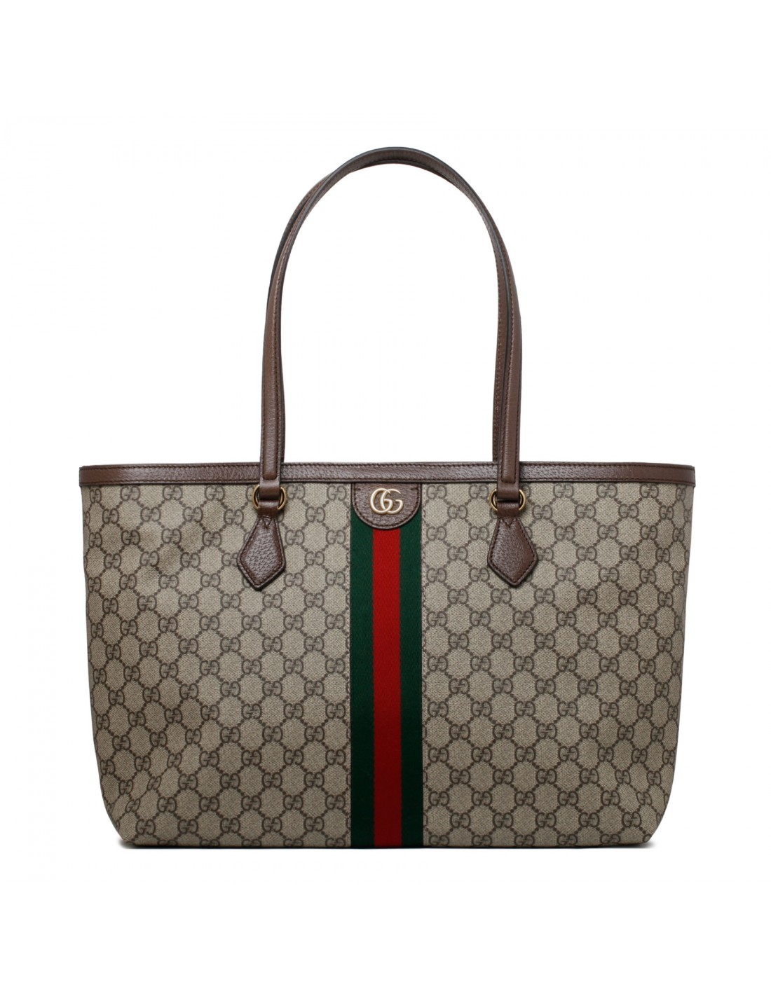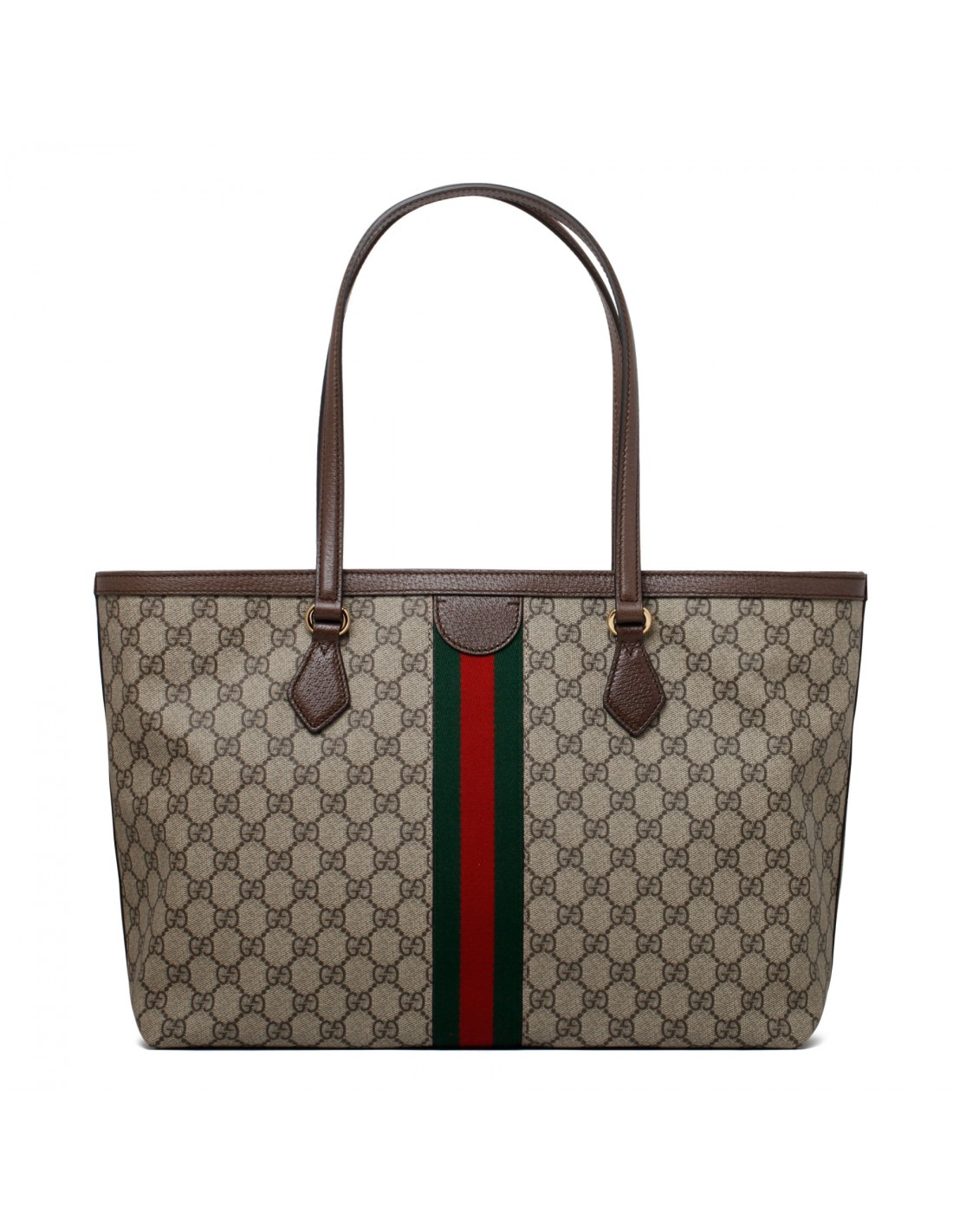 Beige and ebony Supreme canvas Ophidia medium tote bag from Gucci featuring GG motif, brown leather trims, green and red Web, gold-toned double G and hardware, double leather handles, magnetic snap closure, microfibre lining with a suede-like finish, internal zipped pocket.