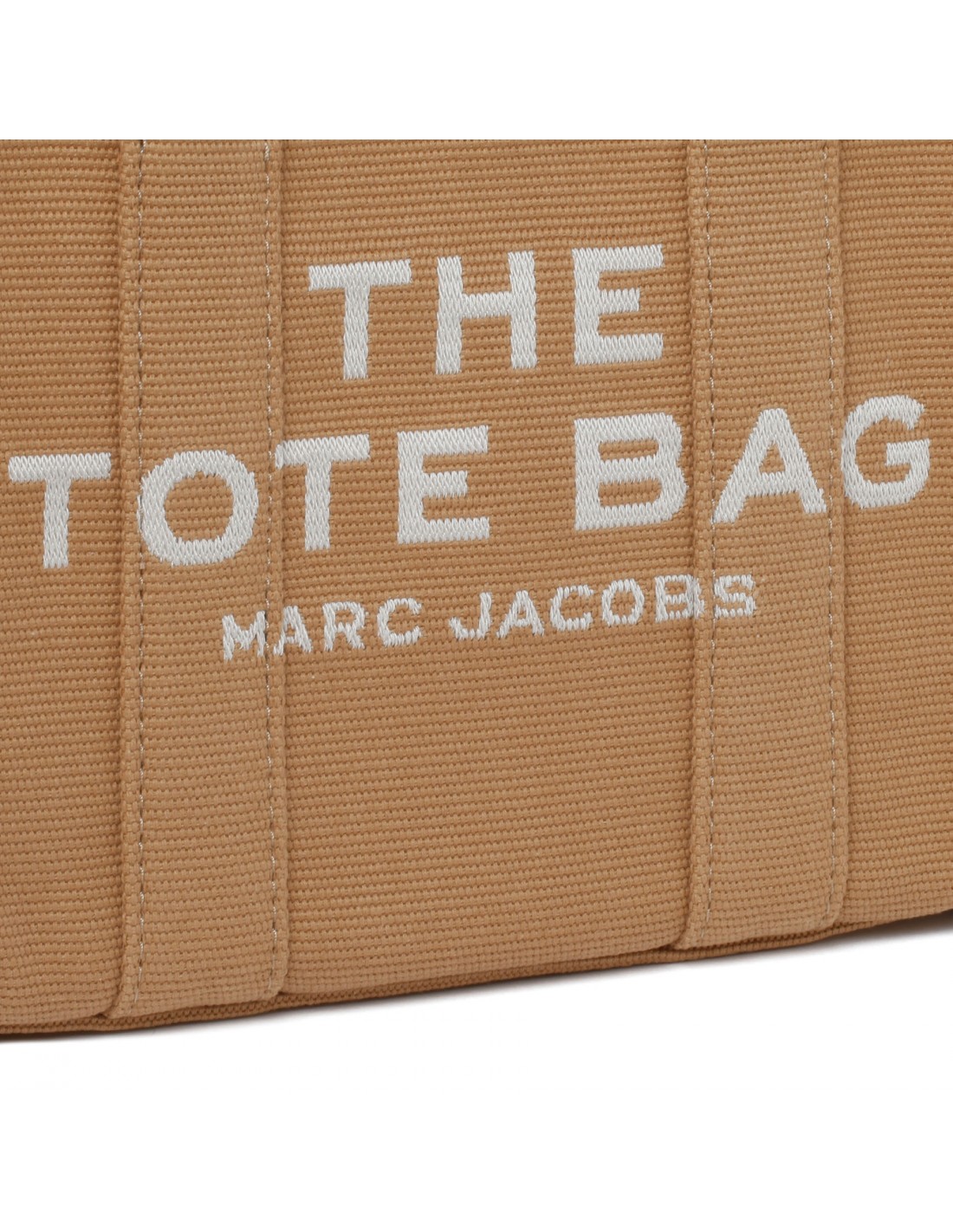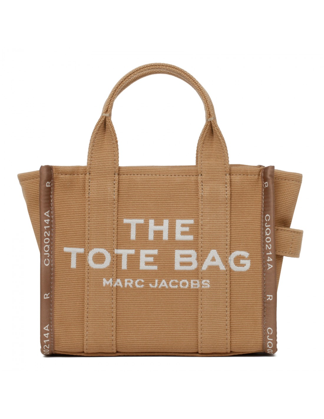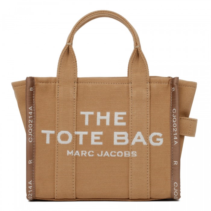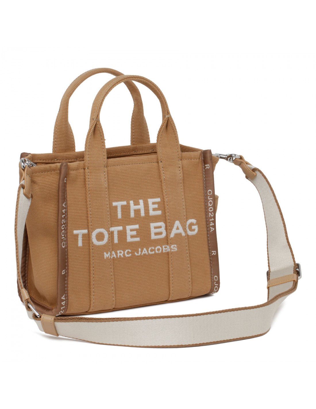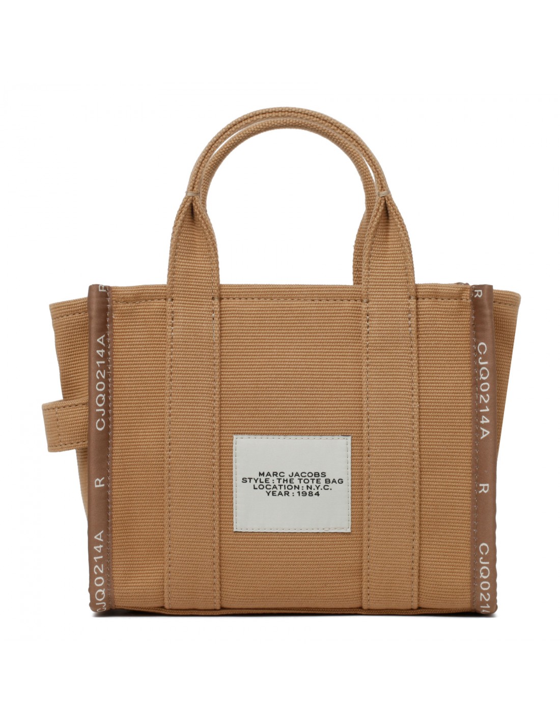 Camel hue canvas The Jacquard small tote bag from Marc Jacobs featuring jacquard trims and logo, small logo patch, zip fastening along top, detachable and adjustable webbing shoulder strap, canvas top handles.