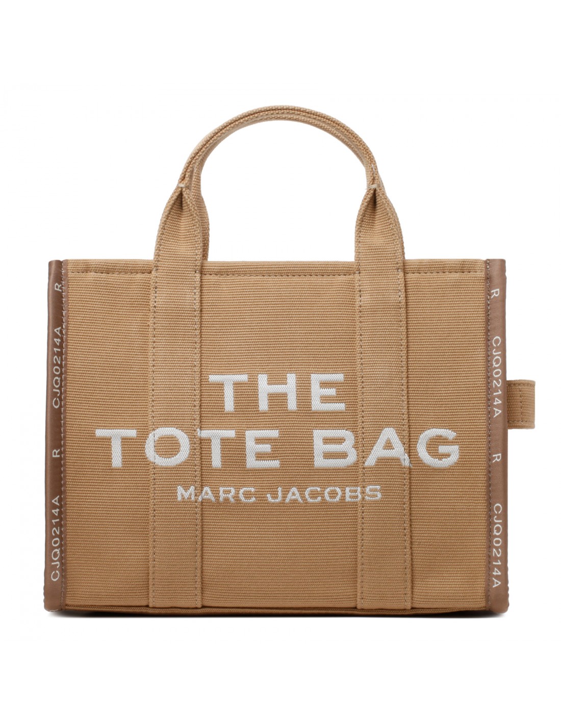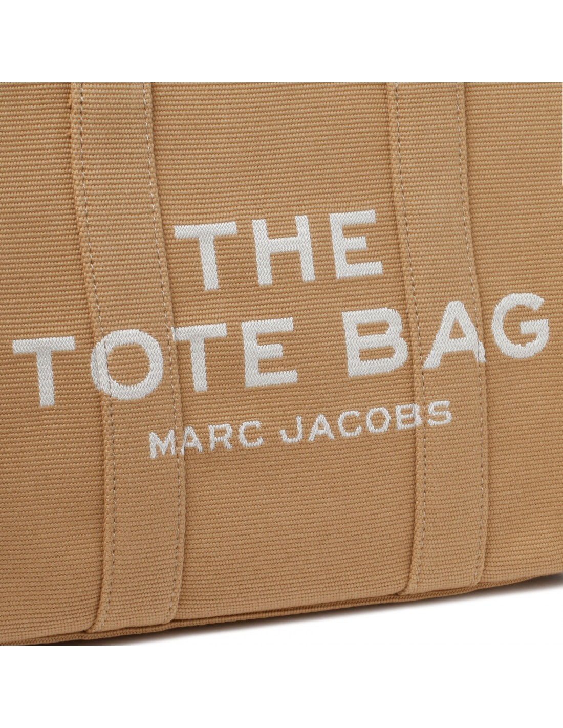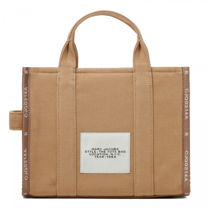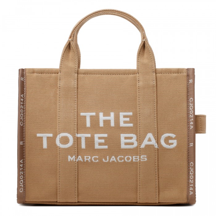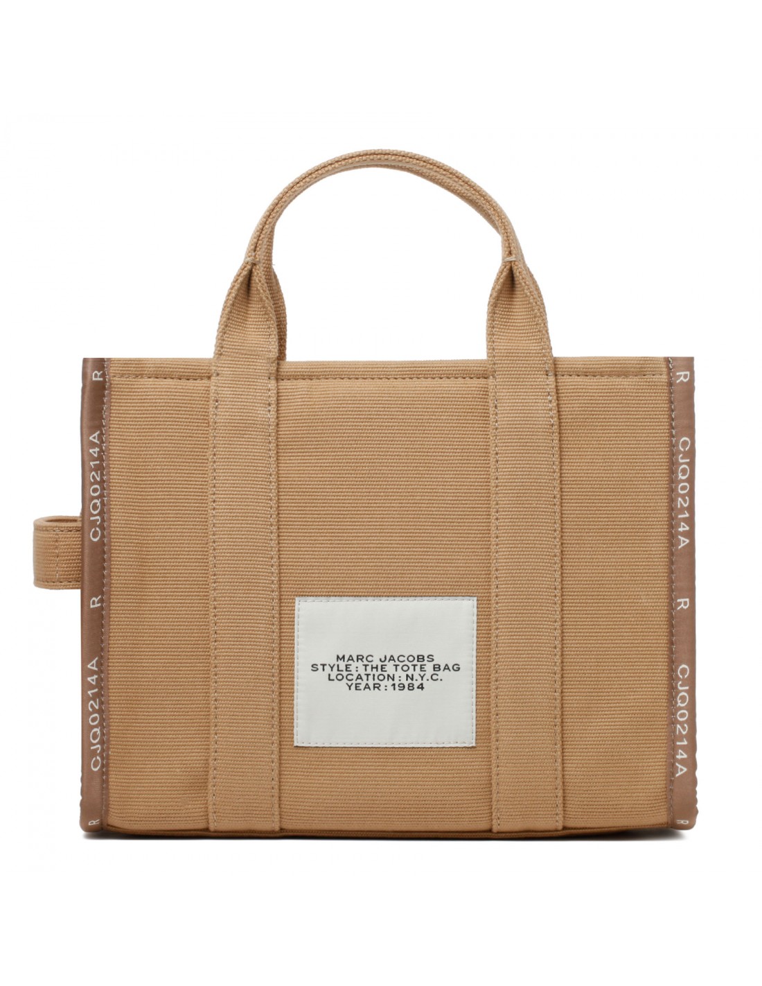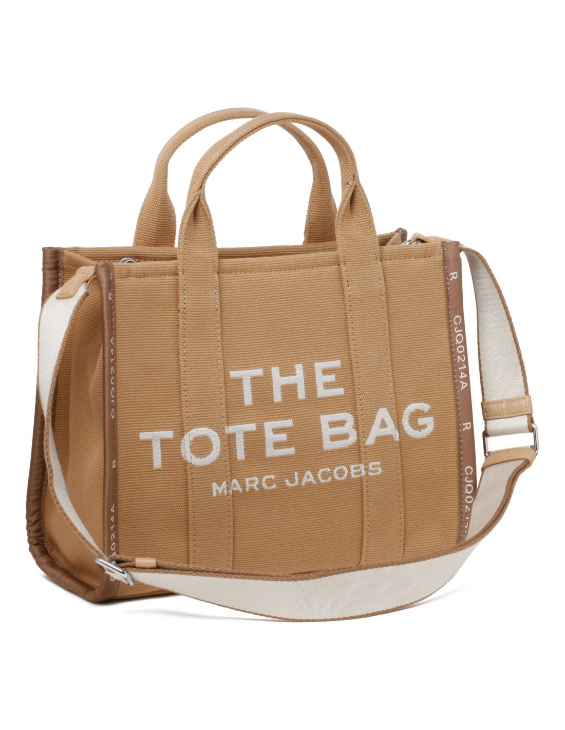 Camel canvas The jacquard medium tote bag from Marc Jacobs featuring jacquard trims and logo, small logo patch, zip fastening along top, detachable and adjustable webbing shoulder strap, canvas top handles, internal zipped and slip pockets.